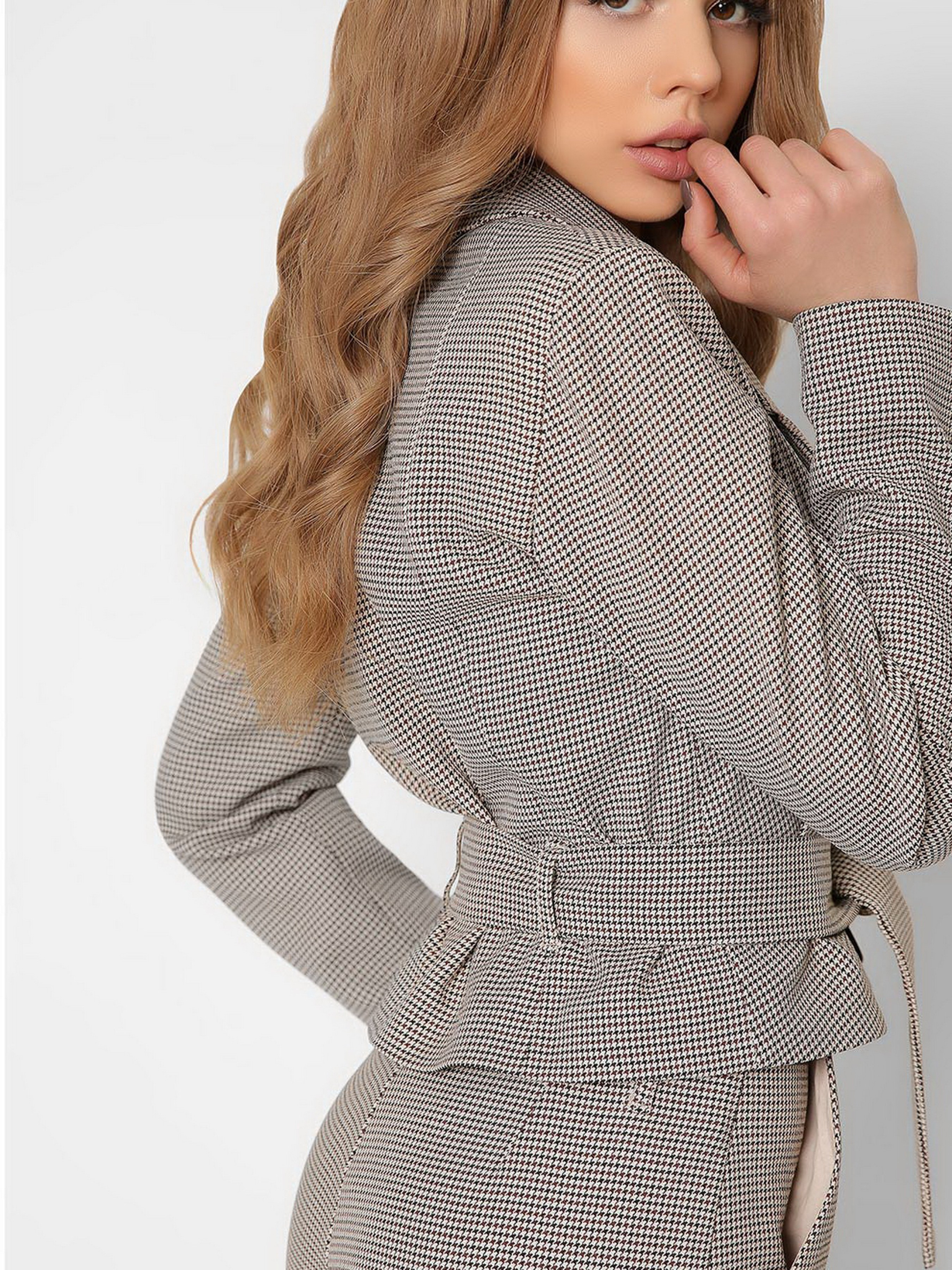 Стильний укорочений піджак. Модель має англійський комір з лацканами, довгий рукав і двобортну застібку на гудзики. Тканина декорована візерунком в гусячу лапку. Пояс йде в комплекті. Комбінуйте з білою блузкою і брюками в тон.