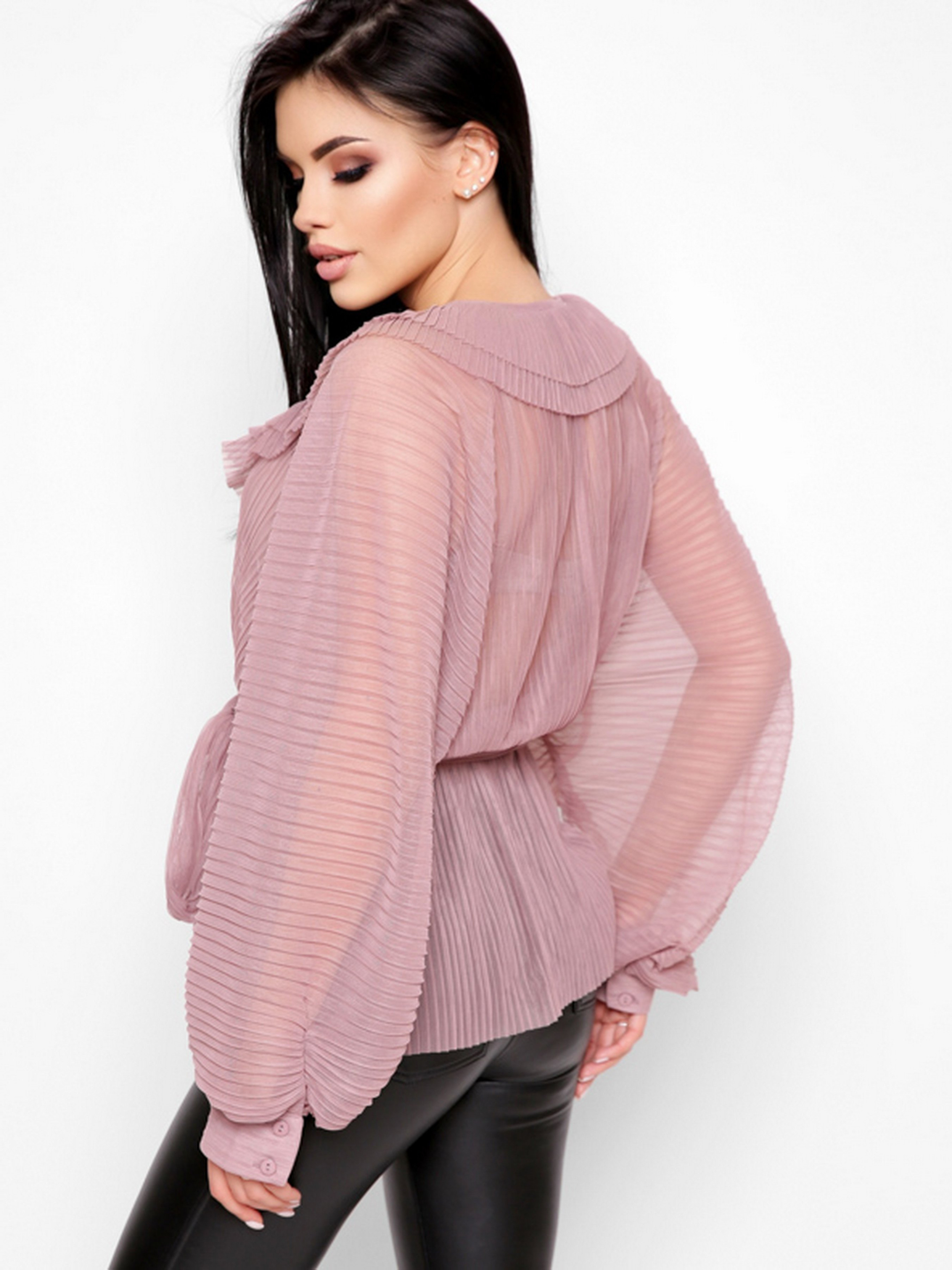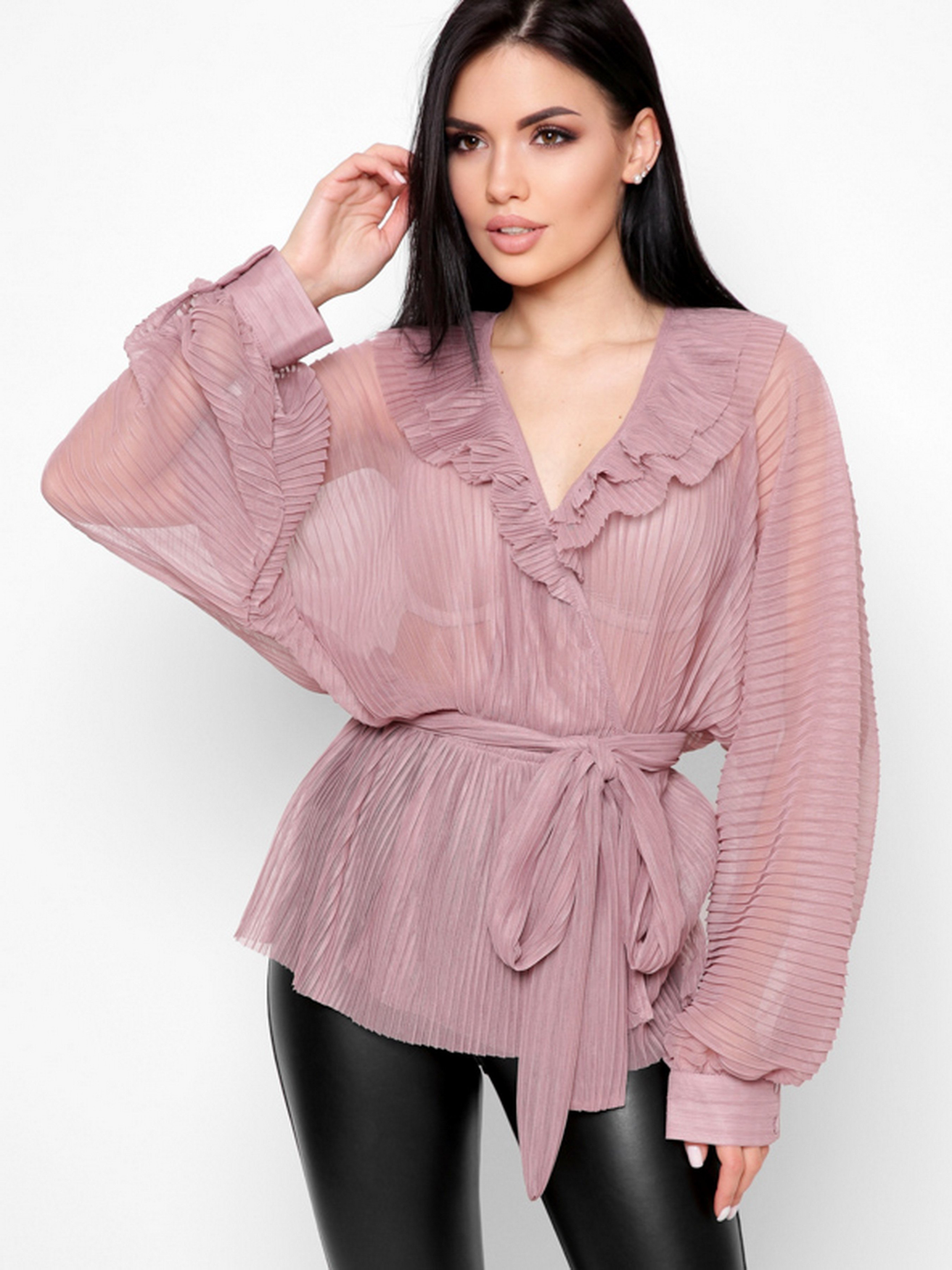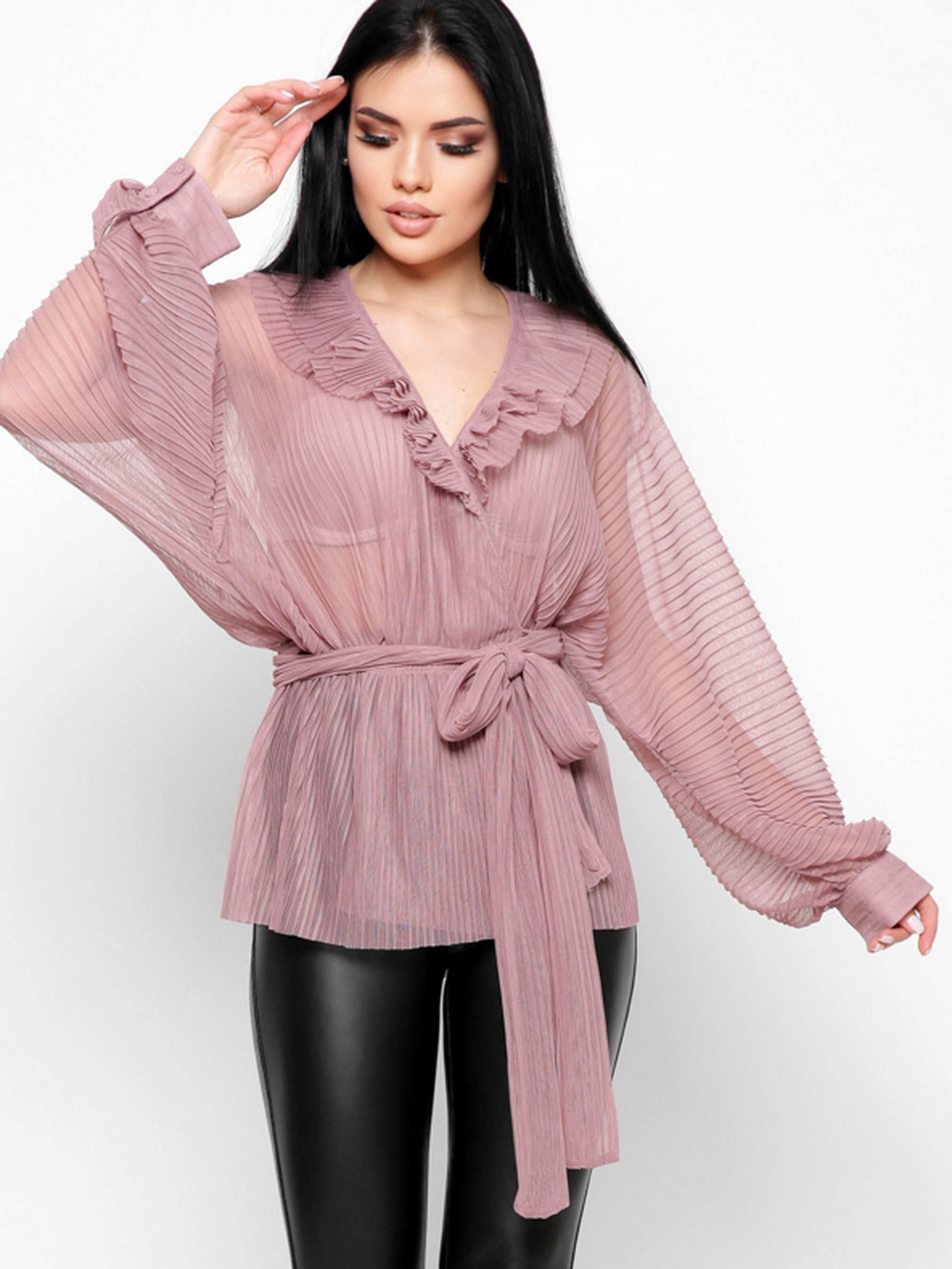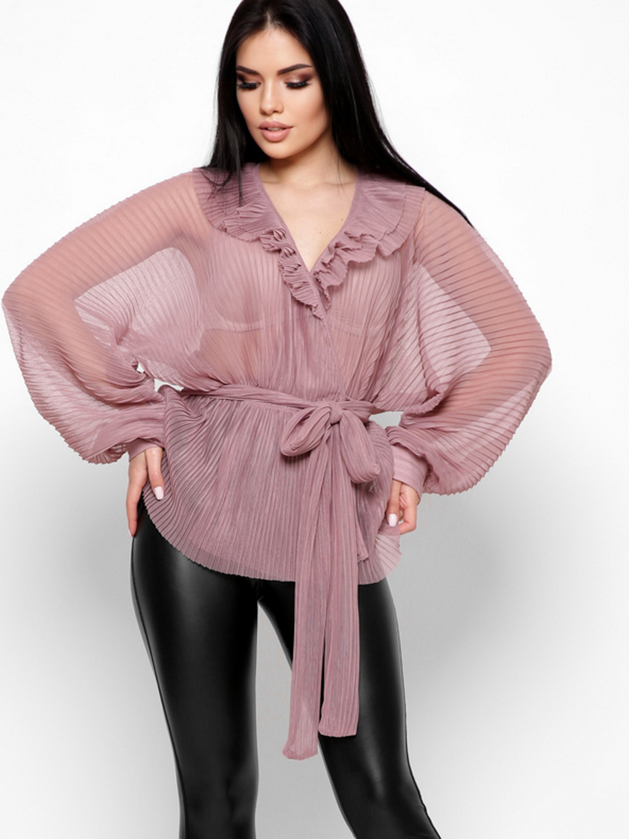 Ефектна блузка oversize. Деталі: прозорий матеріал, v-подібний виріз на запАх, об'ємний рукав «летюча миша» з манжетою на ґудзиках. За талії тонка еластична гумка. Застібка на зав'язках, яку можна обв'язати навколо талії або зробити бант.