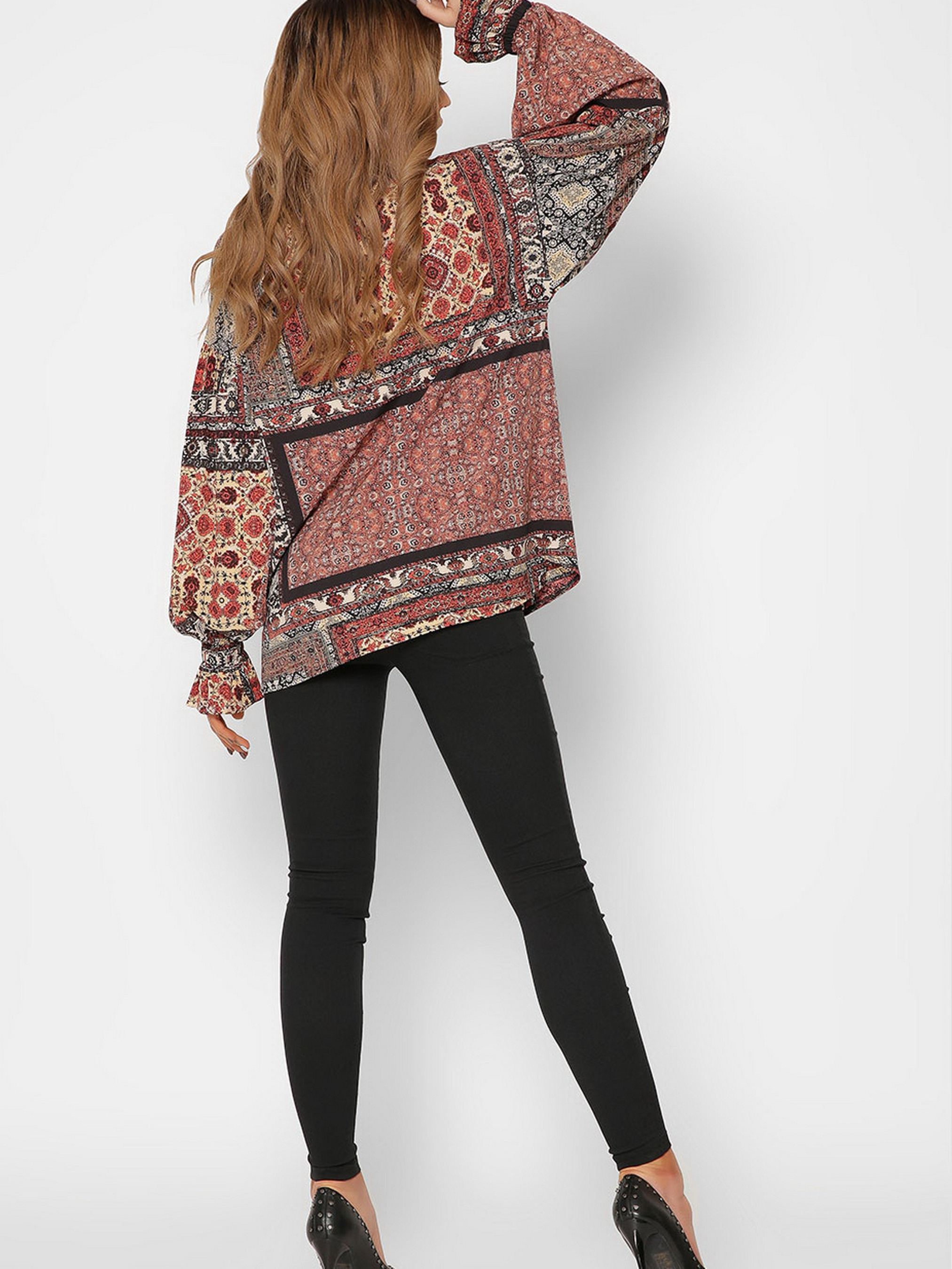Унікальна блузка від Carica в етно-стилі. Модель має фасон oversize, класичний стоячи-відкладний комір і широкий рукав з воланом на гумці. Особливість вироби, - яскравий орнамент по тканині. Спереду застібка на гудзики.