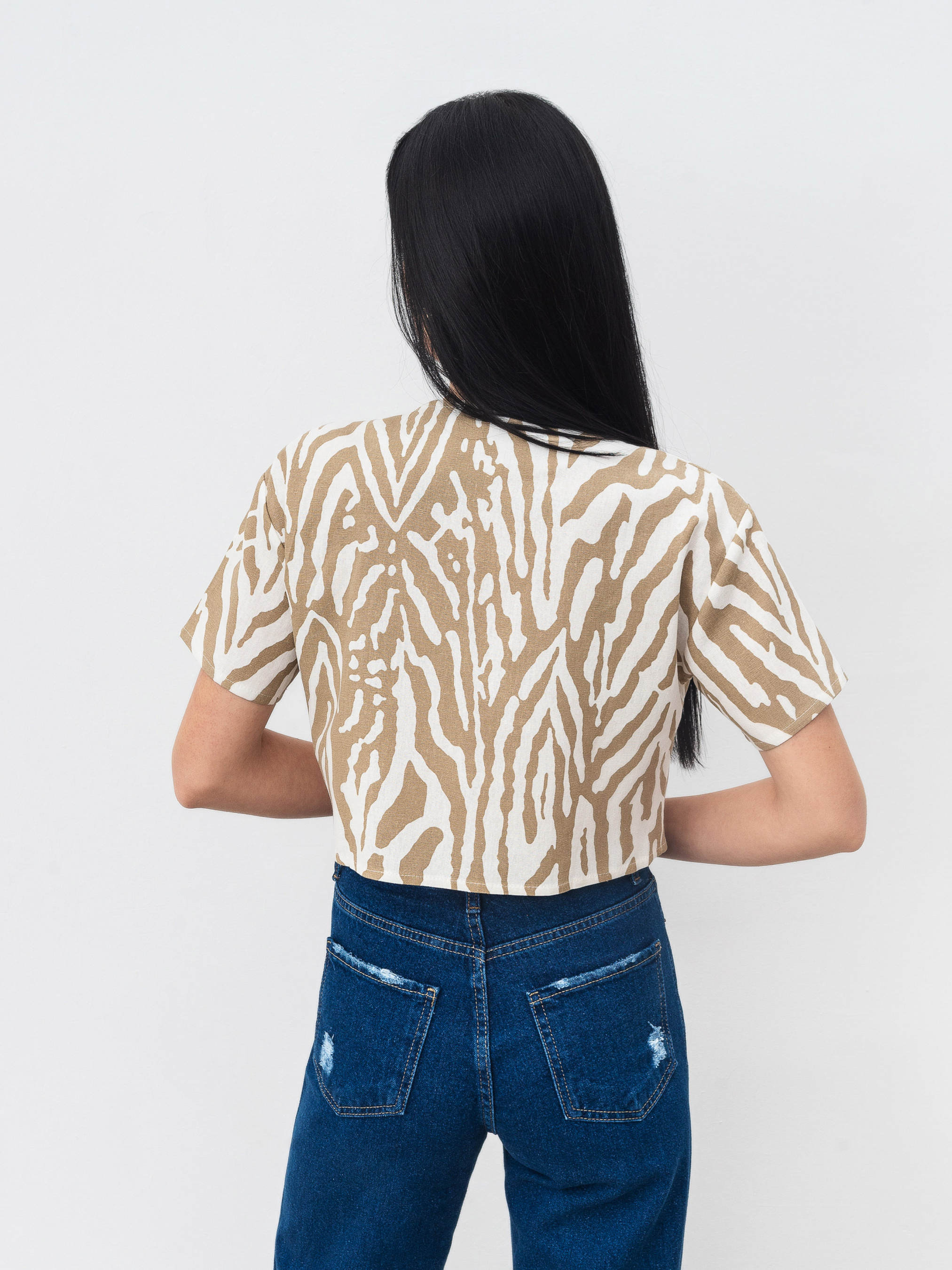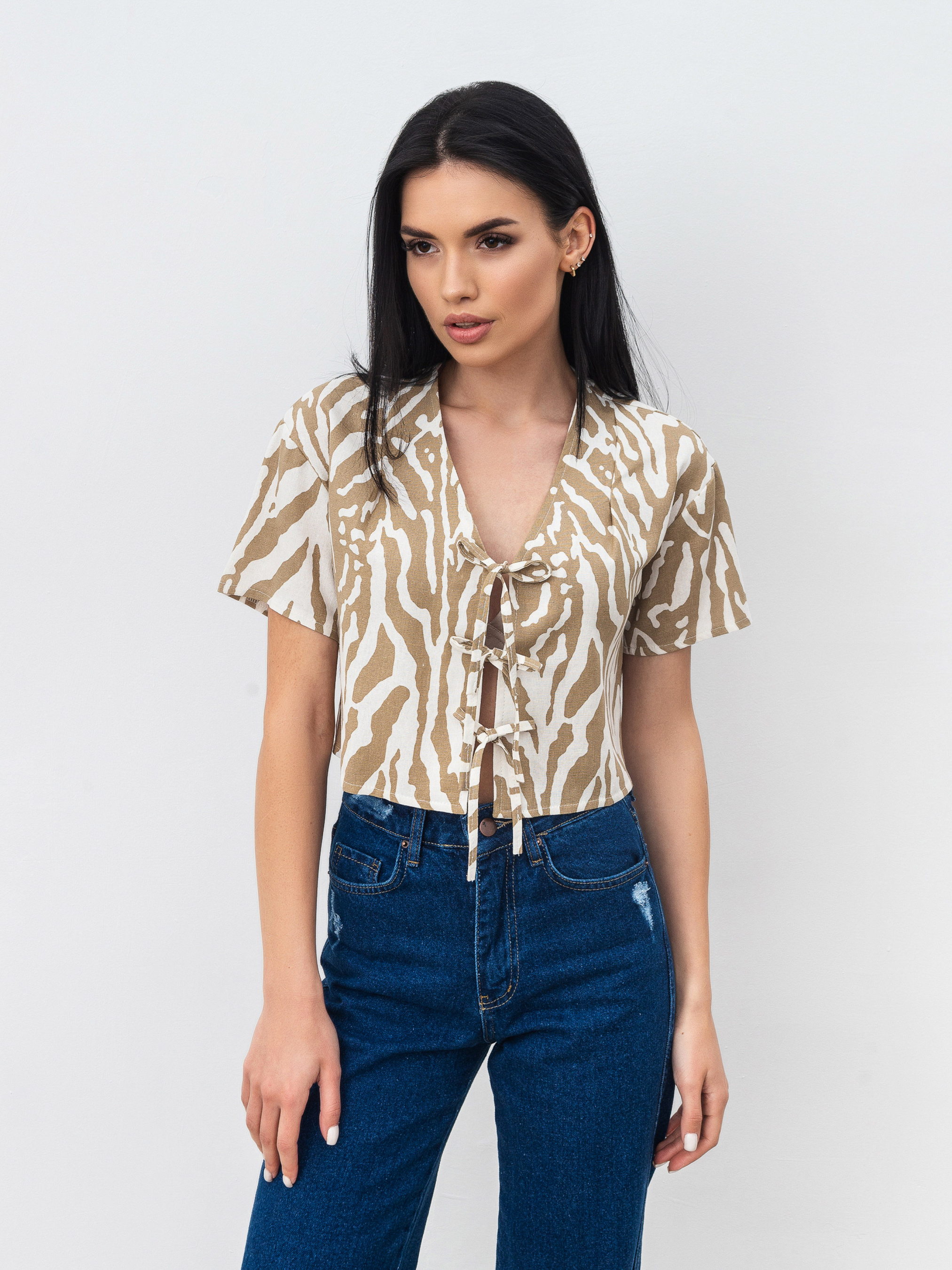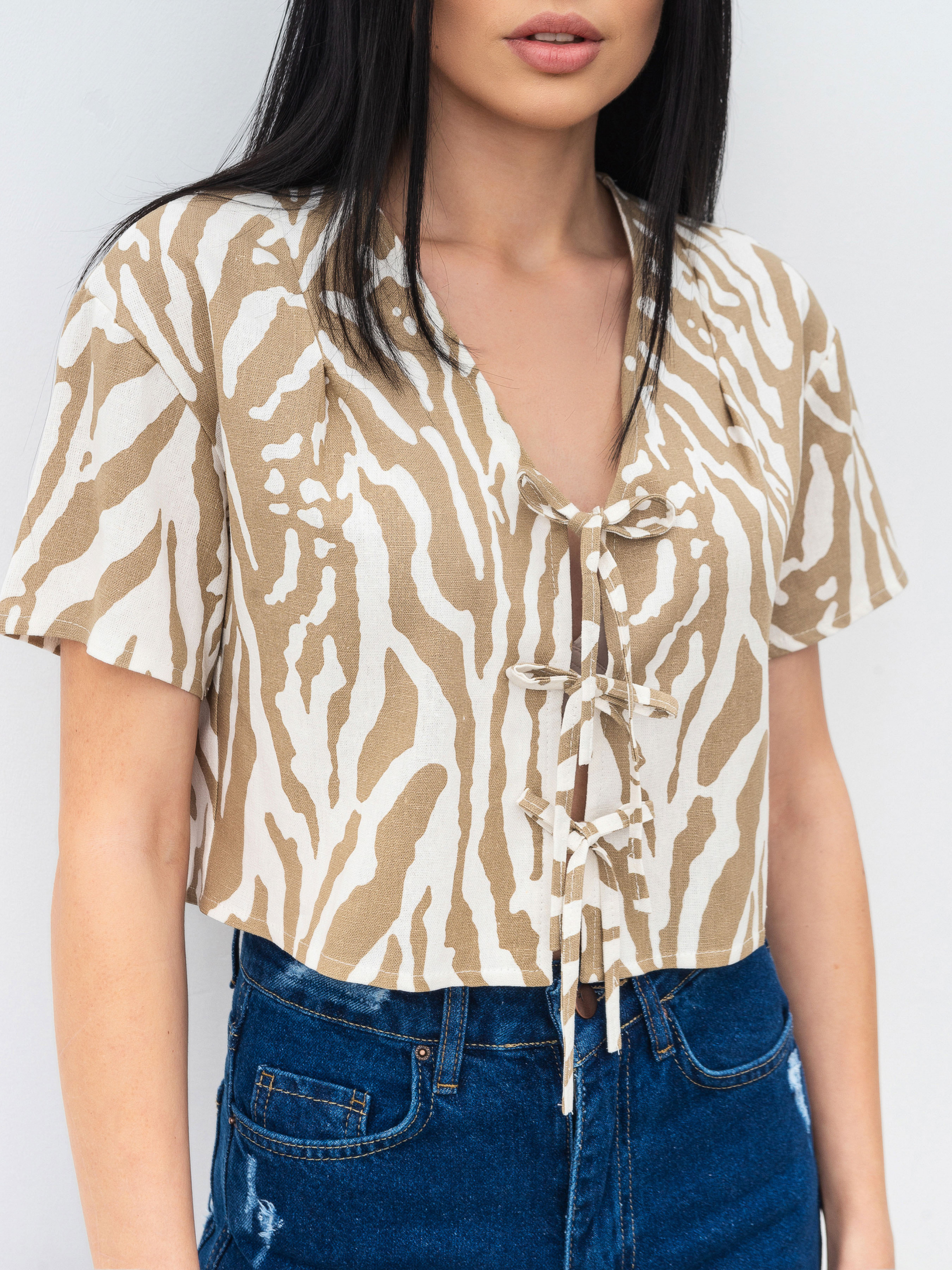 Вкорочена блуза з короткими рукавами. V-подібний виріз. Зав'язується на три шнурівки. Блуза чудово доповнить літній гардероб та стане ацентною річчю за рахунок принту матеріалу. XS-S Довжина по спині : 42 см Довжина рукава : 17 см Напівобхват грудей : 47 см Плечі : 45 см S-M Довжина по спині : 43 см Довжина рукава : 18 см Напівобхват грудей : 49 см Плечі : 46 см M-L Довжина по спині : 44 см Довжина рукава : 18 см Напівобхват грудей : 52 см Плечі : 47 см