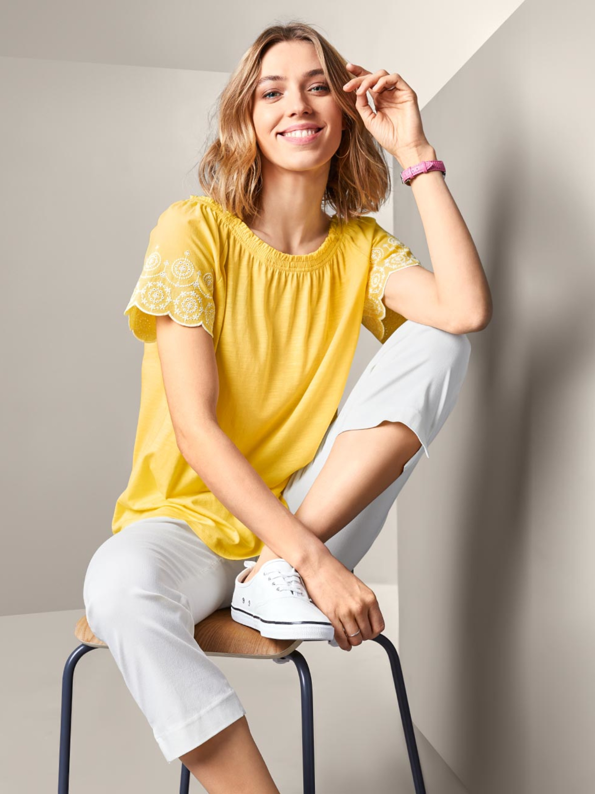 Ця блуза ідеально підходить для повсякденних літніх образів: завдяки гнучкому вирізу «Кармен» блузу можна носити як без плеча, так і з закритими плечима. Рукава мають фестончастий край і прикрашені декоративною вишивкою білого кольору. Змішана якість бавовни та модалу робить жіночу блузу приємно м’якою та забезпечує високий рівень комфорту. Склад: 50% бавовна (органічна), 50% модал (TENCEL™). Рукава 100% бавовна. Зверніть увагу, вказано розміри за Євро шкалою (Український розмір = Євро + 6) XS/32/34 євро розмір (40/42 український або XXS/XS європейський) ОГ: 74-77/78-81 см, ОТ: 61-63/64-66 см, ОБ: 84-87/88-91 см. S/36/38 євро розмір (44/46 український або S/М європейський) ОГ: 82-85/86-89 см, ОТ: 67-70/71-74 см, ОБ: 92-95/96-98 см. М/40/42 євро розмір (48/50 український або L/XL європейський) ОГ: 90-93/94-97 см, ОТ: 75-78/79-82 см, ОБ: 99-101/102-104 см. L/44/46 євро розмір (52/54 український або XXL/XXXL європейський) ОГ: 98-102/103-107 см, ОТ: 83-87/88-93 см, ОБ: 105-108/109-112 см. XL/48/50 євро розмір (56/58 український або 4XL/5XL європейський) ОГ: 108-113/114-119 см, ОТ: 94-99/100-106 см, ОБ: 113-116/117-121 см. Одяг бренду TCM Tchibo практично весь без паперових етикеток, за рідкісним винятком, і зі зрізаними частково або повністю внутрішніми бірками і ярликами зі складом тканини та іншими даними.