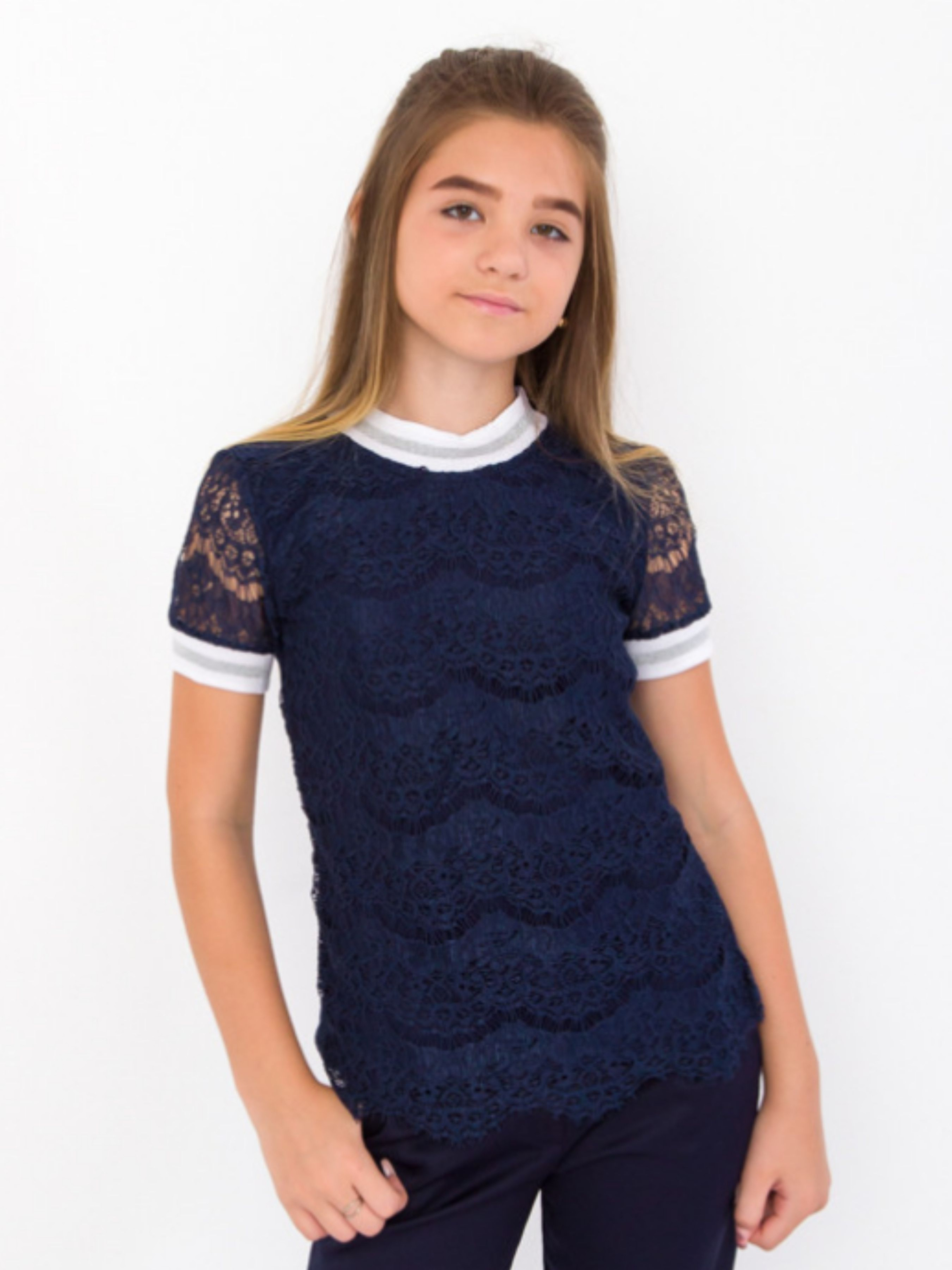 Полотно: фулікрамерживо Зріст: 122 146 158 164 Стильна блуза стане найулюбленішим вбранням вашої дівчинки. Її творцем є український бренд Носи Своє який завоював довіру покупців своїми безкомпромісною якістю і неординарними дизайнерськими рішеннями. Цей товар не став винятком. Легка і приємна до тіла тканина стала основою для створення модної блузи з оригінальними і витонченими елементами у вигляді мереживного переду і стильних довязів на мереживних рукавах. Простий крій моделі забезпечує абсолютний комфорт що не сковує рухів дарує свободу і легкість. Склад полотна змішаний але переважна кількість бавовни (95%) гарантує хороші повітропроникність і гігроскопічність а додаткові 5% еластану надають матеріалу міцність еластичність і довговічність. Дизайн блузи досить мінімалістичний і акуратний. Напівкруглий виріз горловини створить комфорт під час надягання і носіння. Догляд: допускається ручне прання при Т не вище 30 ° С з використанням неагресивних засобів для прання. При полосканні краще використовувати кондиціонер. Прасування праскою при 110 ° С