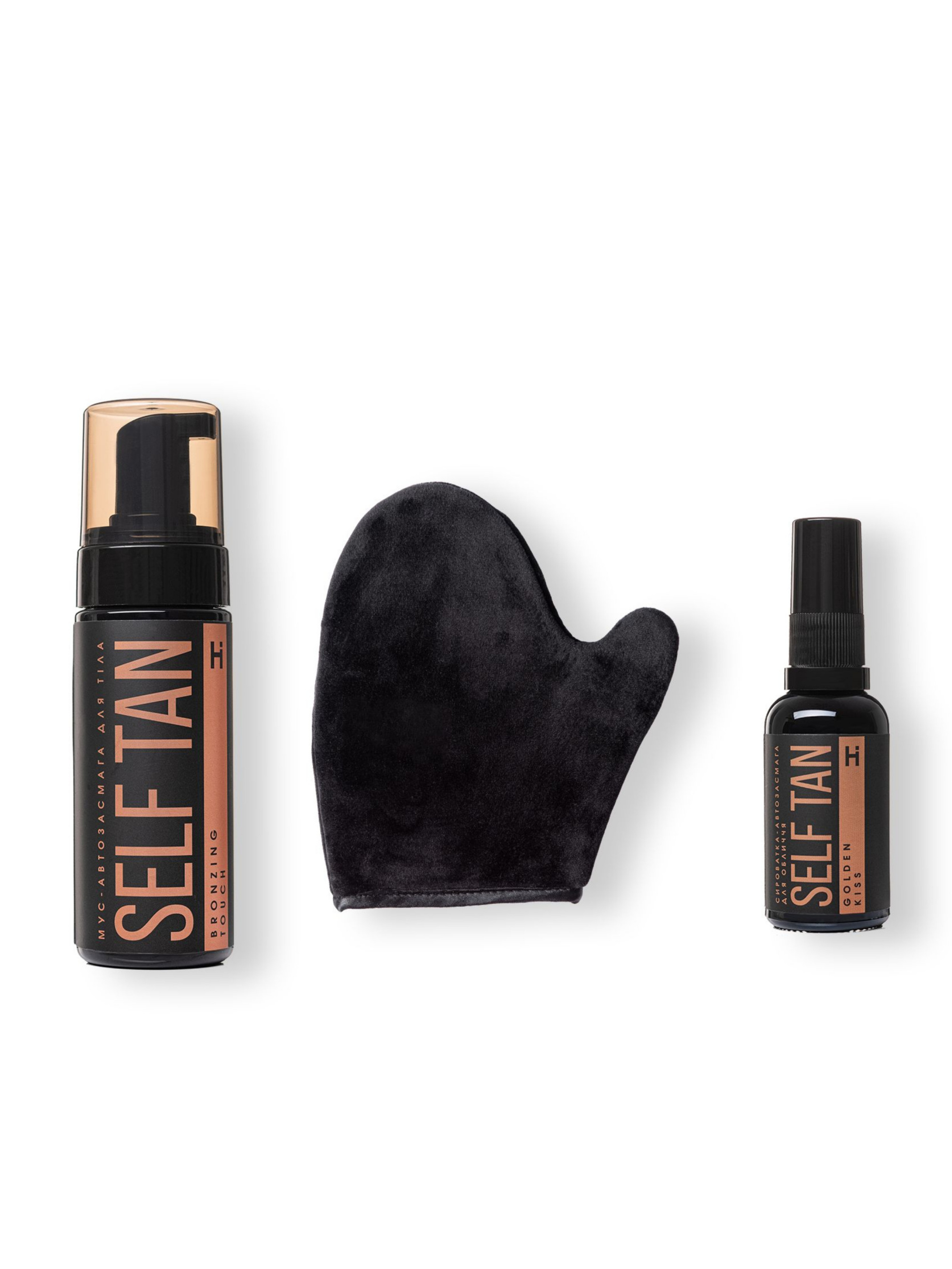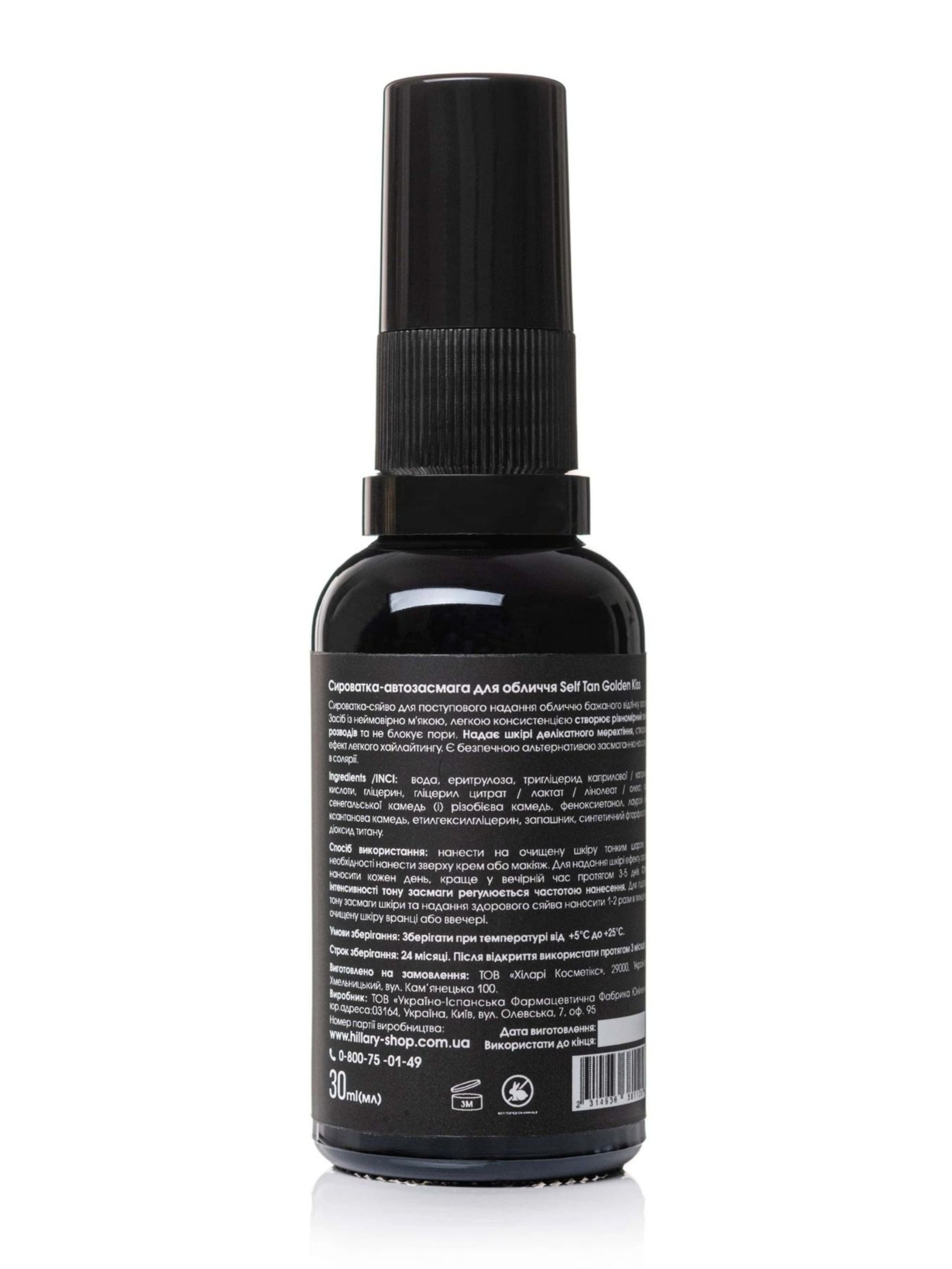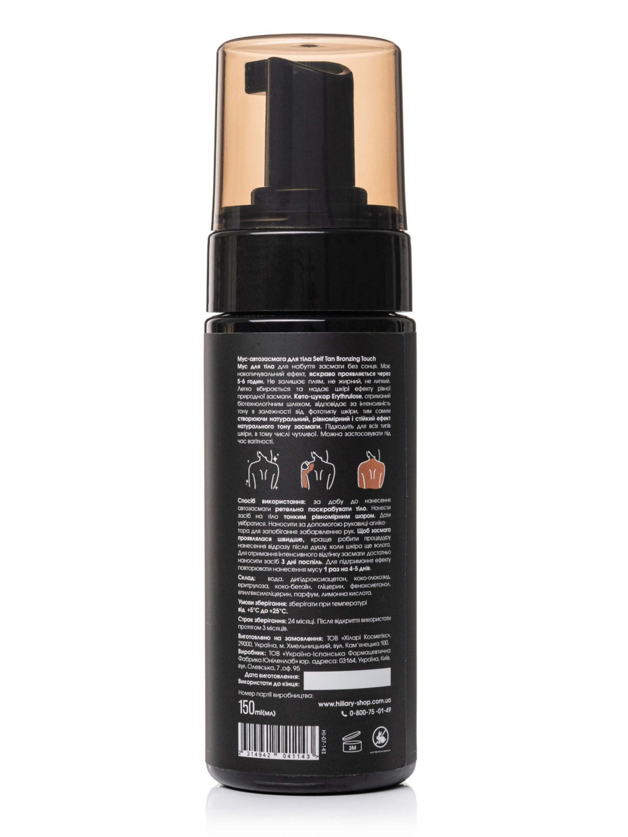 Мус для тіла призначений для набуття засмаги без сонця. Має накопичувальний ефект, яскраво проявляється через 5-6 годин. Не залишає плям, не жирний, не липкий. Легко вбирається та надає шкірі ефекту рівної природної засмаги. Комбінація дигідроксіацетону та кето-цукру еритрулози, отриманих біотехнологічним шляхом, відповідають за інтенсивність тону в залежності від фототипу шкіри, тим самим створюючи натуральний, рівномірний і стійкий ефект натурального тону засмаги. Сироватка-сяйво для поступового надання обличчю бажаного відтінку засмаги. Засіб із неймовірно м'якою, легкою консистенцією створює рівномірний тон без розводів та не блокує пори. Надає шкірі делікатного мерехтіння, створюючи ефект легкого хайлайтингу. Є безпечною альтернативою засмаганню на сонці чи в солярії. Рукавиця-аплікатор для автозасмаги дозволяє наносити засіб якісно та рівномірно, допоможе регулювати інтенсивність та ступінь нанесення засобу, м’яка та приємна до тіла, не дозволяє косметичному засобу просочитися крізь тканину на руку, захищає руки та нігті від забарвлення, може використовуватися для нанесення інших доглядових засобів. До набору входять: Мус-автозасмага для тіла Hillary Self Tan Bronzing Touch, 150 мл; Aqua, Dihydroxyacetone, Coco-Glucoside, Erythrulose, Glycerin, Phenoxyethanol, Ethylhexylglycerin, Parfum, Citric Acid, Hexyl cinnamal, Linalool, Citronellol, Alpha-isomethyl ionone. Сироватка-автозасмага для обличчя Hillary Self Tan Golden Kiss, 30 мл. Aqua, Erythrulose, Caprylic / Capric Triglyceride, Glycerin, Glyceryl Citrate/ Lactate/Linoleate/Oleate, Acacia Senegal gum (and) Rhizobian Gum, Phenoxyethanol, Lauroyl Lysine, Xanthan Gum, Ethylhexylglycerin, Parfum, Synthetic Fluorphlogopite (and) Titanium Dioxide Рукавиця-аплікатор для шиммера, автозасмаги. Бавовняний велюр, поролон, плащівка Спосіб застосування: За добу до нанесення автозасмаги для тіла ретельно поскрабуйте тіло. Нанесіть засіб на тіло тонким рівномірним шаром. Дайте увібратися. Наносьте за допомогою рукавиці-аплікатора для запобігання забарвленню рук. Щоб засмага проявлялася швидше, краще робити процедуру нанесення відразу після душу, коли шкіра ще волога. Для отримання інтенсивного відтінку засмаги достатньо наносити засіб 3 дні поспіль. Для підтримання ефекту повторювати нанесення мусу 1 раз на 4-5 днів. Надіньте рукавицю на руку. Нанесіть на неї необхідну кількість засобу. Втирайте м'яко і рівномірно, круговими рухами в шкіру тіла, рук, ніг. Після використання попрати аплікатор руками або в пральній машині з використанням мила чи засобу для прання. Сушити на теплій батареї або природним способом. Не застосовувати відбілювач і хімчистку. Нанесіть сироватку-автозасмагу на очищену шкіру обличчя тонким шаром, при необхідності нанесіть зверху крем або макіяж. Для надання шкірі ефекту засмаги наносити кожен день, краще у вечірній час протягом 3-5 днів. Ступінь інтенсивності тону засмаги регулюється частотою нанесення. Для підтримки тону засмаги шкіри та надання здорового сяйва наносити 1-2 рази в тиждень на очищену шкіру вранці або ввечері. Застереження: Натуральна косметика не є гіпоалергенною. За 24 години до застосування проведіть алергопробу на згині ліктя.