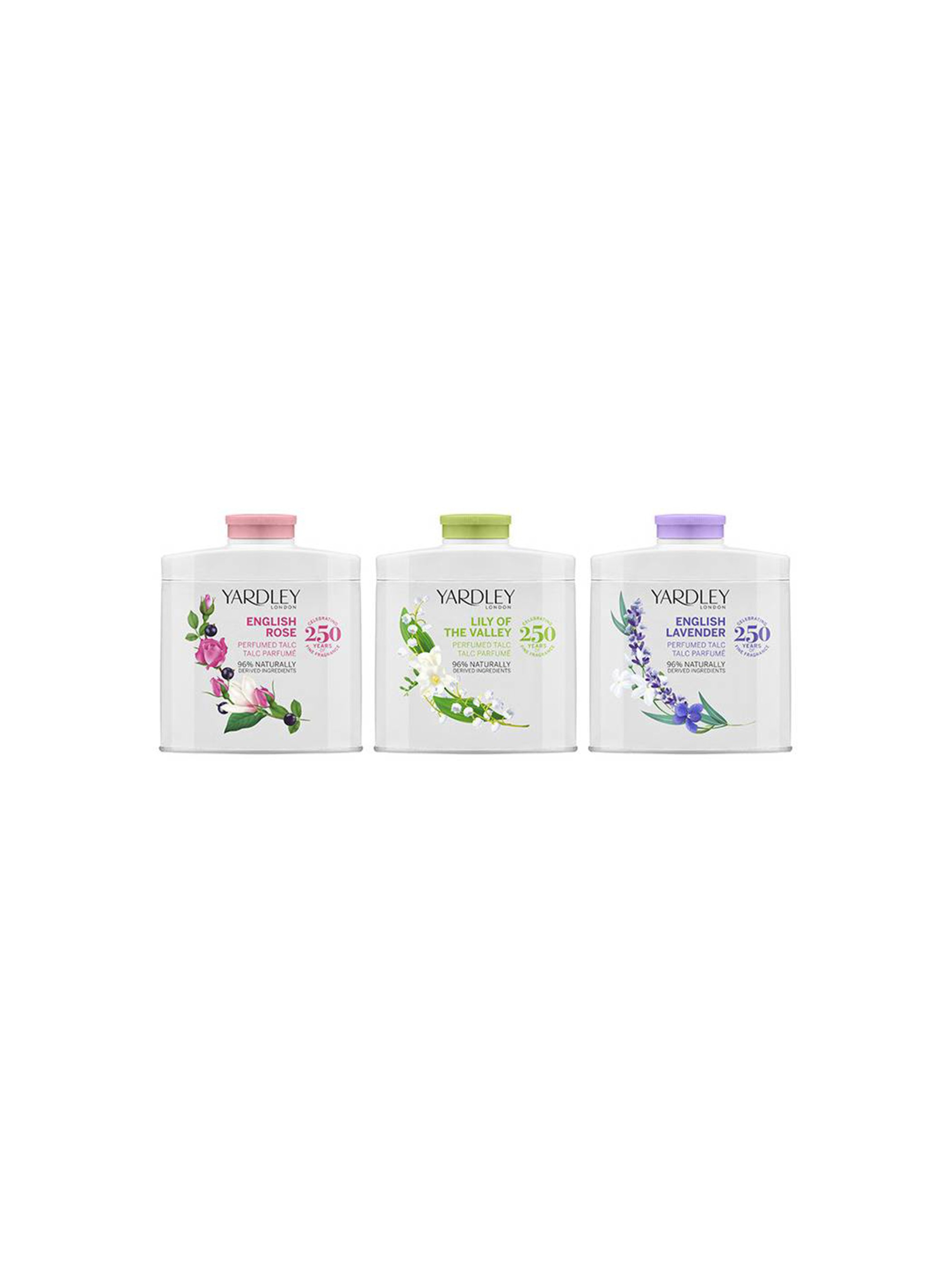 Набір парфумованого тальку для догляду за шкірою тіла з вишуканими, свіжими квітковими ароматами. Тальк для тіла швидко абсорбує зайву вологу, не пересушує шкіру, залишаючи її гладкою і м'якою. Використовувати тальки можна на різних ділянках тіла для профілактики попрілостей і запобігання пітливості. При нанесенні на ділянки в місцях підвищеного тертя тальк захищає шкіру від появи подразнень і почервоніння. Він може стати чудовою альтернативою дезодоранту для ніг і тіла. Парфумерна композиція замінить туалетну воду в ситуаціях, коли потрібен легкий і свіжий аромат. Його можна нанести на певні ділянки тіла після душу для легкого квіткового шлейфу. Має текстуру пудри і легко наноситься. У наборі 3 тальку по 50 г. 1. Тальк Конвалія – освіжаючий квітково-фруктовий аромат. 2. Тальк Троянда – квіткова композиція з легкими цитрусовими нотами. 3. Тальк Лаванда – елегантний квітковий аромат з деревними нотами. Така комбінація тальку буде чудовим подарунком для дівчат та жінок, які ведуть активний спосіб життя та стежать за собою. Компанія Yardley London заснована 250 років тому. Сьогодні відома як виробник розкішних ароматів і догляду для тіла в усьому світі. Має 6 нагород Королівського двору.