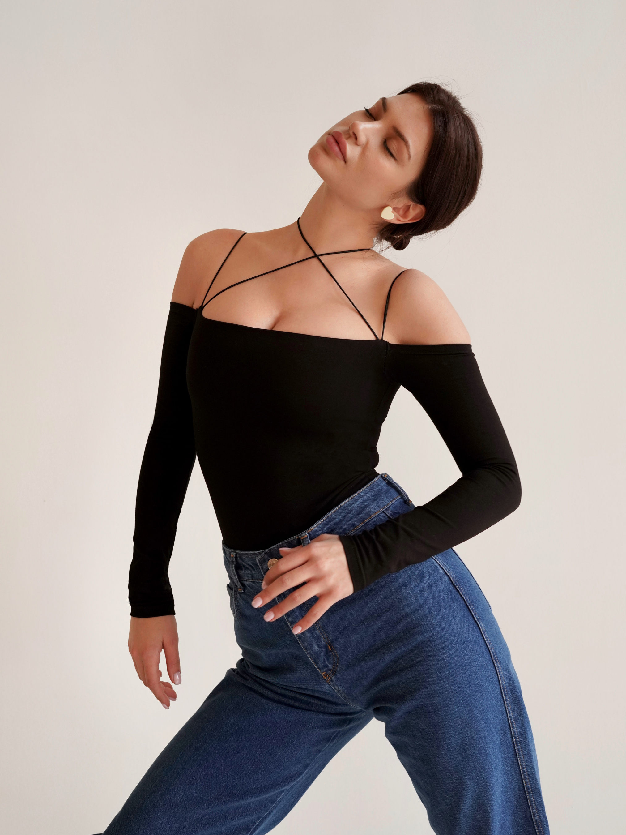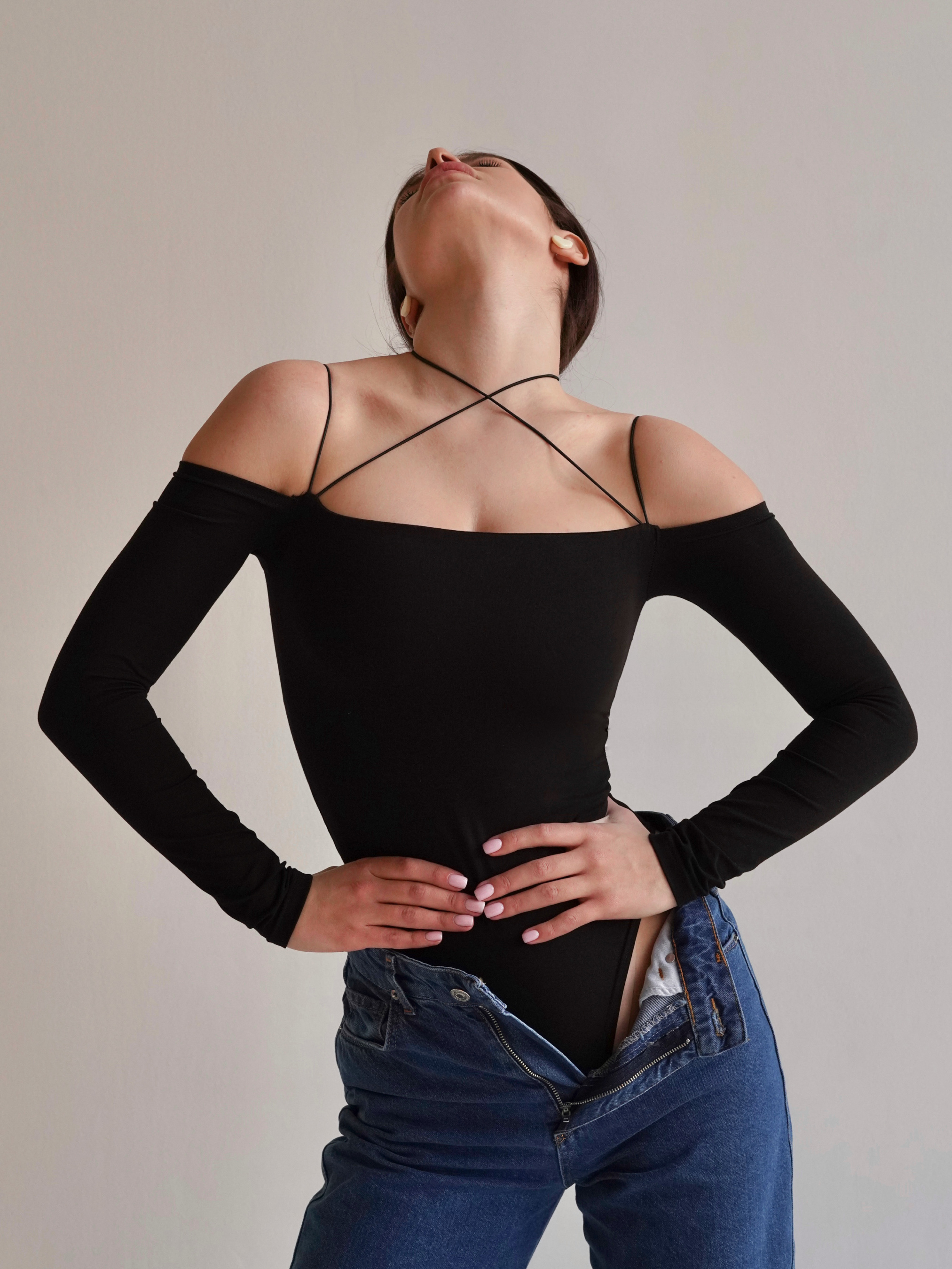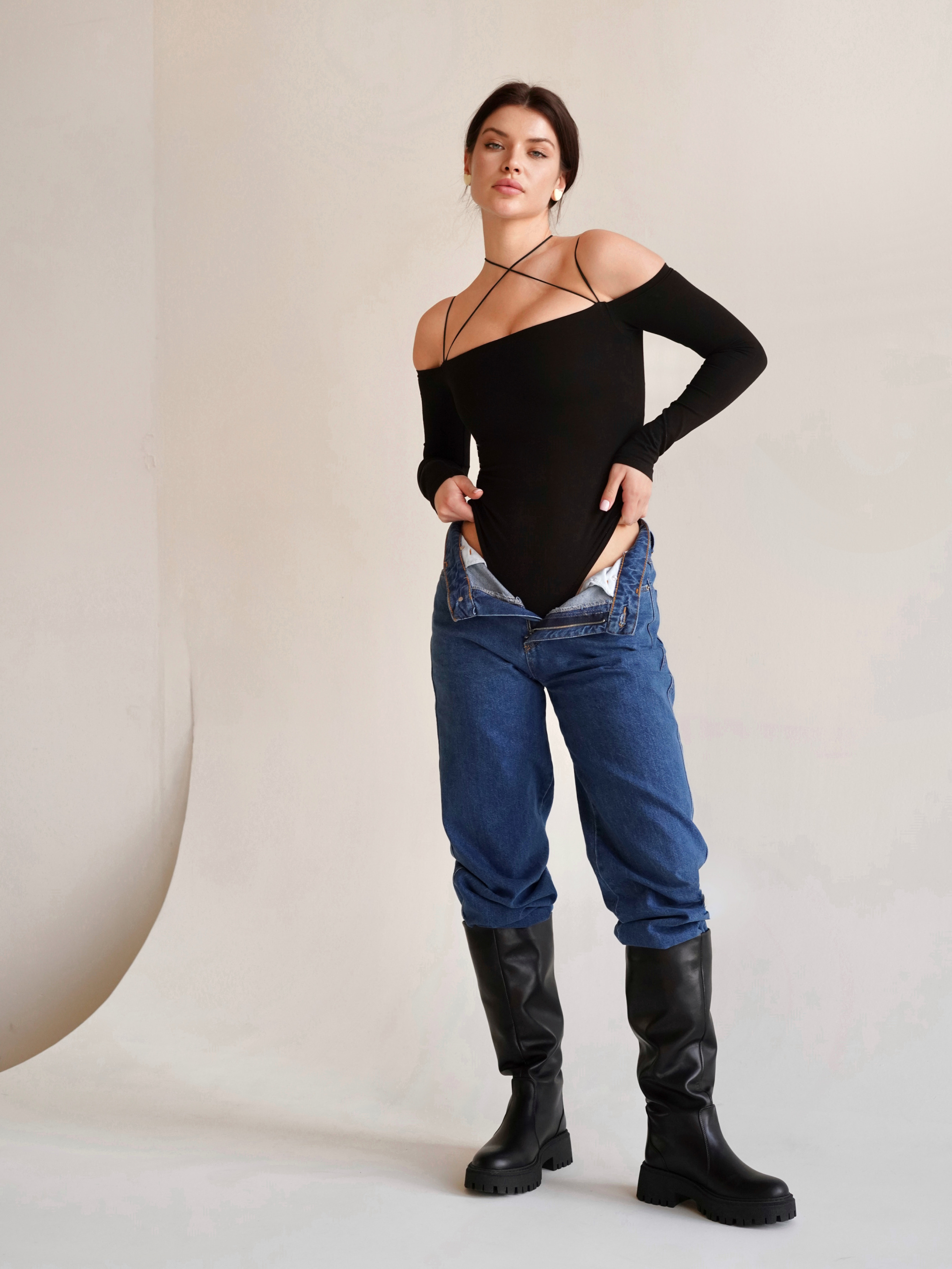 Витончене боді з відкритими плечима з м'якої та приємної до тіла тканини. Добре тягнеться за рахунок еластану у складі (+10 см до даних, що зазначені у розмірній сітці). Не парить. Завдяки декоративним резинкам боді підходить як для повсякденних образів (наприклад, із джинсами або класичними брюками), так і для святкових (якщо скомбінувати його зі спідницею). Добре тримається на тілі, не сповзає. Знизу застібається на кнопки. Завдяки якісній обробці швів виріб прослужить не один сезон. Xs