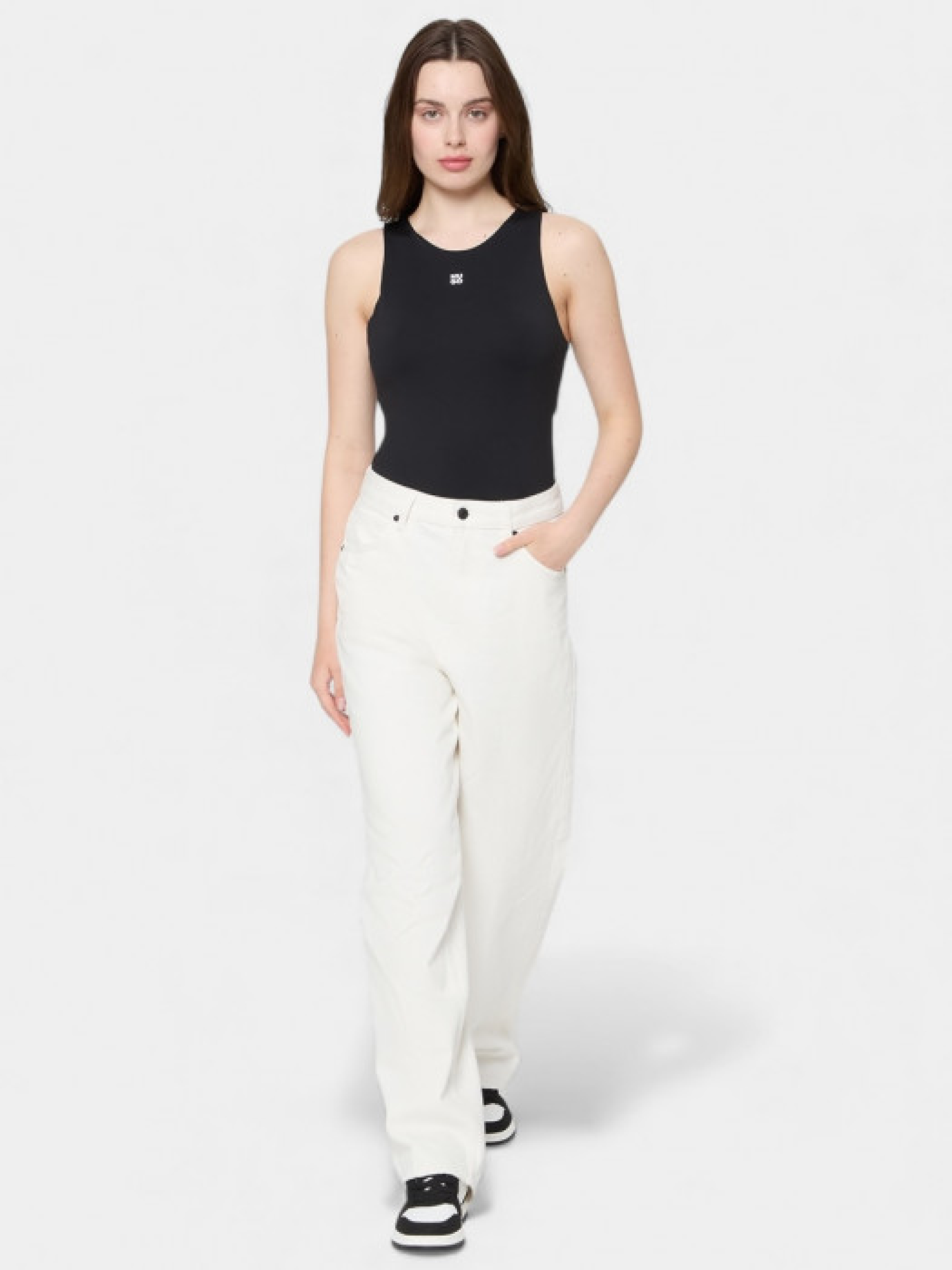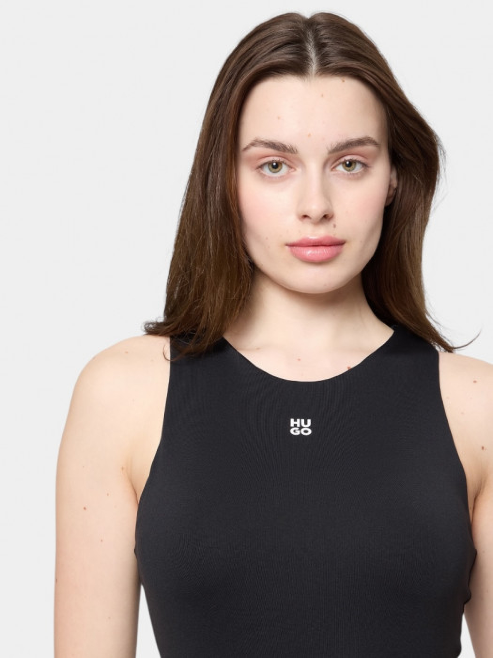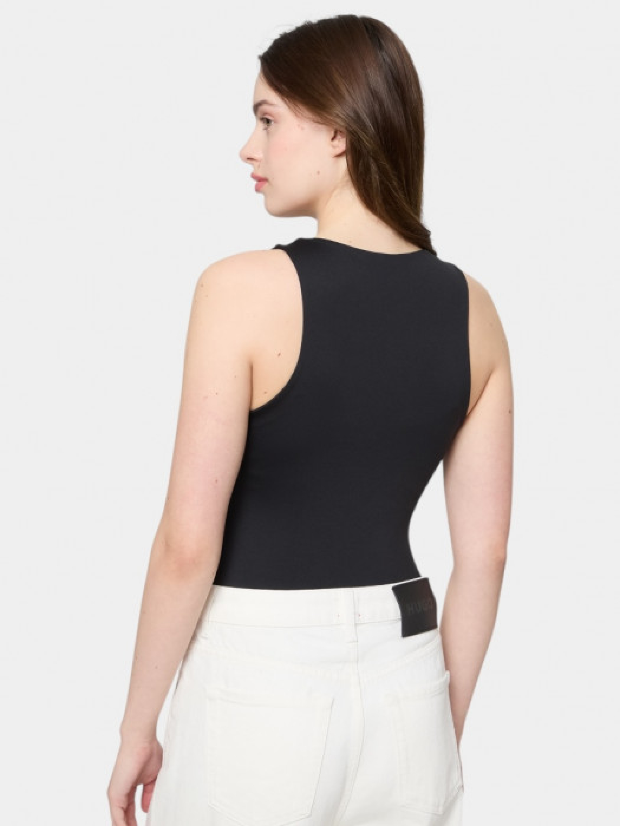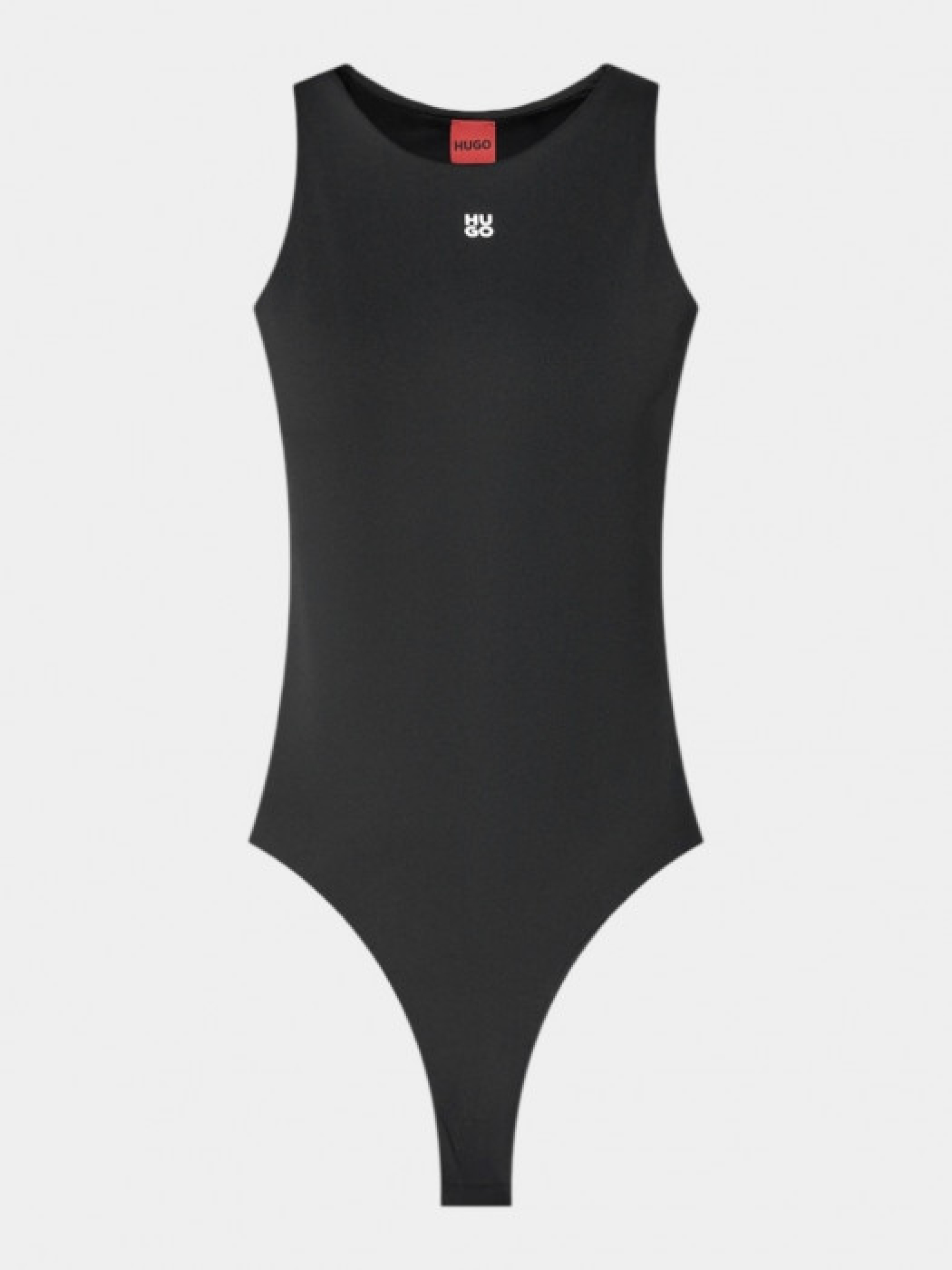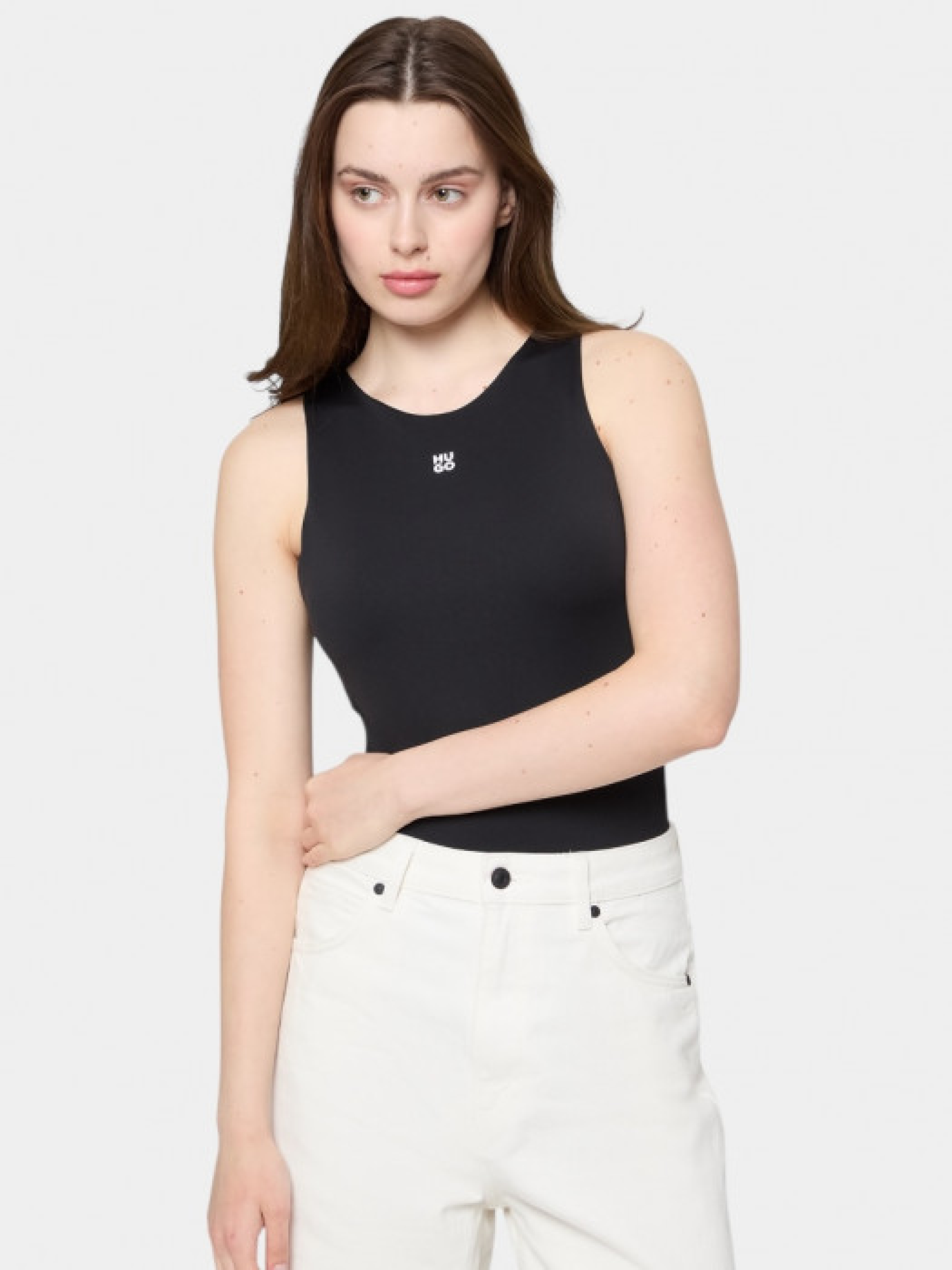 Боді HUGO Womenswear без рукавів зі скругленою горловиною виконане з еластичного джерсі та має надрукований stacked-логотип. Модель подана у прилеглому силуеті. Зріст моделі: 176 см, на моделі розмір S.