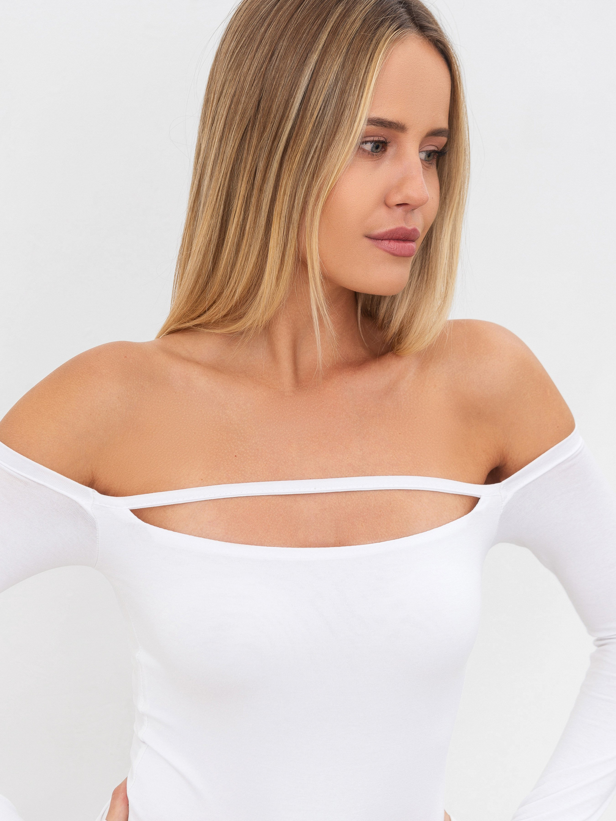 Тендітний боді з довгими рукавами та відкритими плечима. Для комфортного носіння спереду матеріал подвійний. Також є декоративний розріз. Знизу боді застібається на гачки. Матеріал приємний до тіла та в міру добре тягнеться. Базова модель на кожен день, яка легко комбінуватиметься з будь-яким низом. Доповнювати образ можна хустинками, сумкою, аксесуарами.