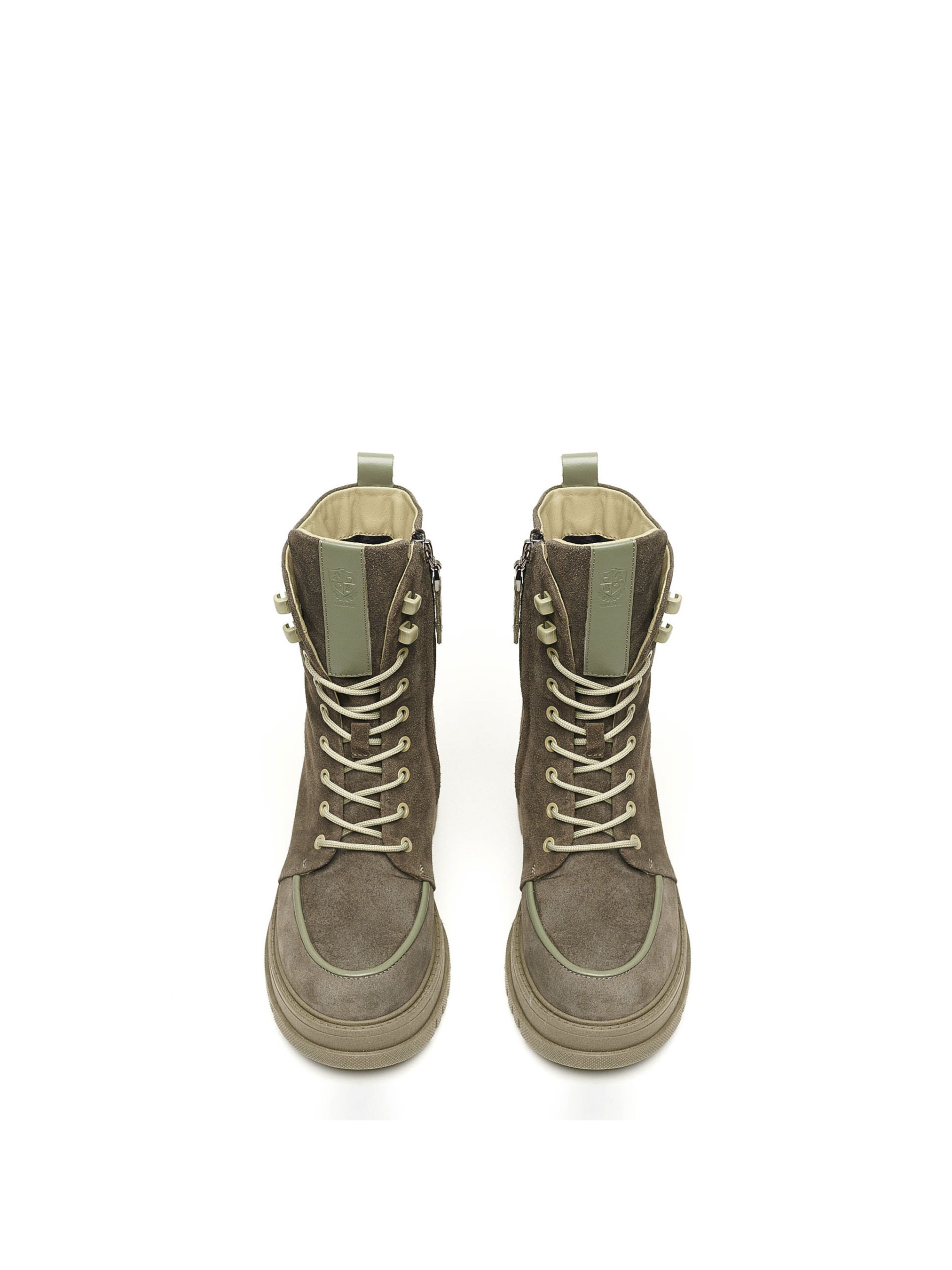 Високі сіро-зеленого відтінку черевики на шнурівці з протекторною платформою 4 сантиметри, будуть актуальними для тих жінок, які бажають виглядати сучасно та віддають перевагу стилю Casual. Виготовлені черевики з натуральної замші дуже приємної текстури та прикрашені шкіряними вставками позаду та з переду. З внутрішнього боку є прихована металева застібка-блискавка. Це тепле та зручне взуття зробить вашу осінь стильною та комфортною. Для виготовлення продукції відбираються преміум-матеріали, що є гарантом найвищої якості.