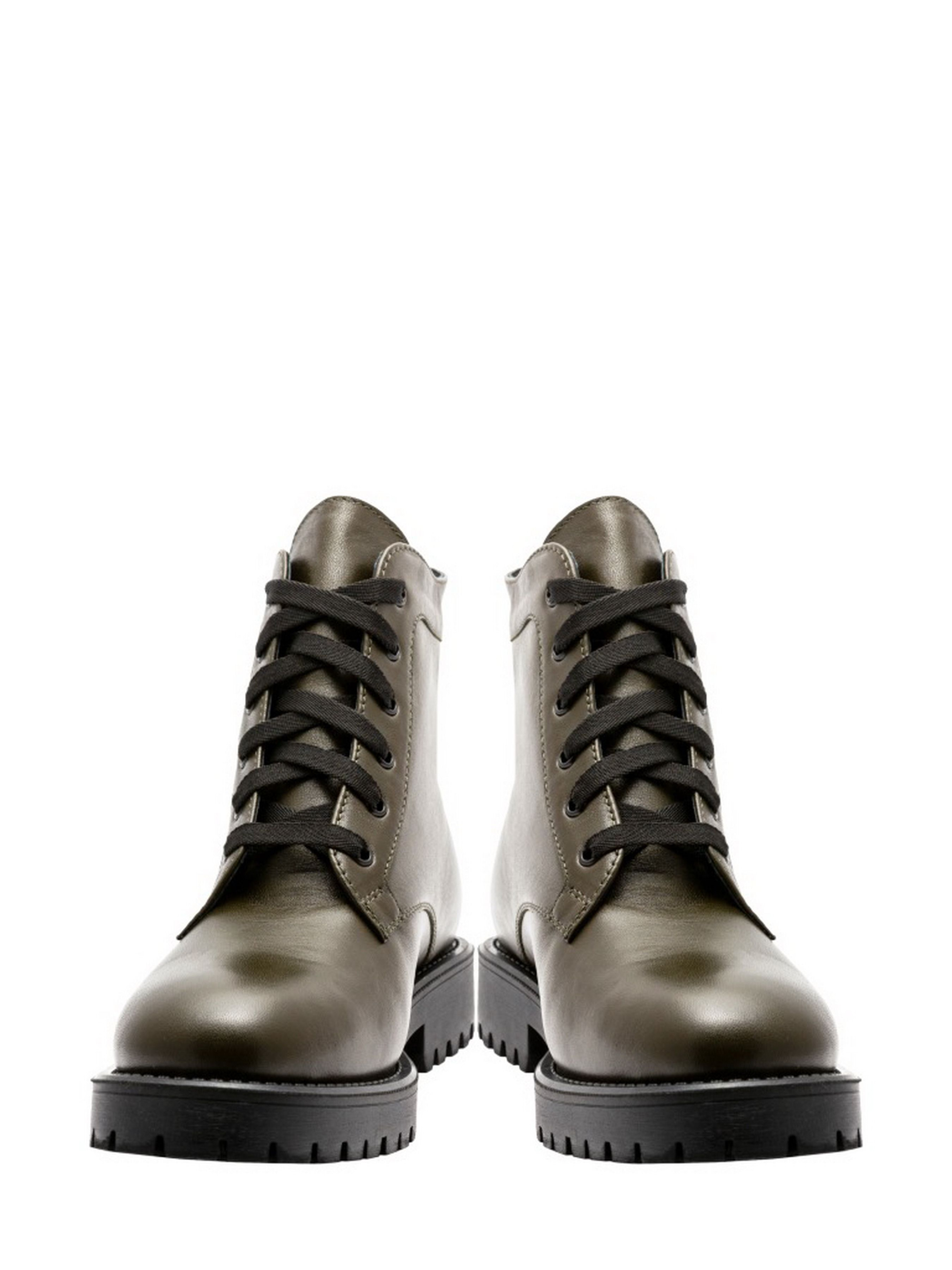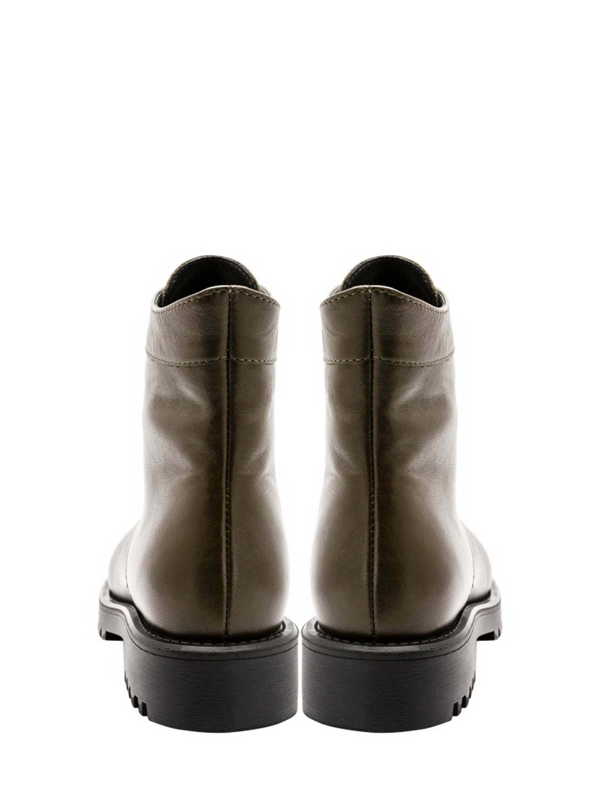 Жіночі черевики з гладкою якісної шкіри кольору хаккі. Підошва з синтетичного матеріалу з домішкою каучуку - підвищує стійкість до стирання. Носочна частина злегка пріквадрачена. Розмірна сітка по довжині устілки: 36 р - 24 см, 37 р - 24,6 см, 38 р - 25,5 см, 39 р - 26 см, 40 р - 26,6 см. (Пам'ятайте, якщо у Вас довжина стопи збігається з довжиною устілки, то взуття треба брати, що б довжина устілки була на 0,5 см довше стопи.)