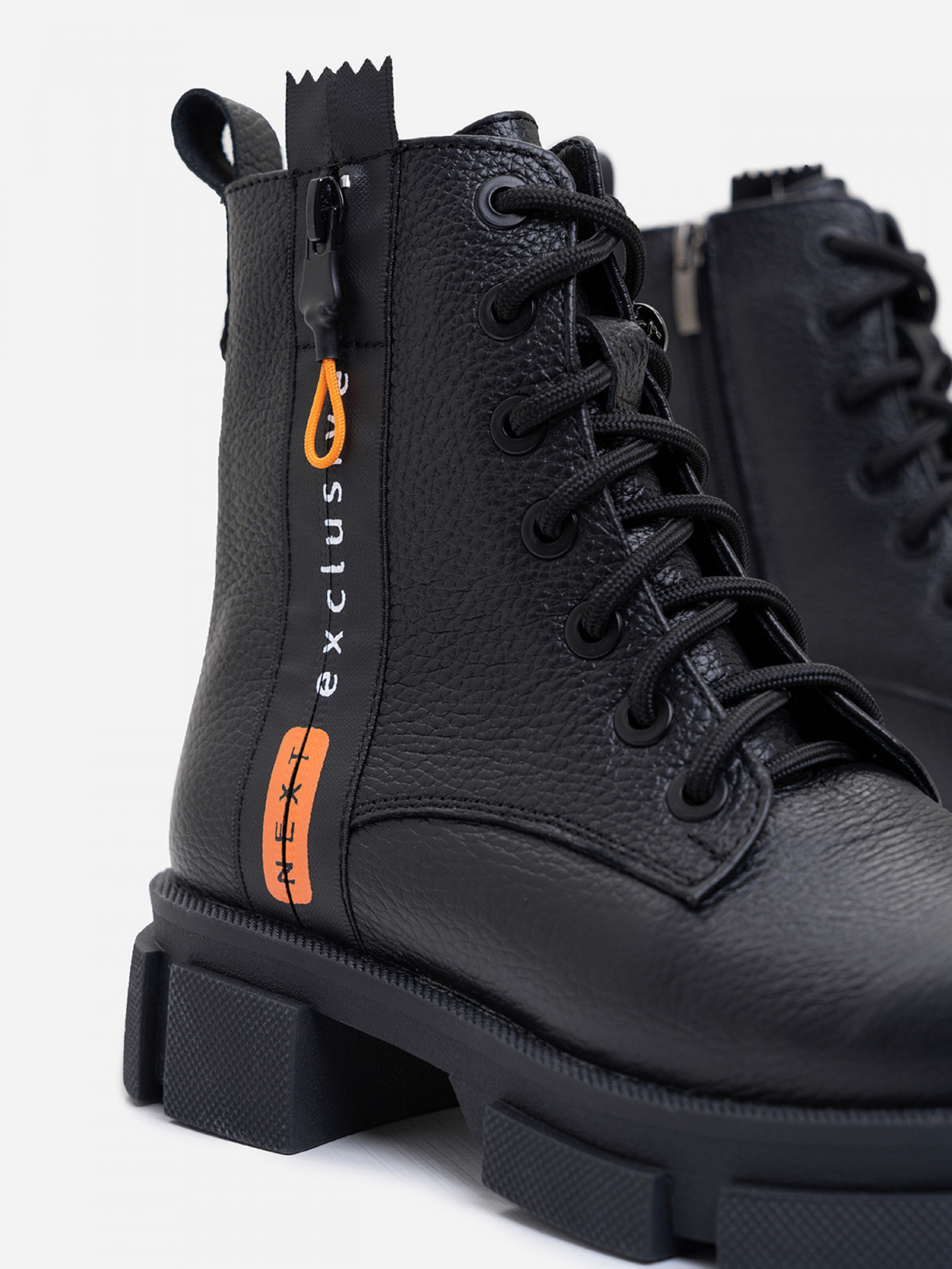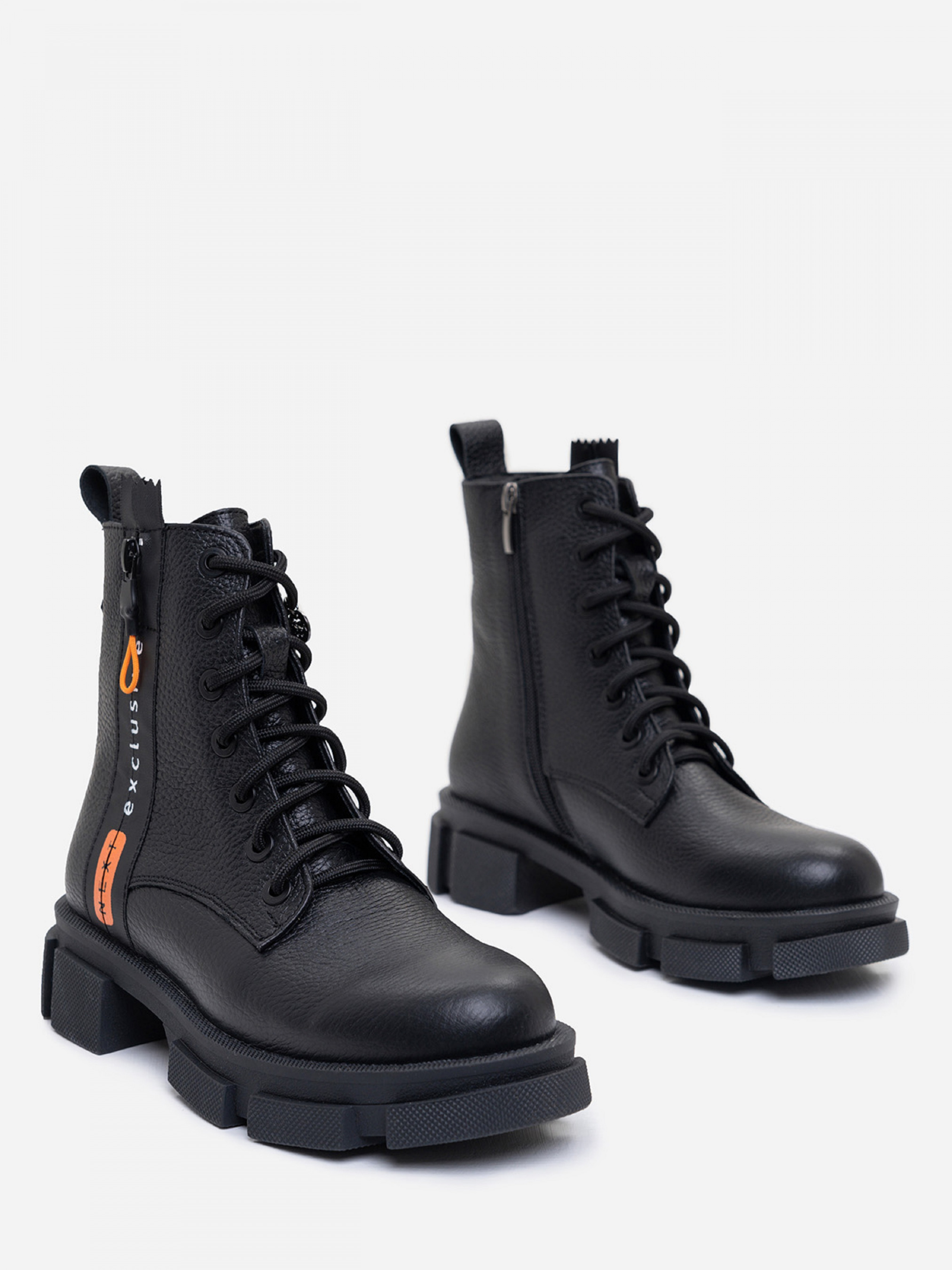 Зимові високі черевики із зернистої шкіри на хутрі з боковою декоративною блискавкою та вставкою. Модель на високій підошві зі шнурівкою та застібкою-блискавкою. Позаду виробу петлиця. Матеріал верху: нат. шкіра Підклад: хутро штучне Підошва: TR (терморезина) Висота підошви: 4 і 2 см Висота черевиків: 13 см, 36 (23,5), 37 (24), 38 (24,5), 39 (25,5), 40 (26) ), 41 (26,5)
