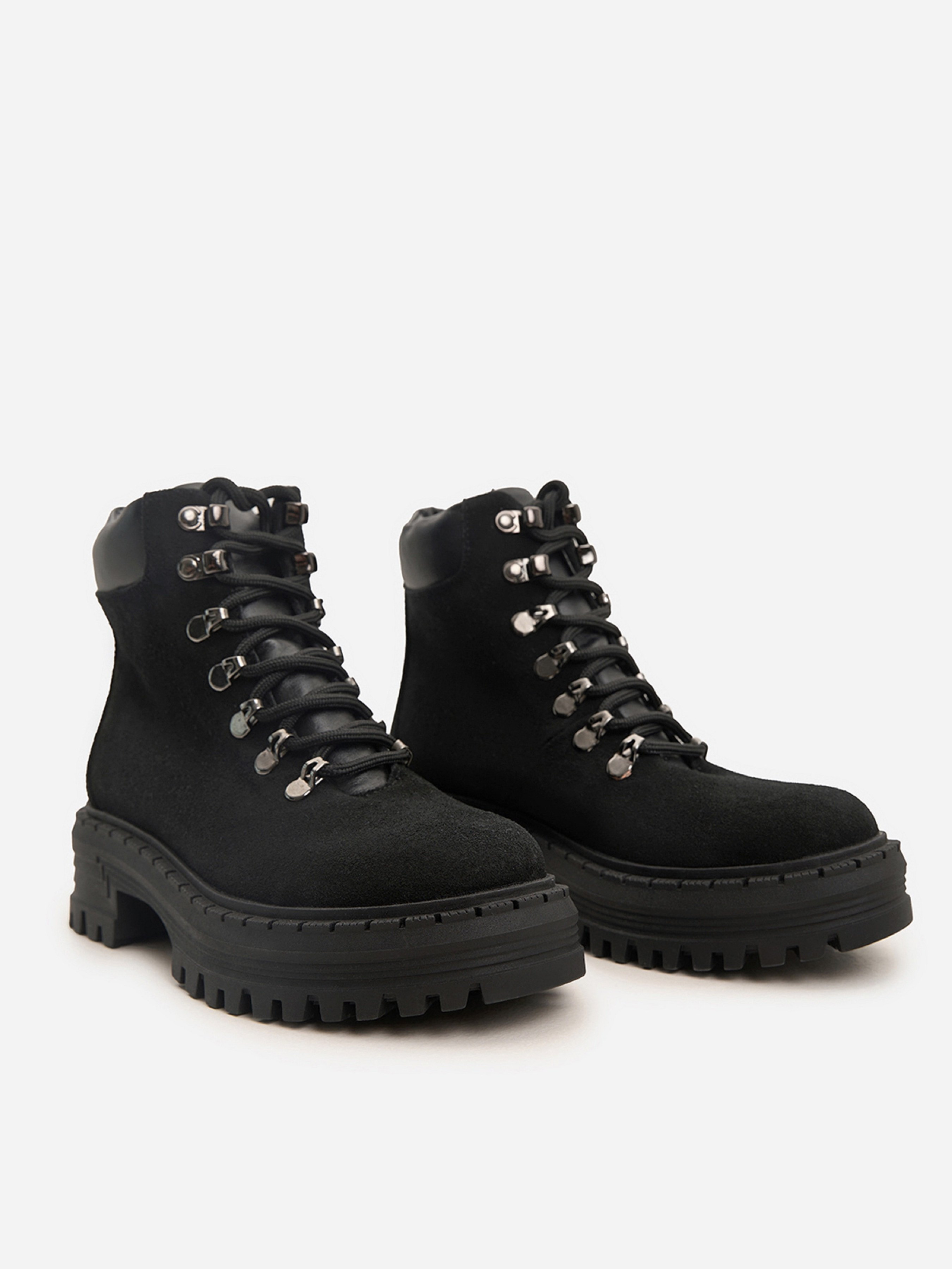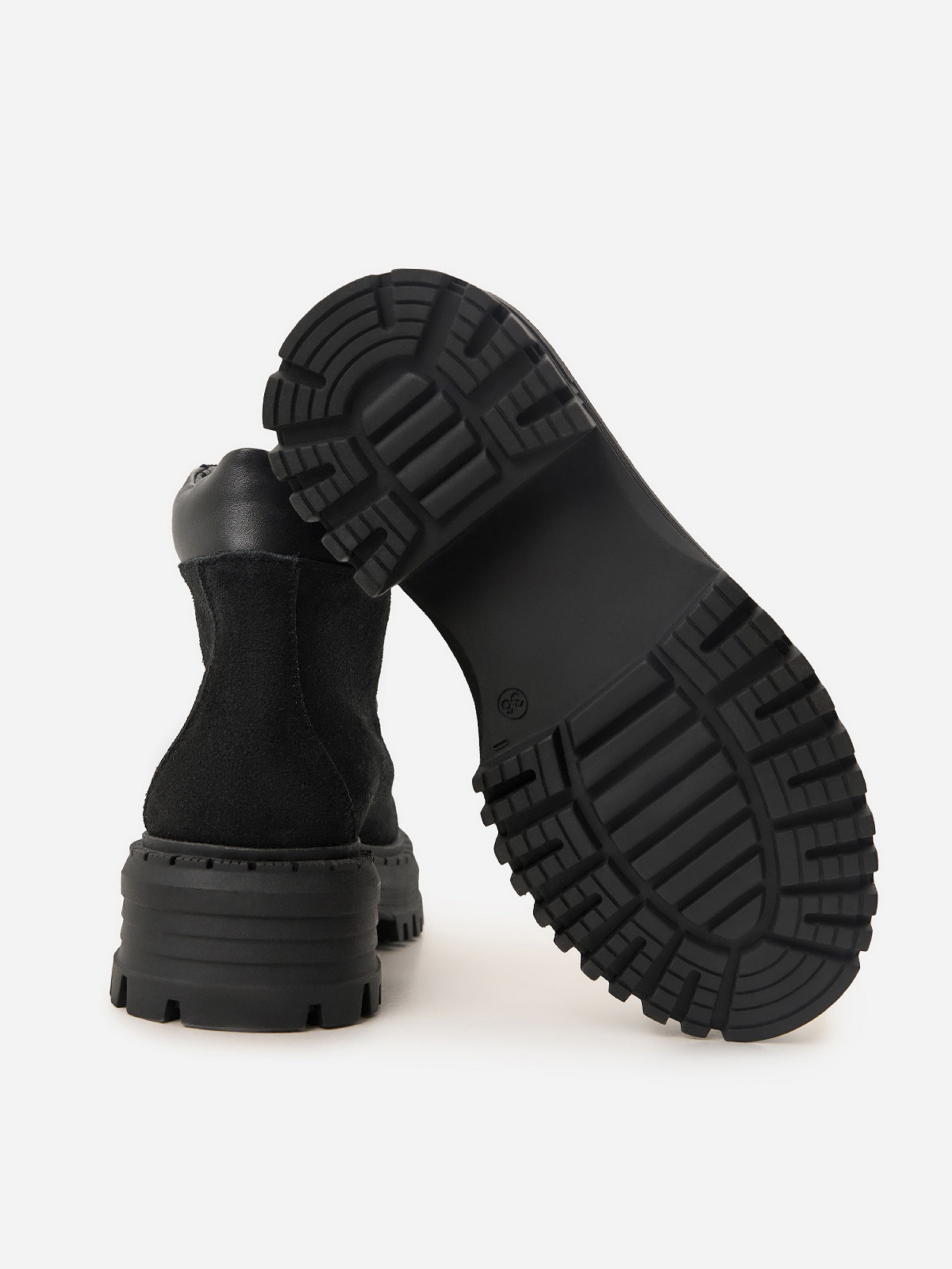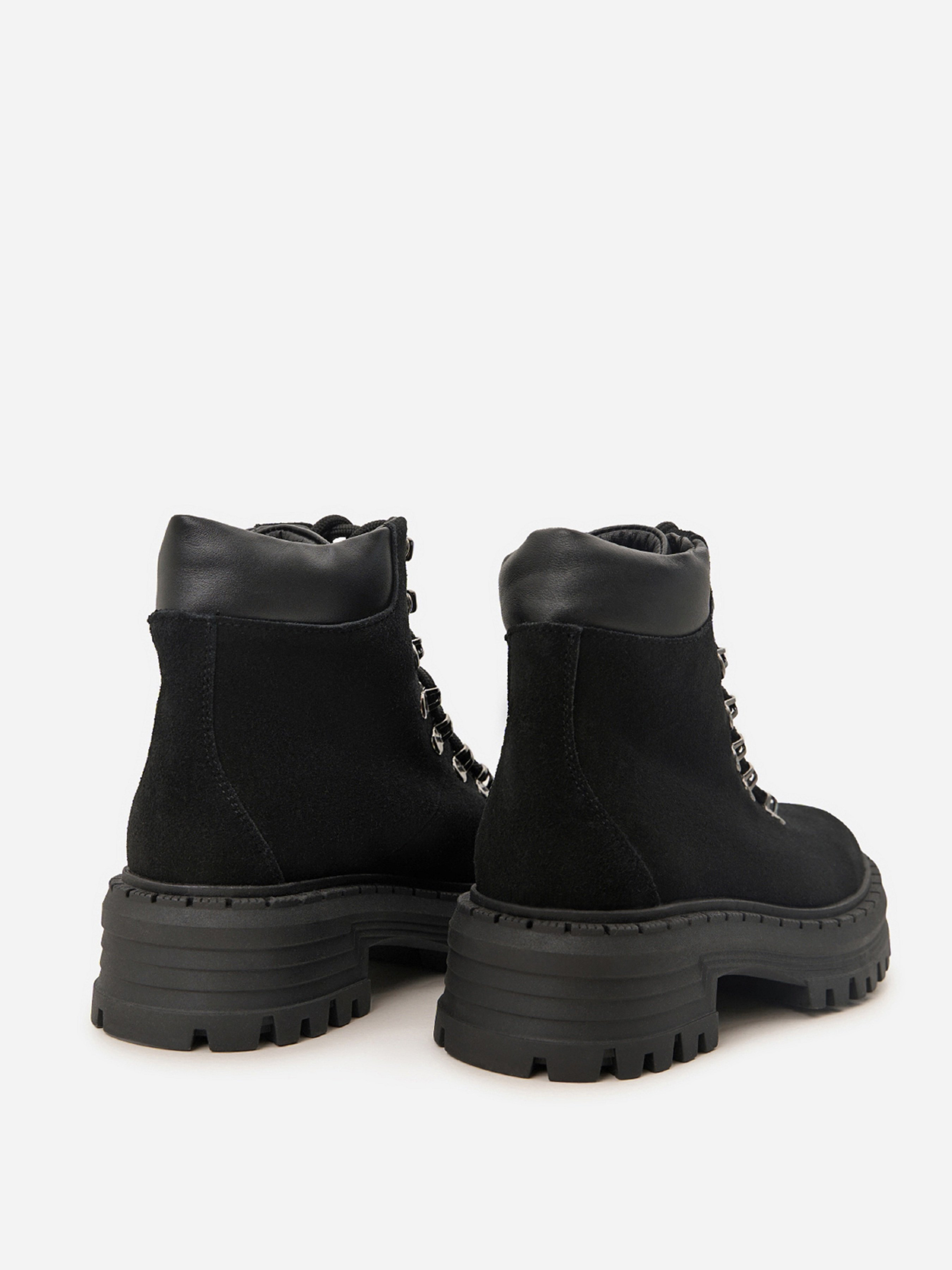 Чорні черевики із натуральної замші на байці. Модель на шнурівці з високою підошвою та шкіряною м'якою вставкою на заднику. Матеріал верху: натуральна замша. Підклад: байка. Підошва: TR (терморезина). Висота підошви: 5,5 см та 4 см. Висота черевиків: 12 см. Заміри: 36 (23,5), 37 (24), 38 (24,5), 39 (25), 40 (25,5), 41 (26)