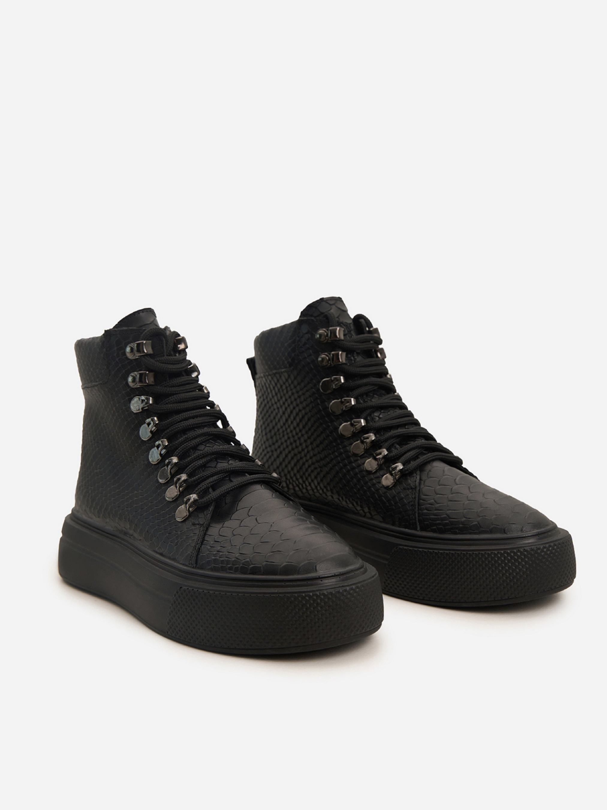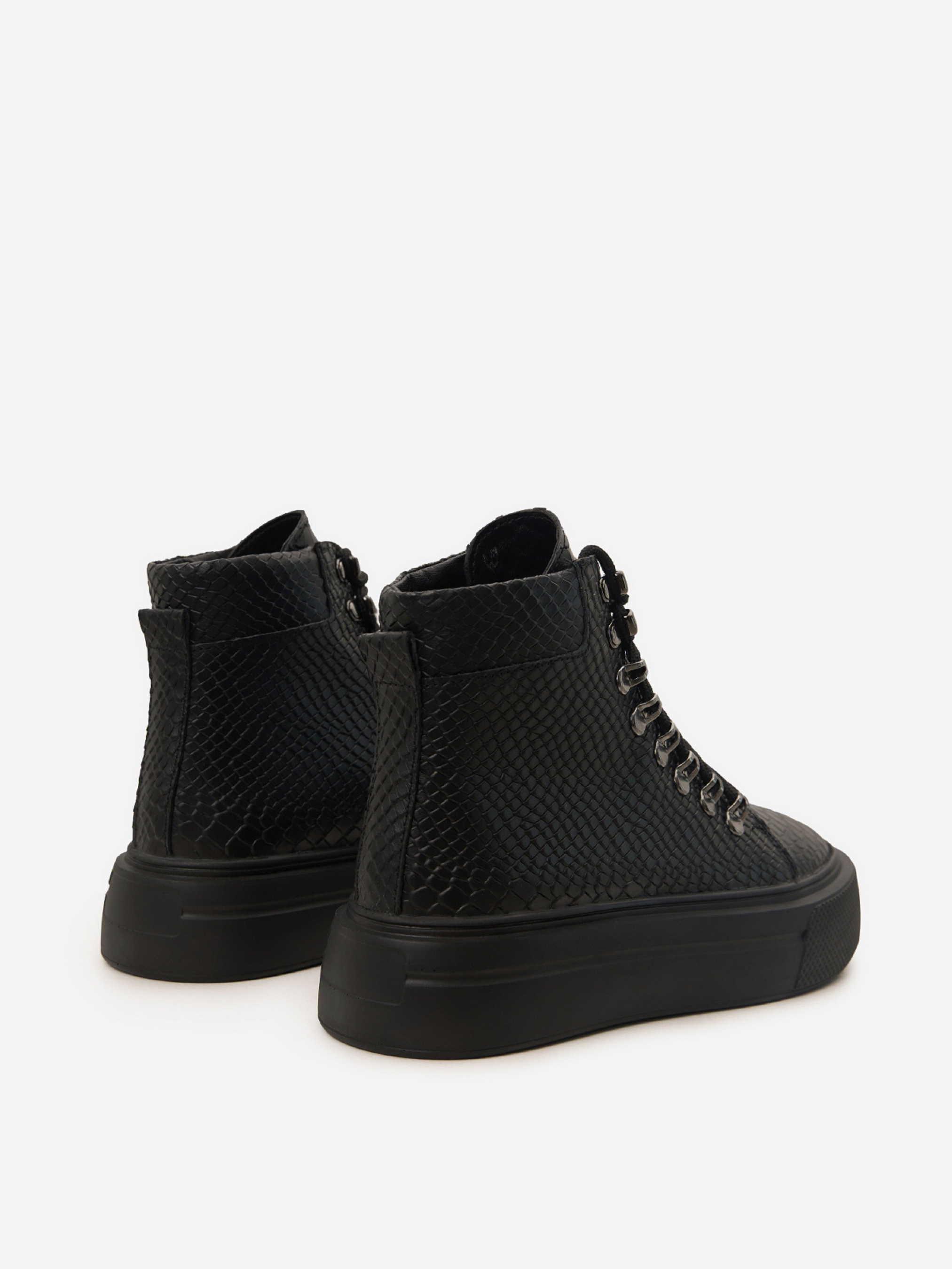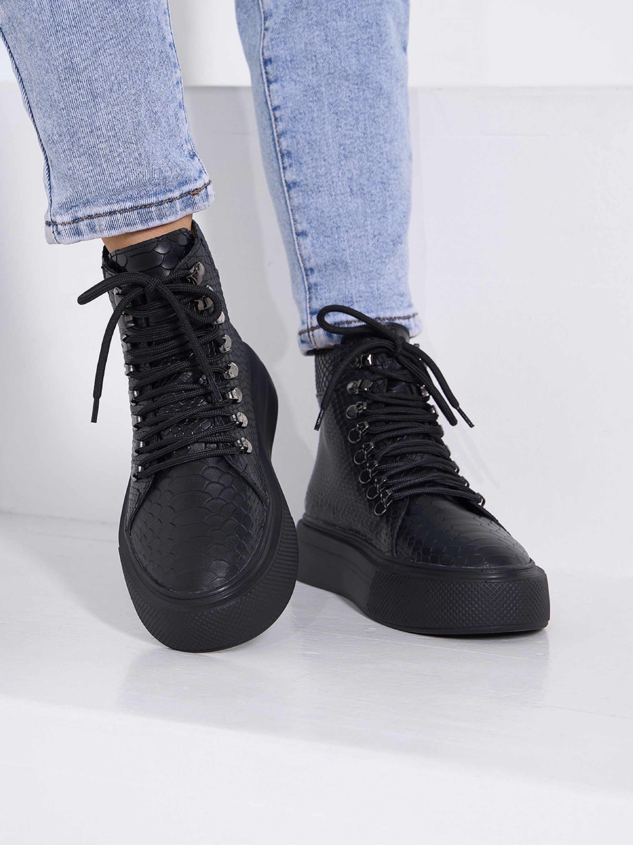 Чорні демісезонні черевики з натуральної шкіри з фактурою пітона. Черевики на байці з високою підошвою та шнурівкою. Матеріал верху: натуральна шкіра. Підклад: байка. Підошва: PU (поліуретан). Висота підошви: 5 см та 4 см. Висота черевиків: 11 см. Заміри: 36 (23,5), 37 (24), 38 (24,5), 39 (25), 40 (25,5), 41 (26)