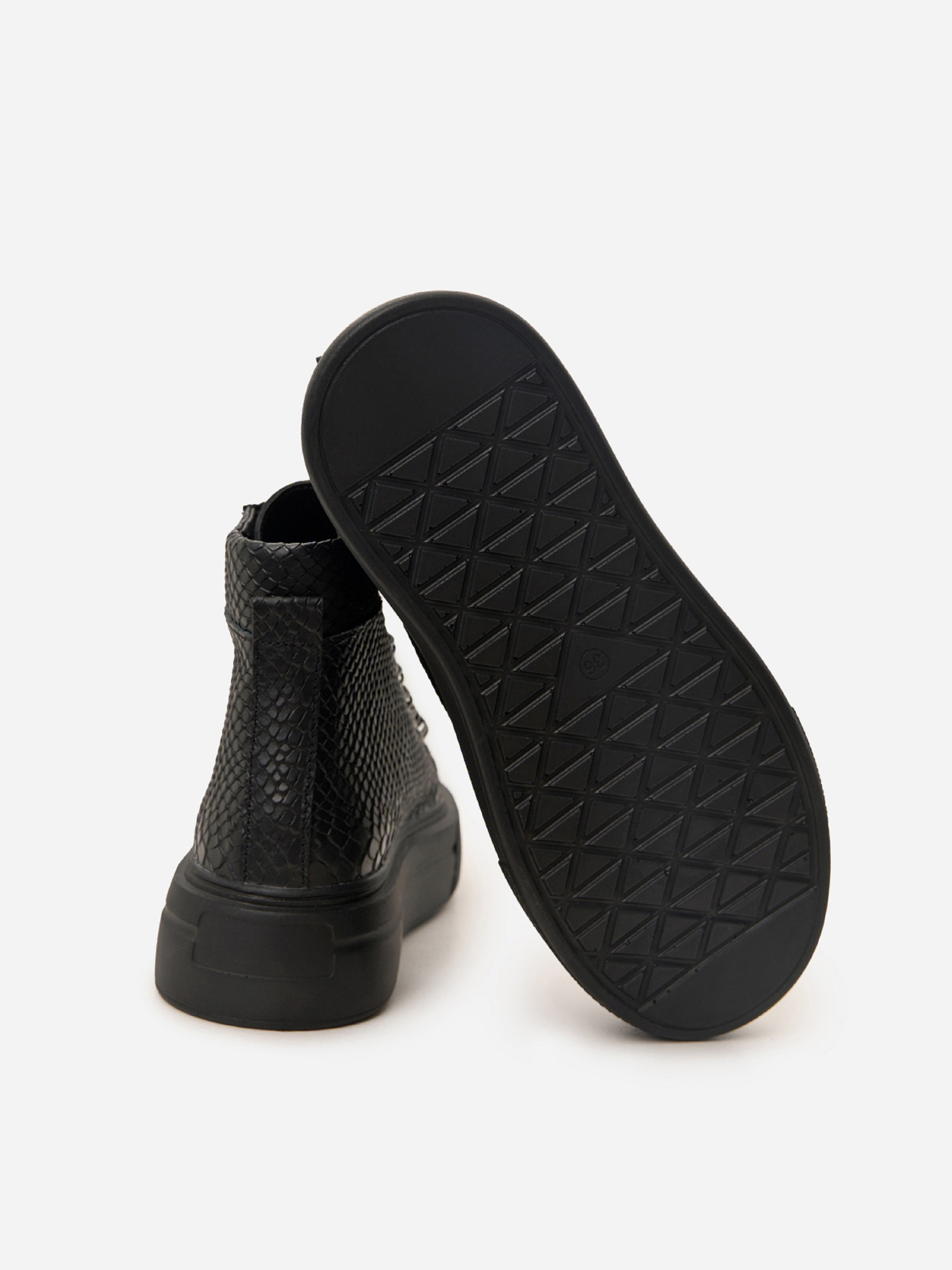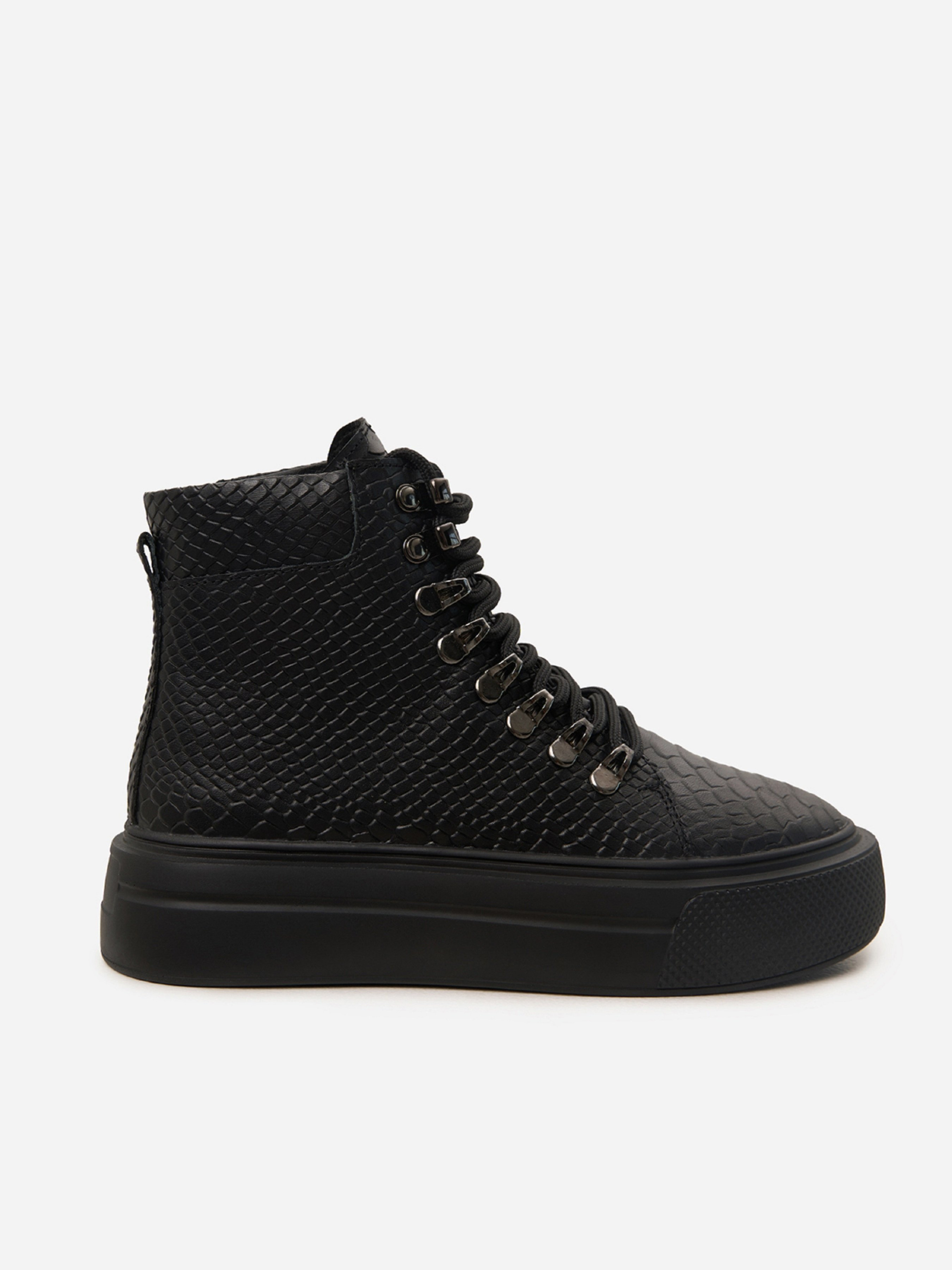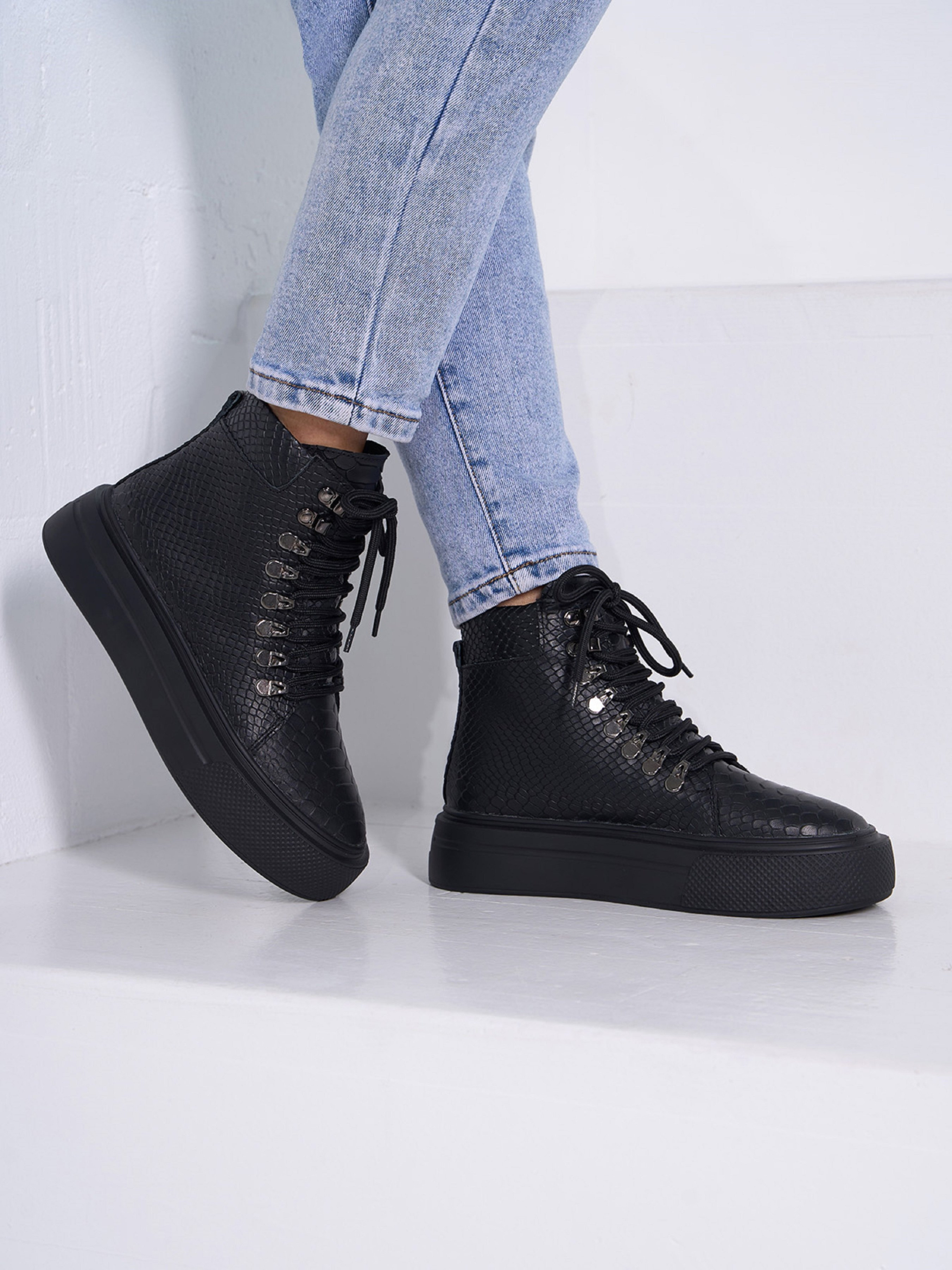 Чорні демісезонні черевики з натуральної шкіри з фактурою пітона. Черевики на байці з високою підошвою та шнурівкою. Матеріал верху: натуральна шкіра. Підклад: байка. Підошва: PU (поліуретан). Висота підошви: 5 см та 4 см. Висота черевиків: 11 см. Заміри: 36 (23,5), 37 (24), 38 (24,5), 39 (25), 40 (25,5), 41 (26)