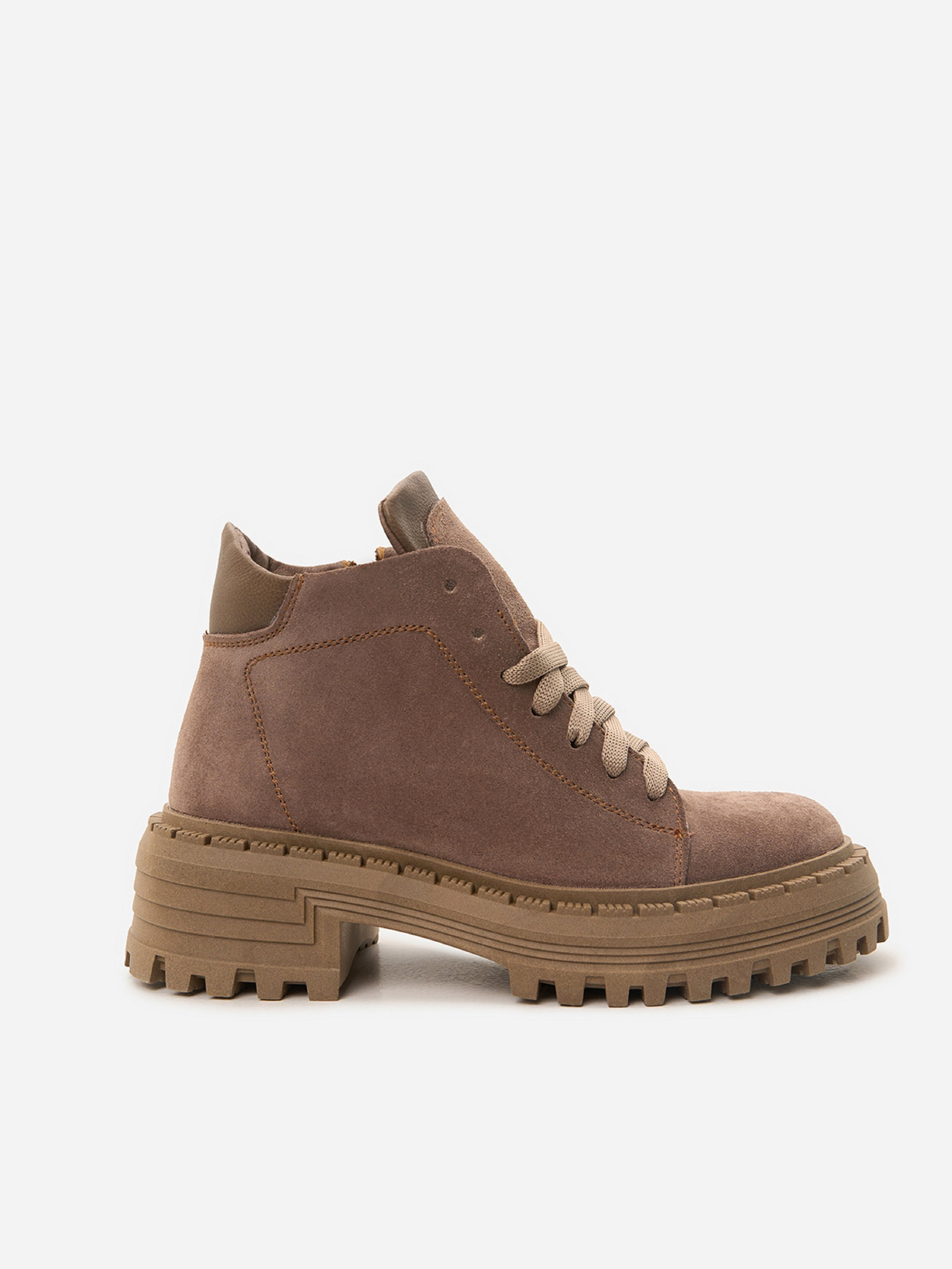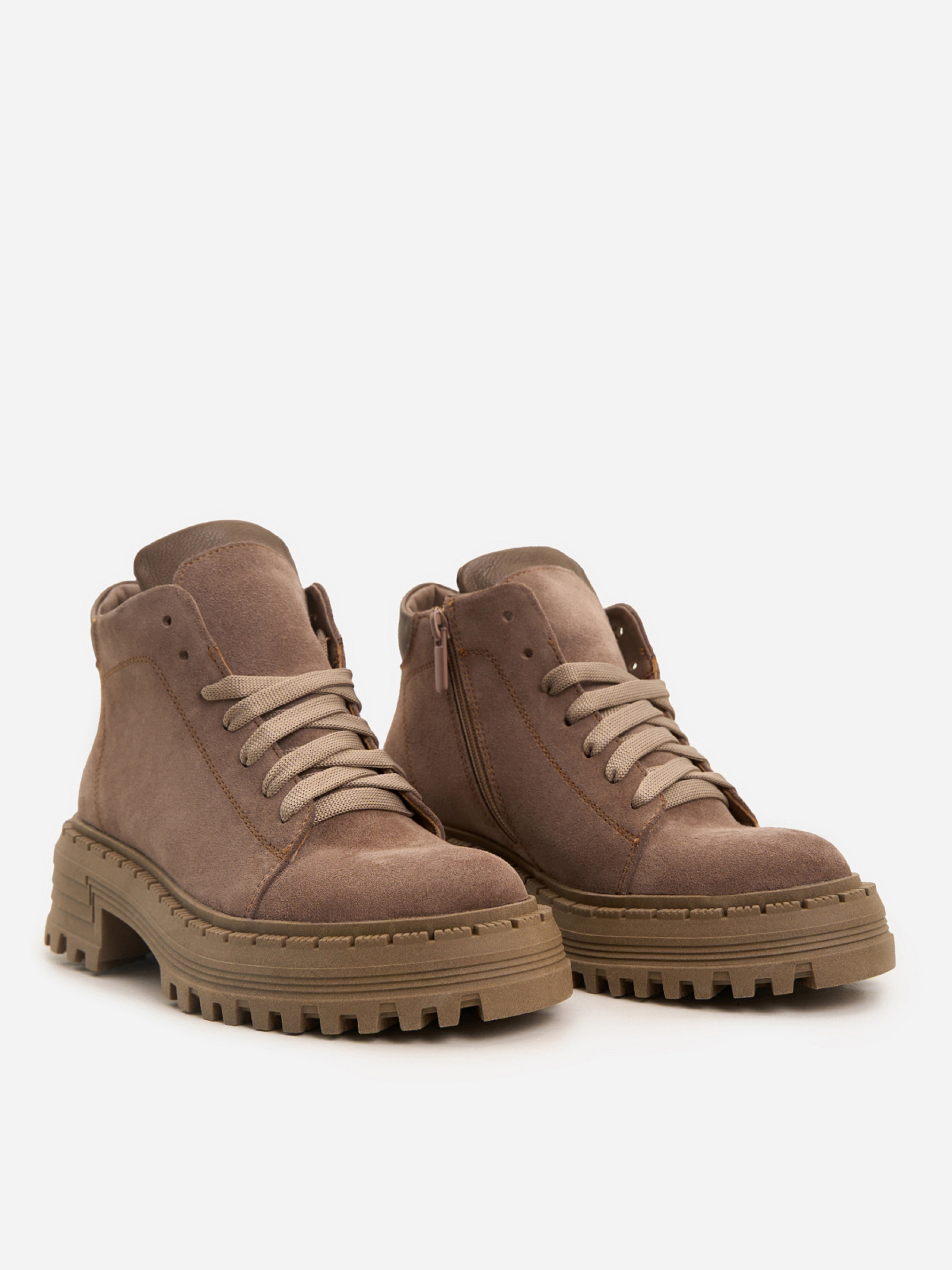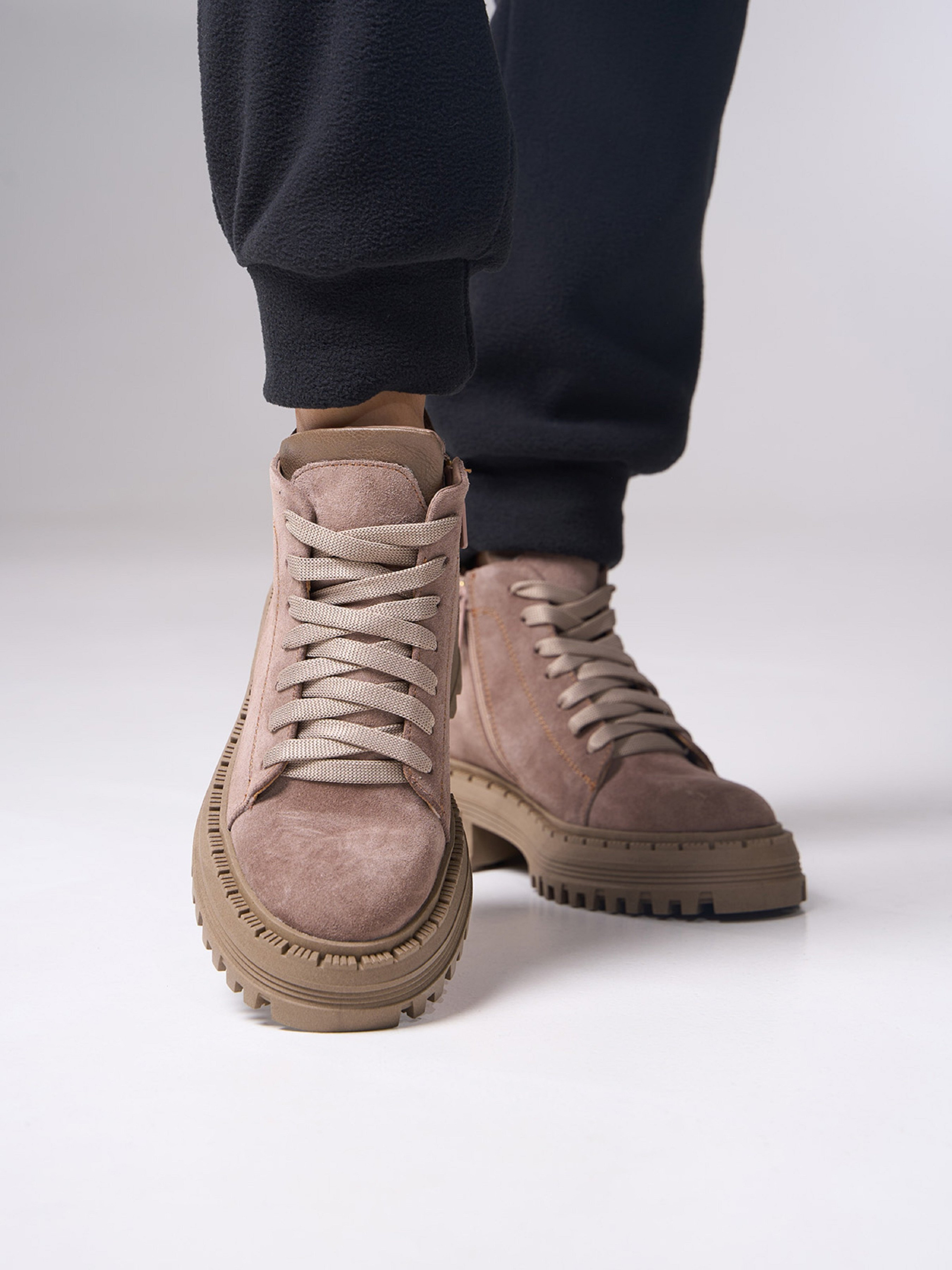 Бежеві черевики з натуральної замші на байці зі шкіряними вставками. Модель із блискавкою та шнурівкою оснащені високою грубою підошвою. Матеріал верху: натуральна замша. Підклад: байка. Підошва: TR (терморезина). Висота підошви: 6 см та 4 см. Висота черевиків: 10 см. Заміри: 36 (23,5), 37 (24), 38 (24,5), 39 (25), 40 (25,5), 41 (26)
