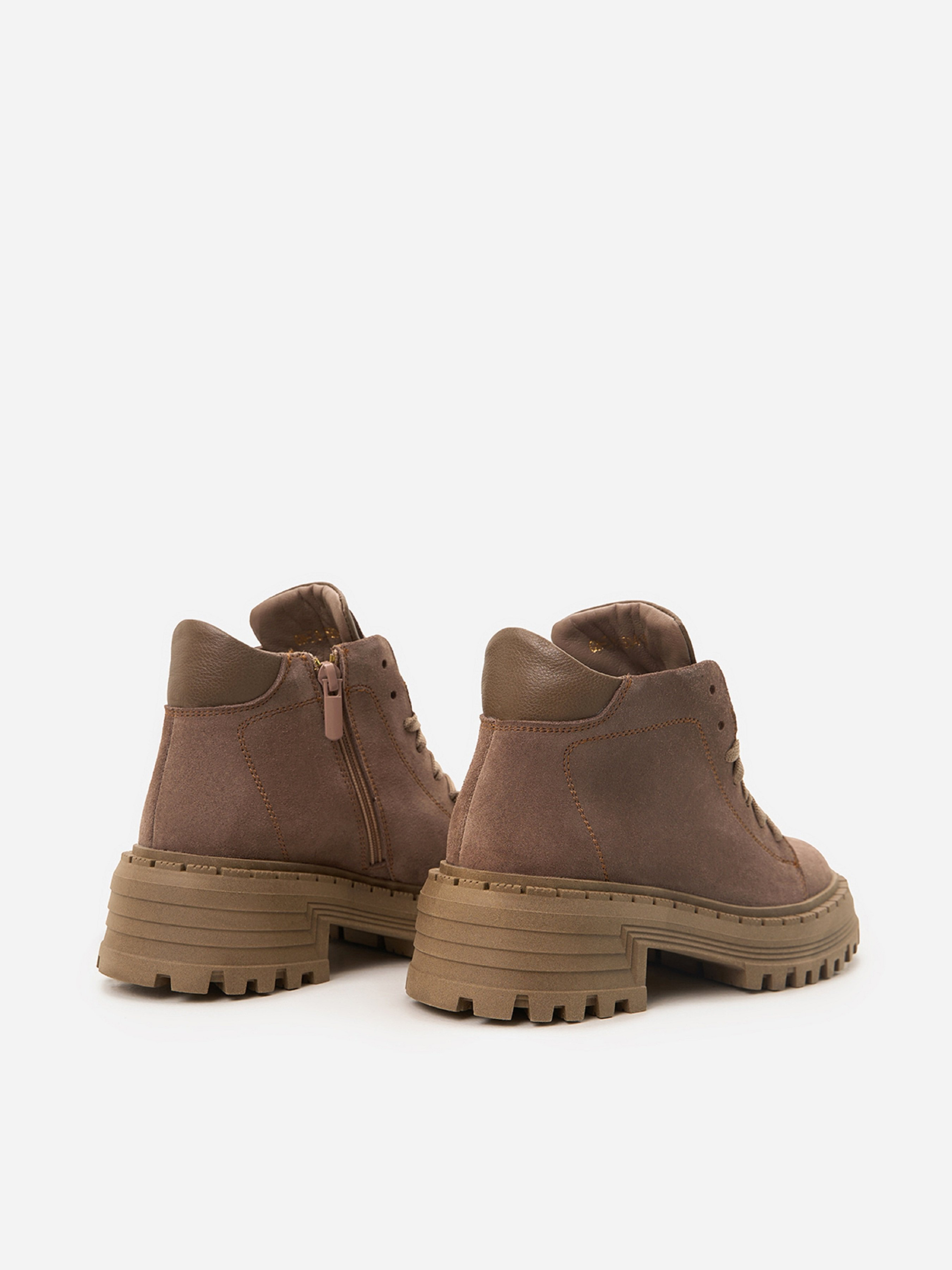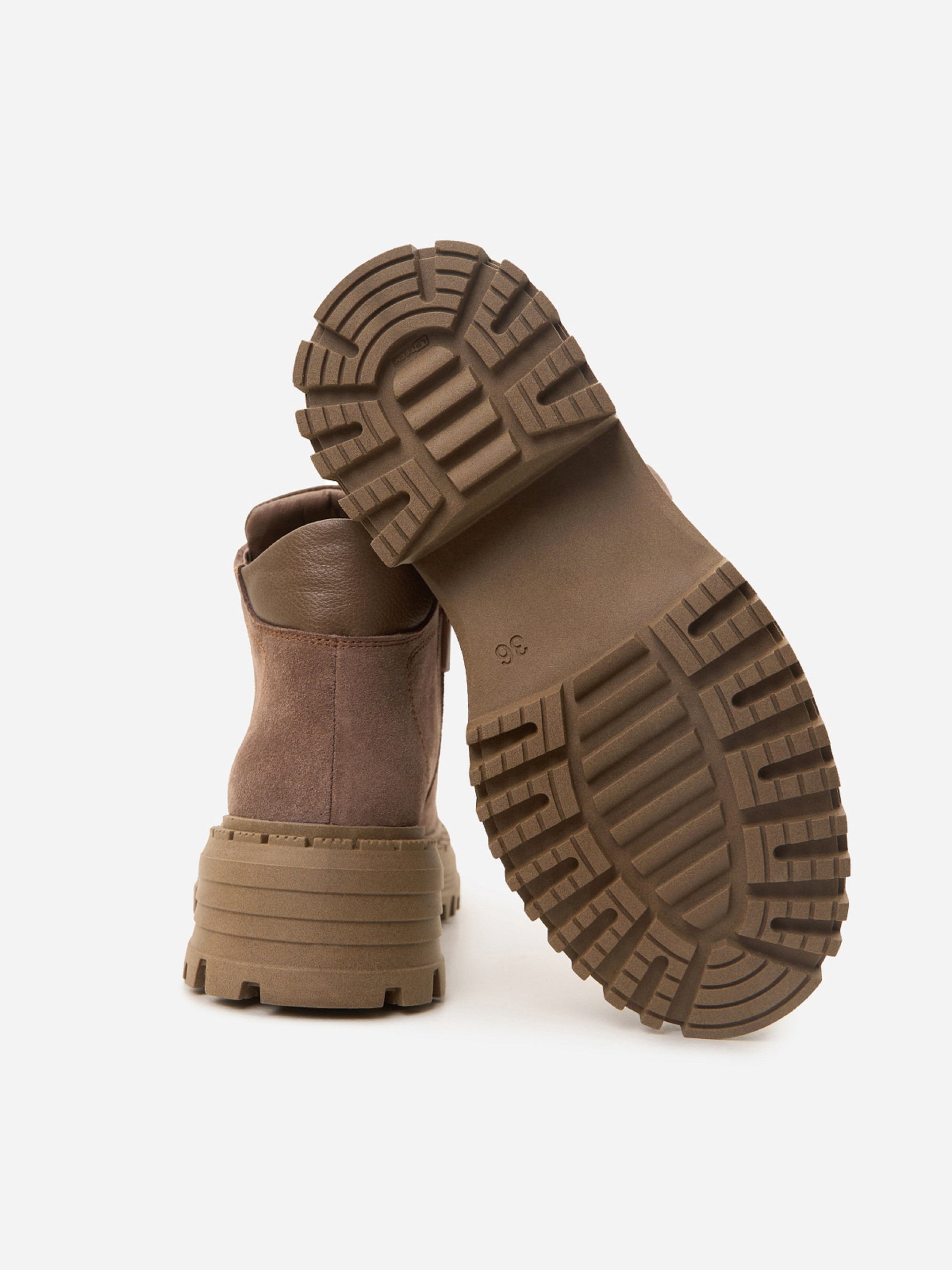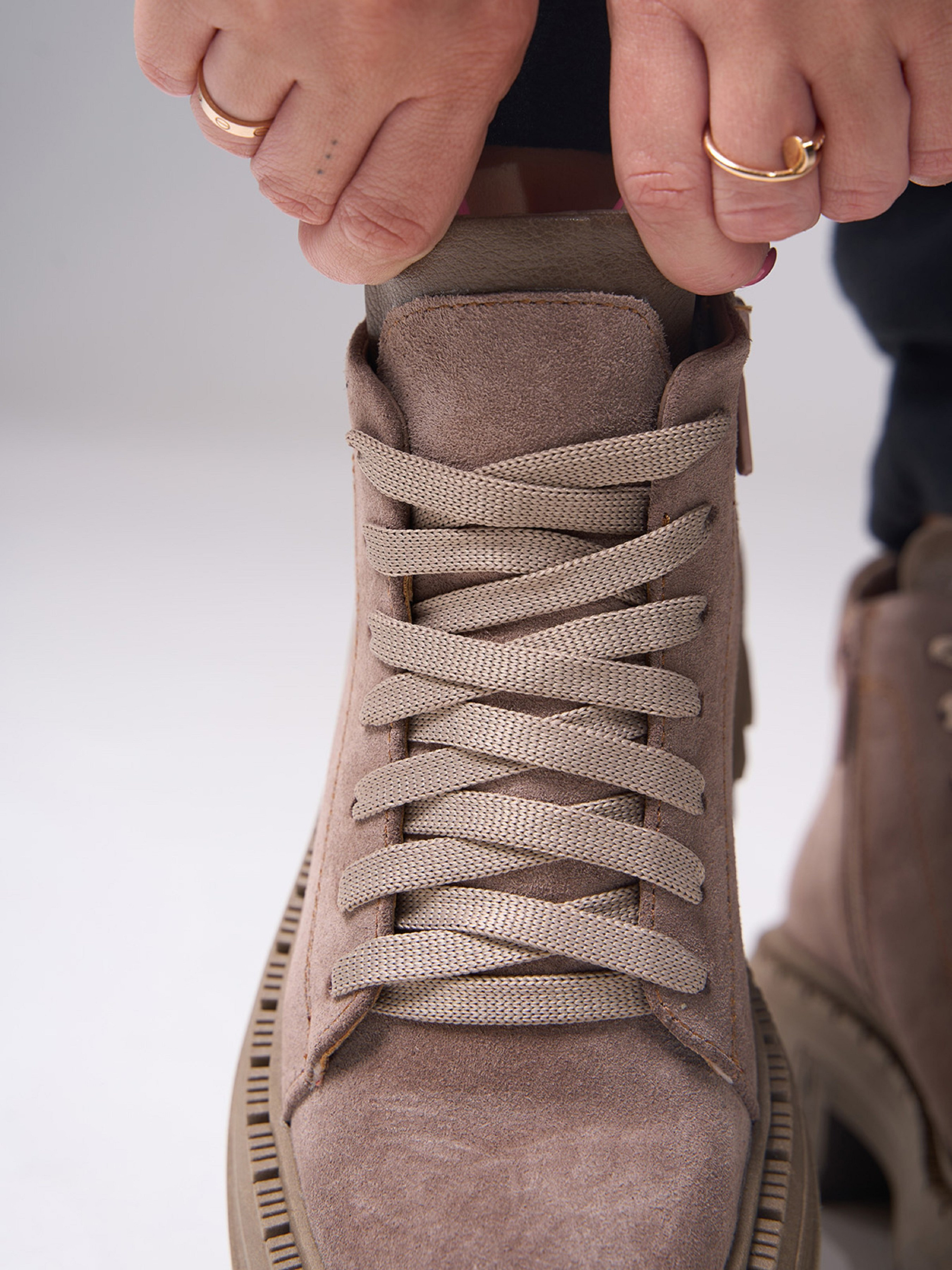 Бежеві черевики з натуральної замші на байці зі шкіряними вставками. Модель із блискавкою та шнурівкою оснащені високою грубою підошвою. Матеріал верху: натуральна замша. Підклад: байка. Підошва: TR (терморезина). Висота підошви: 6 см та 4 см. Висота черевиків: 10 см. Заміри: 36 (23,5), 37 (24), 38 (24,5), 39 (25), 40 (25,5), 41 (26)
