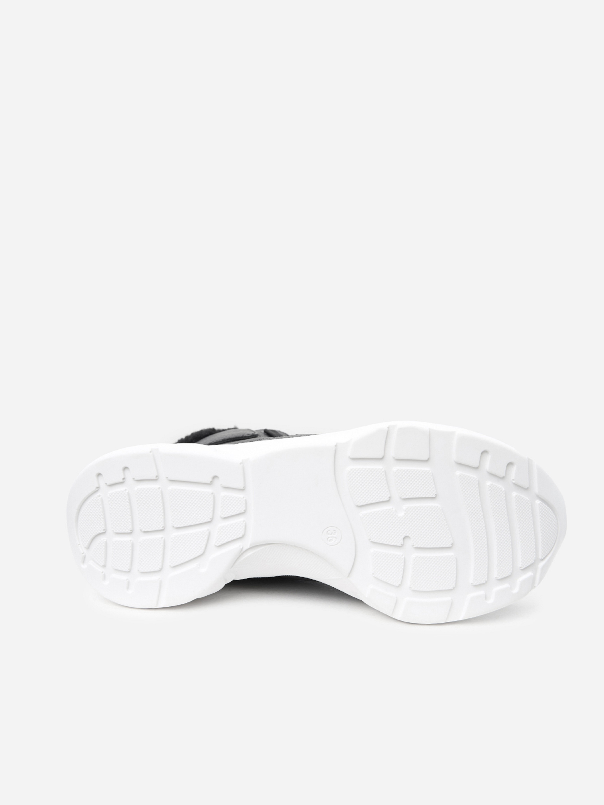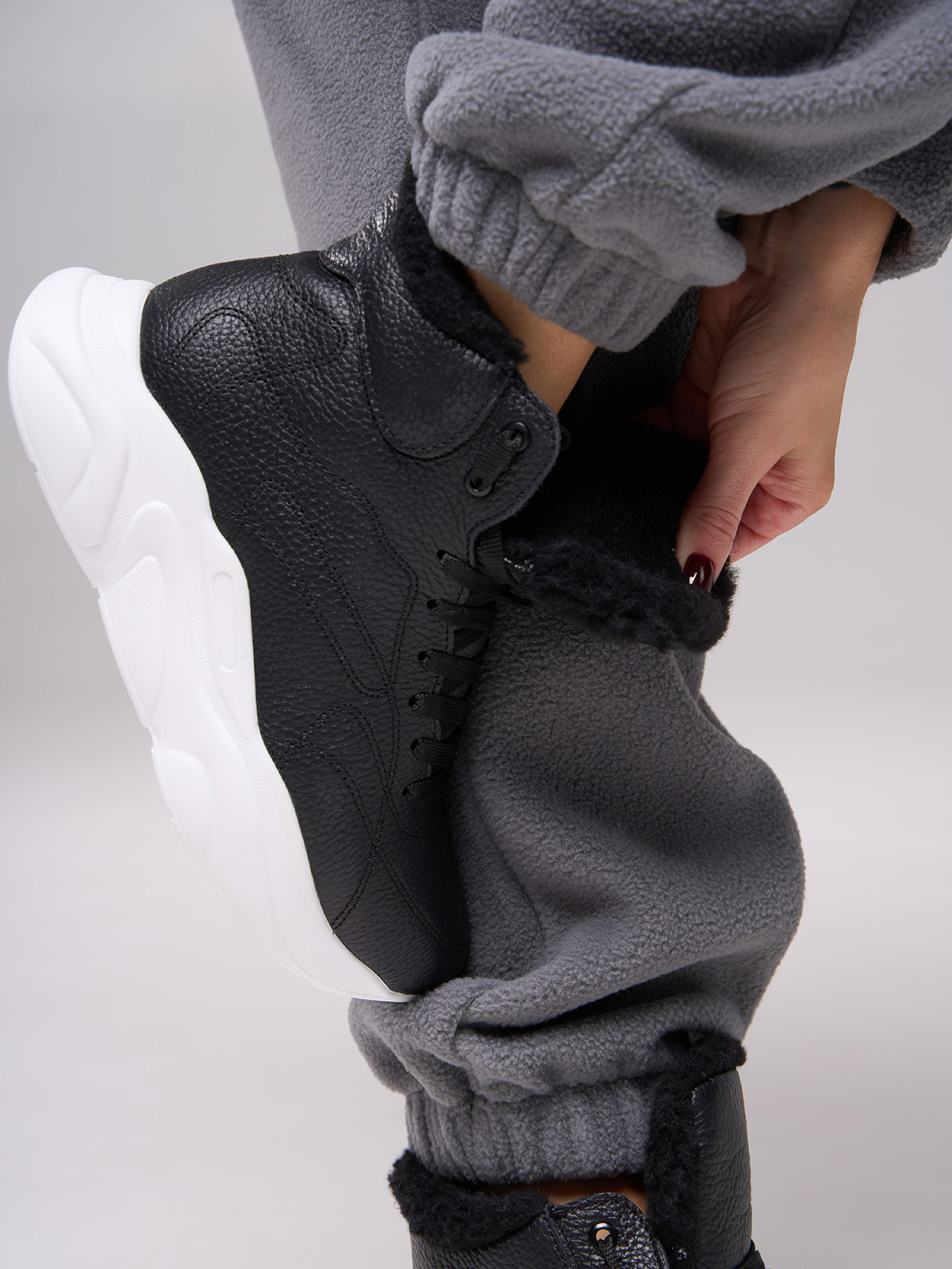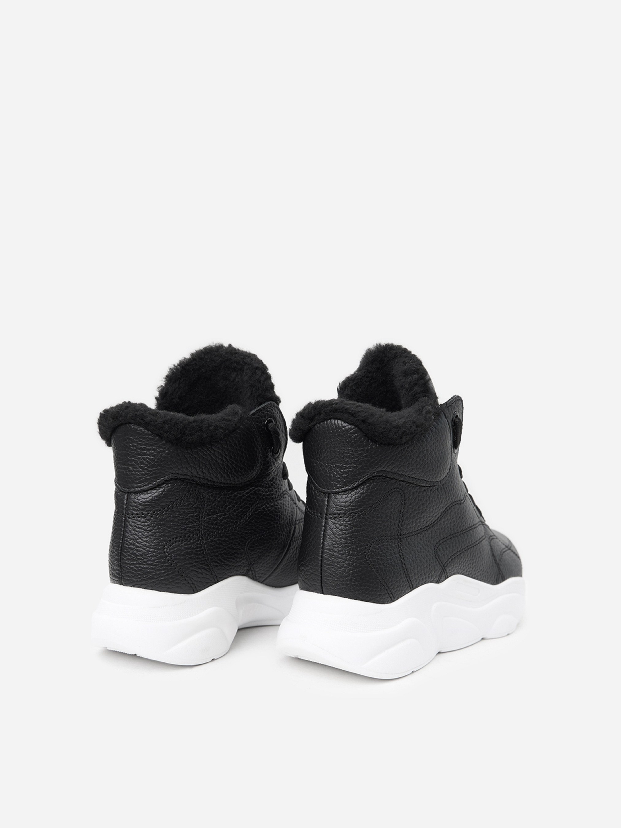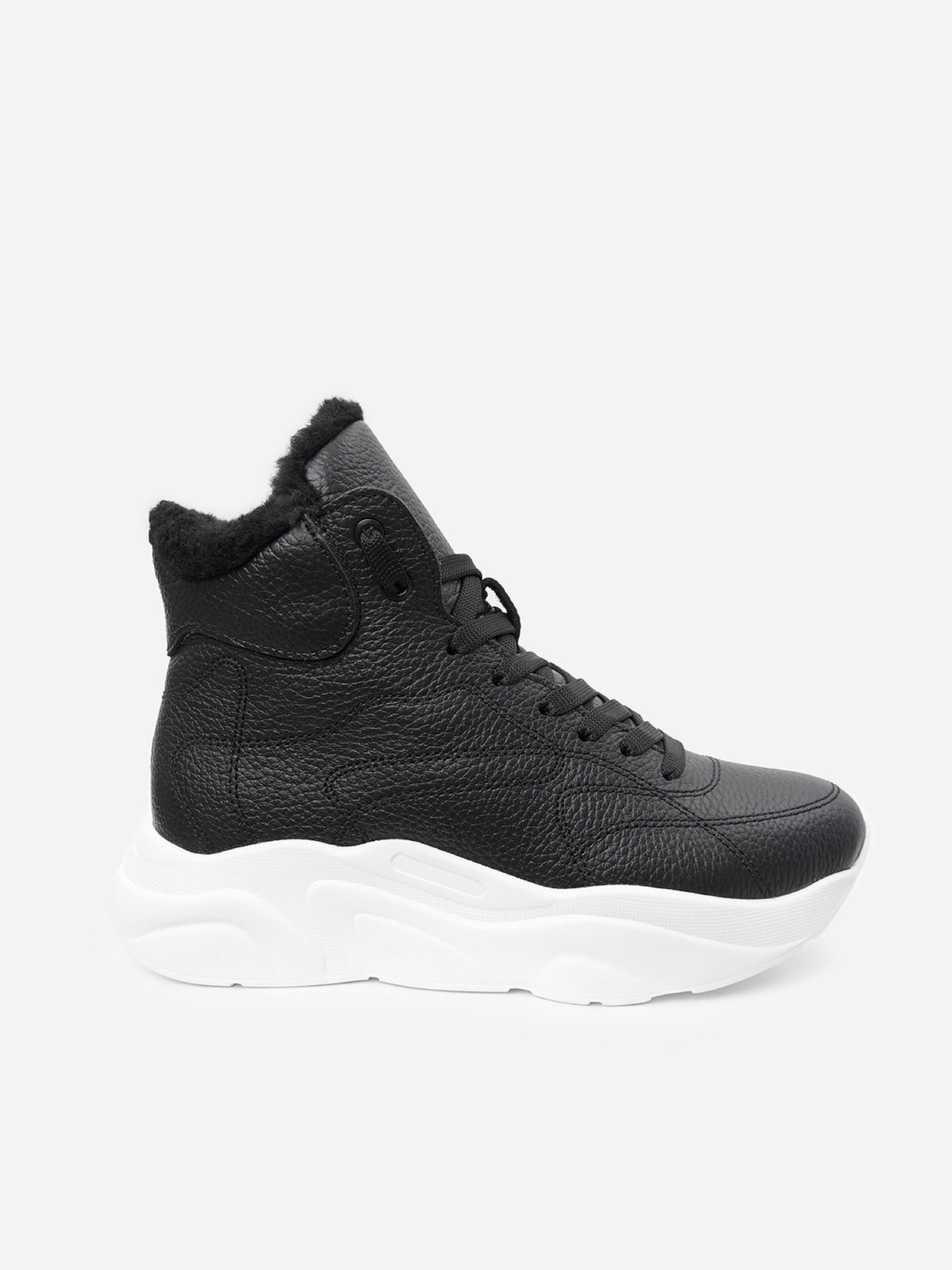 Чорні напівчеревики у спортивному стилі, виконані із зернистої натуральної шкіри на хутрі. Черевики на високій підошві з подовженим язичком та шнурівкою. Матеріал верху: натуральна шкіра. Підклад: хутро штучне. Підошва: PU (поліуретан). Висота підошви: 4 см та 3 см. Висота черевиків: 9,5 см. Заміри: 36 (23,5), 37 (24), 38 (24,5), 39 (25), 40 (25,5), 41 (26)