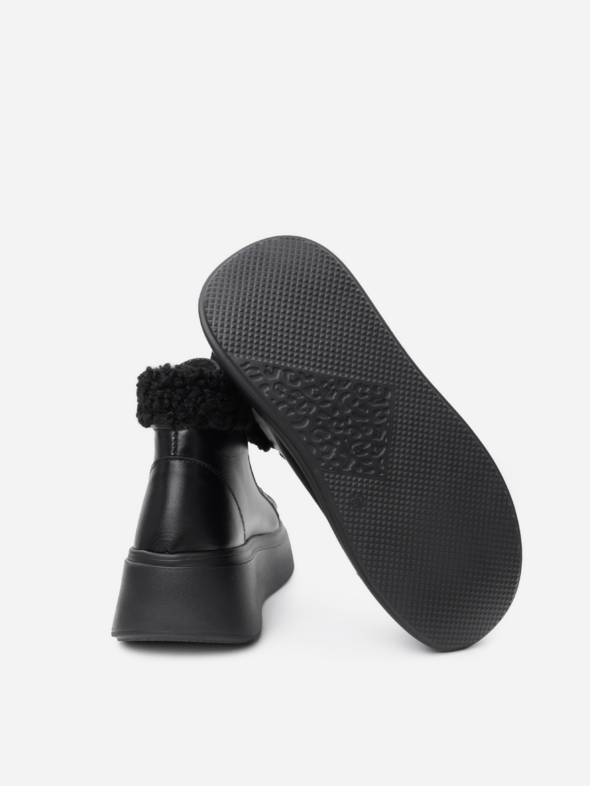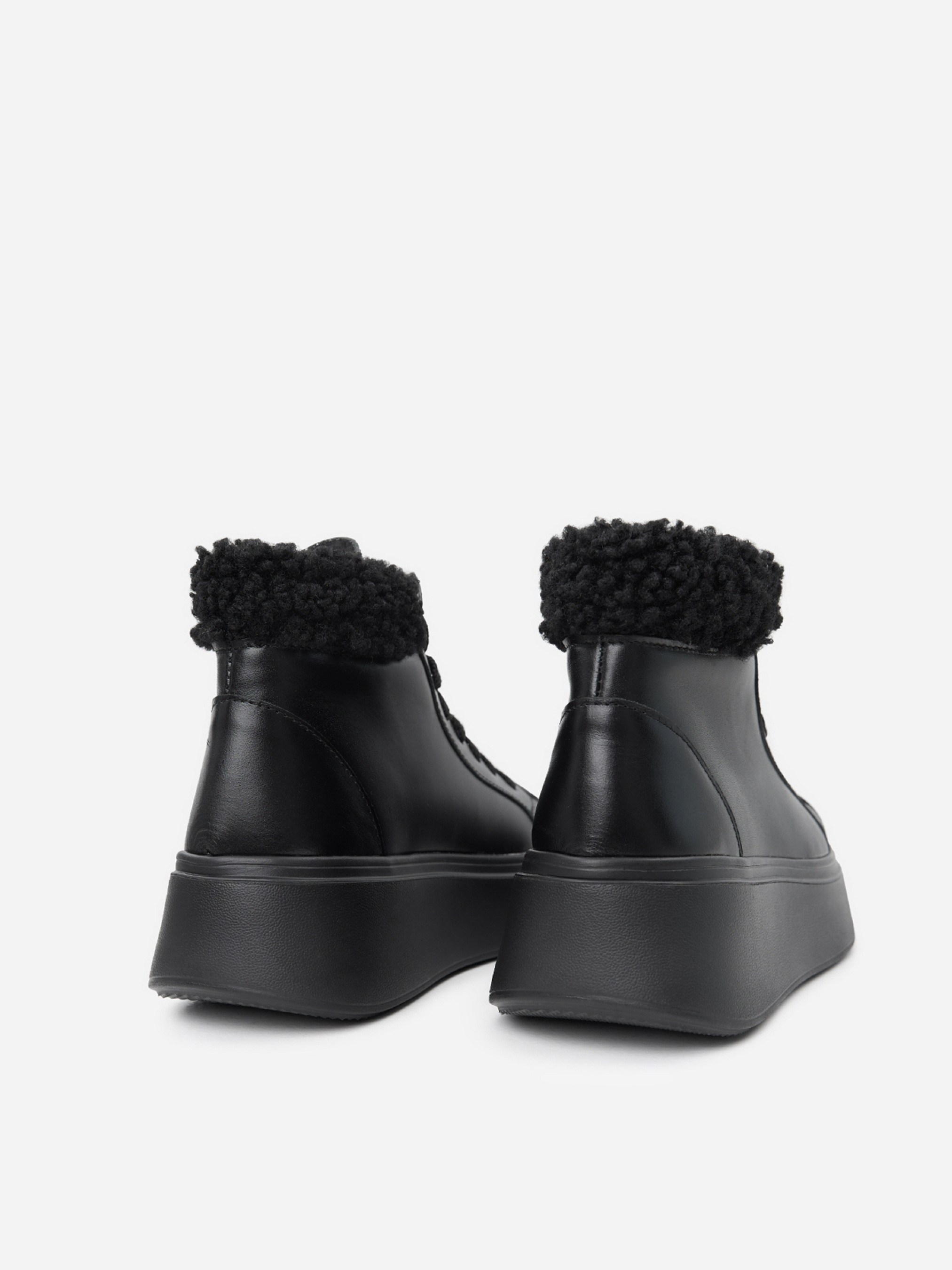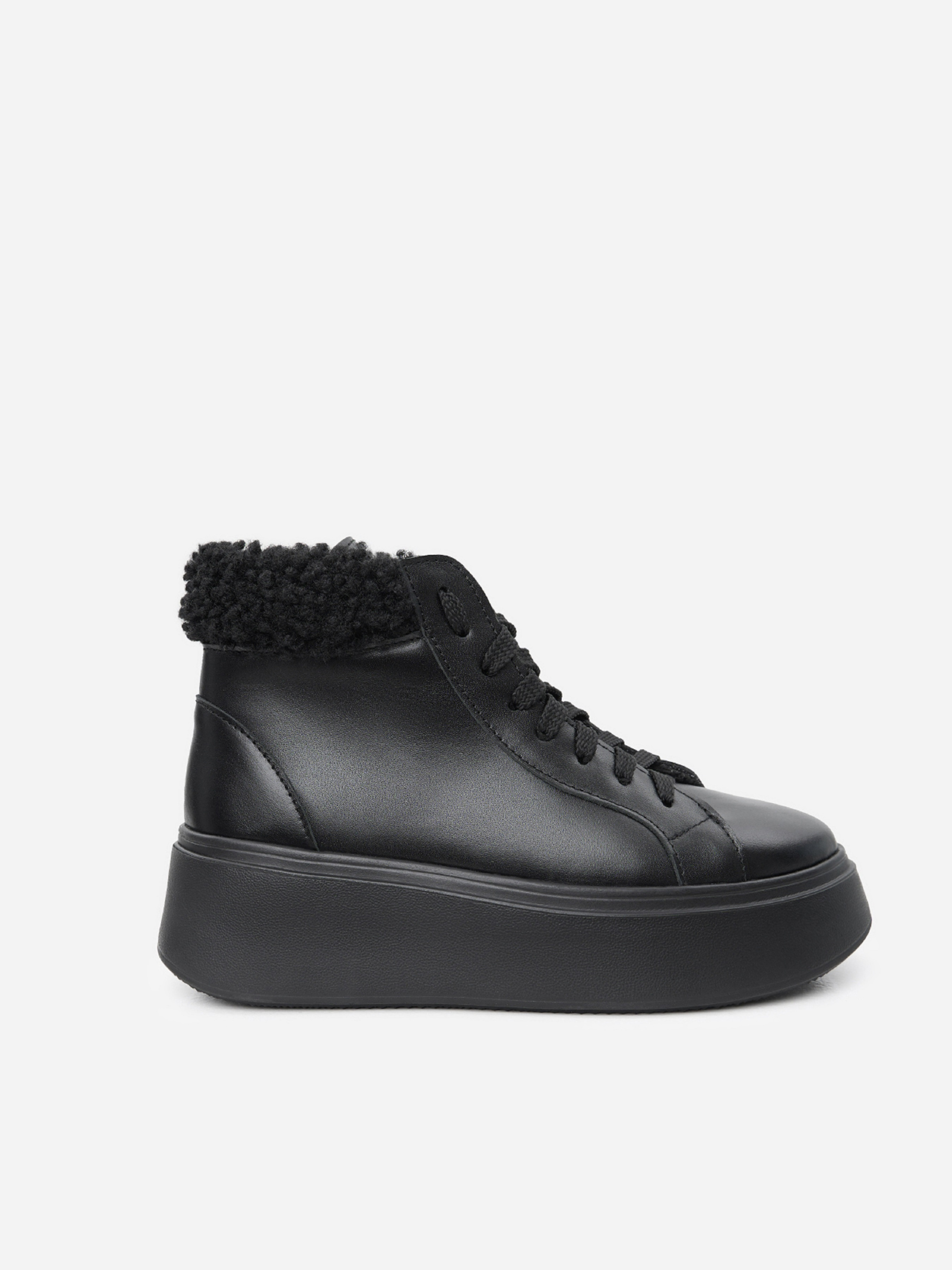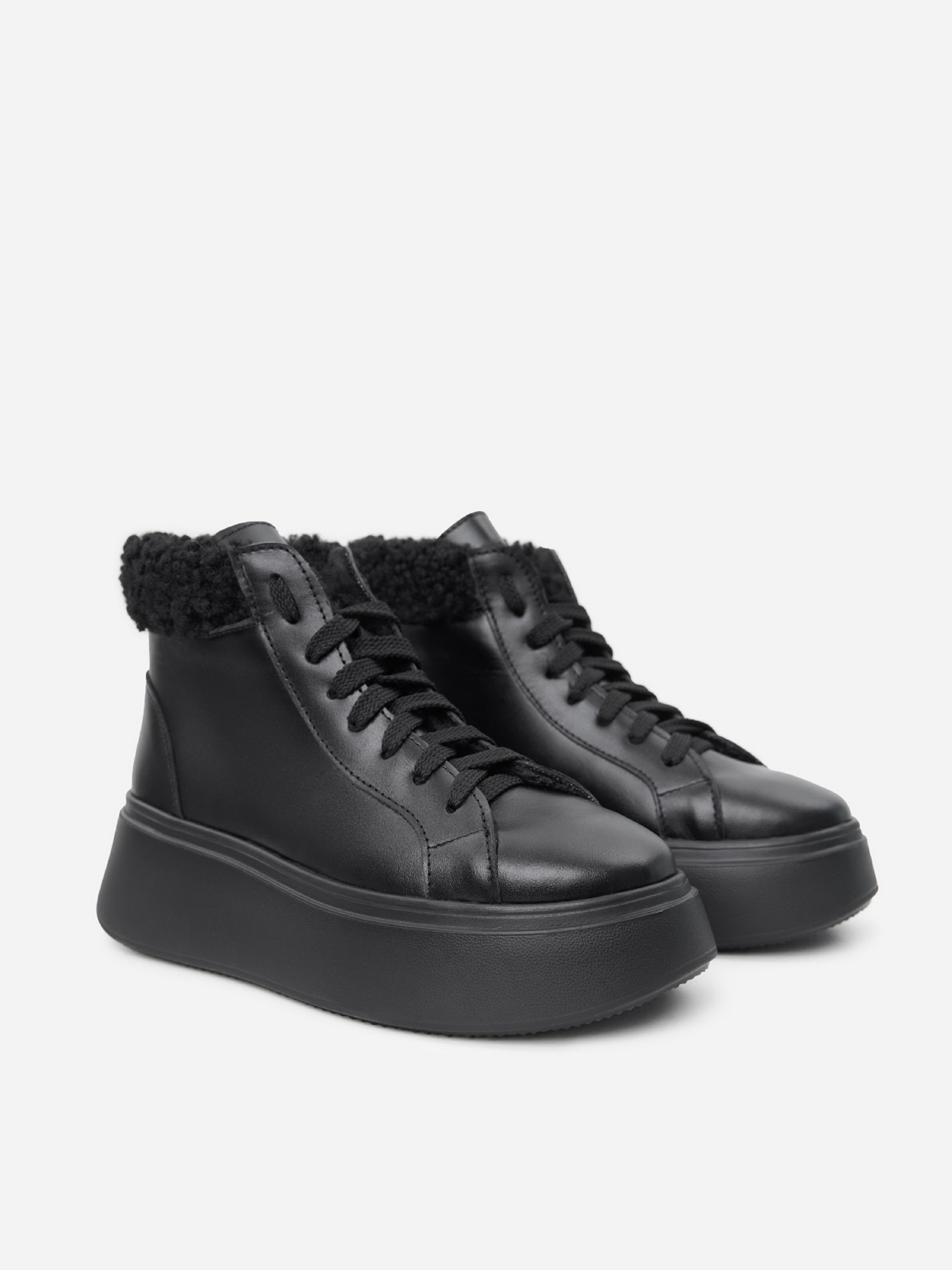 Чорні черевики у спортивному стилі зі шнурівкою та хутряним манжетом. Модель на платформі виготовлена з натуральної шкіри на хутрі. Матеріал верху: натуральна шкіра. Підклад: хутро штучне. Підошва: Ева. Висота підошви: 5,5 см та 4 см. Висота черевиків: 10,5 см. Заміри: 36 (23,5), 37 (24), 38 (24,5), 39 (25), 40 (25,5), 41 (26)