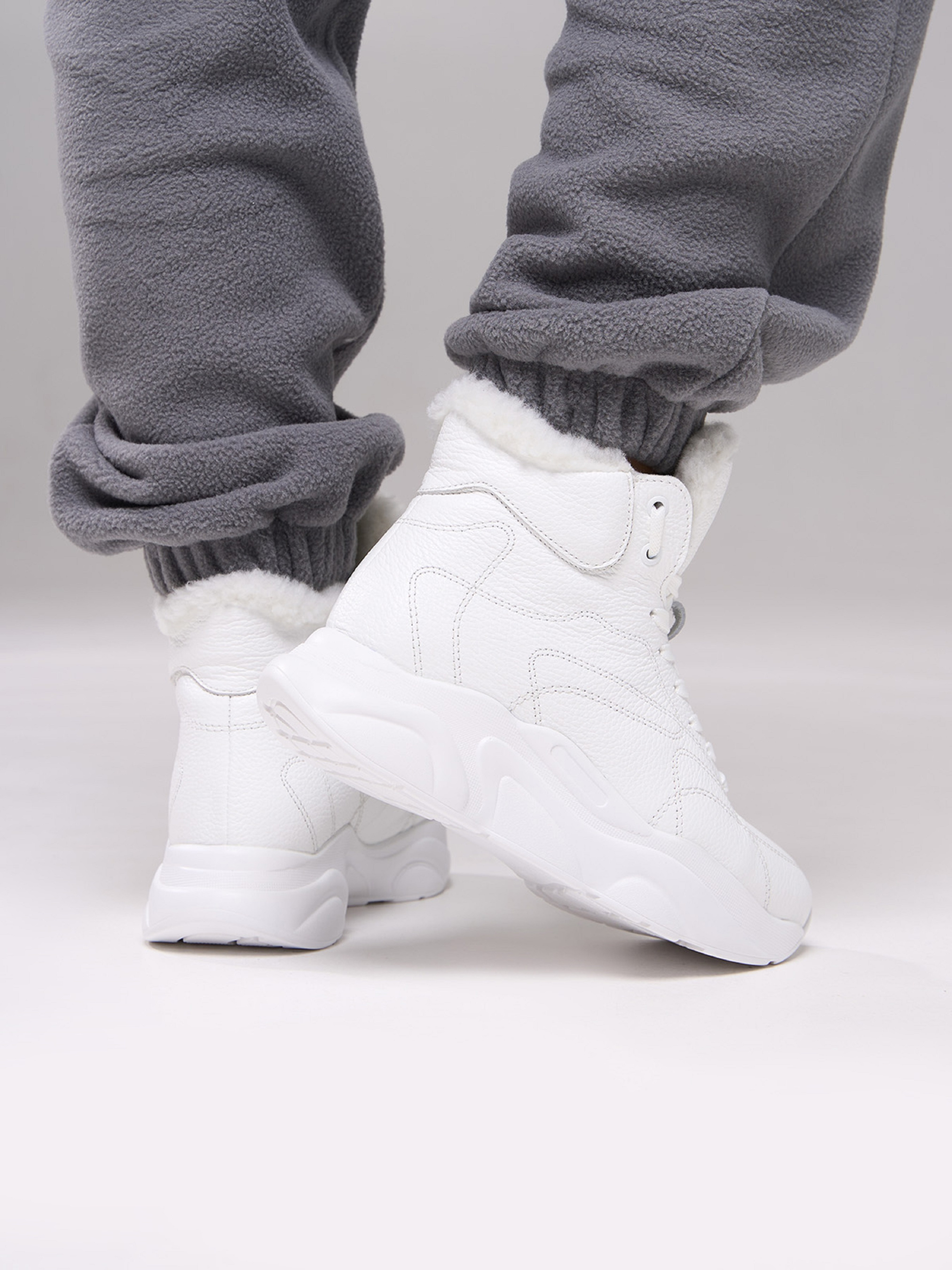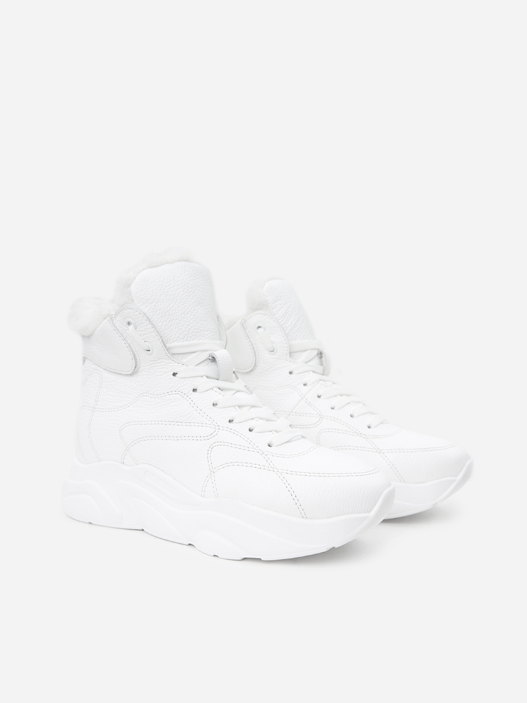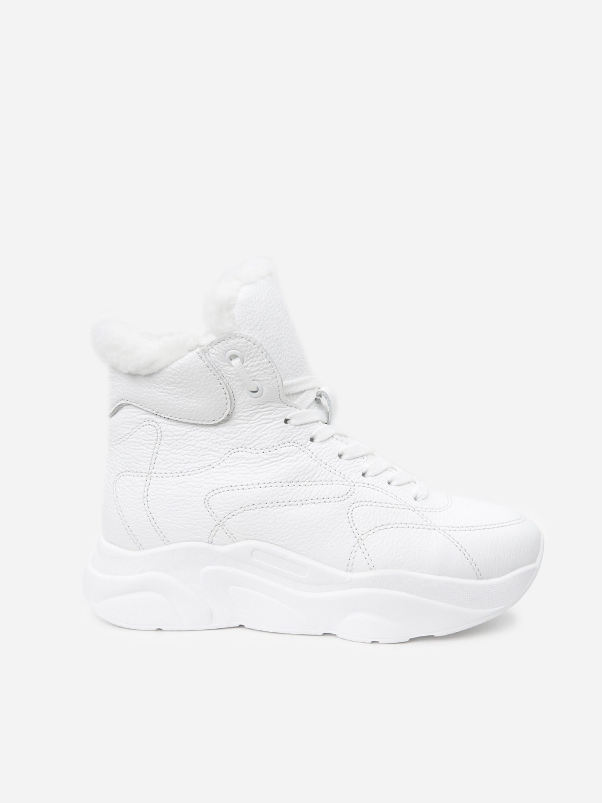 Білі напівчеревики у спортивному стилі, виконані із зернистої натуральної шкіри на хутрі. Черевики на високій підошві з подовженим язичком та шнурівкою. Матеріал верху: натуральна шкіра. Підклад: хутро штучне. Підошва: PU (поліуретан). Висота підошви: 4 см та 3 см. Висота черевиків: 9,5 см. Заміри: 36 (23,5), 37 (24), 38 (24,5), 39 (25), 40 (25,5), 41 (26)