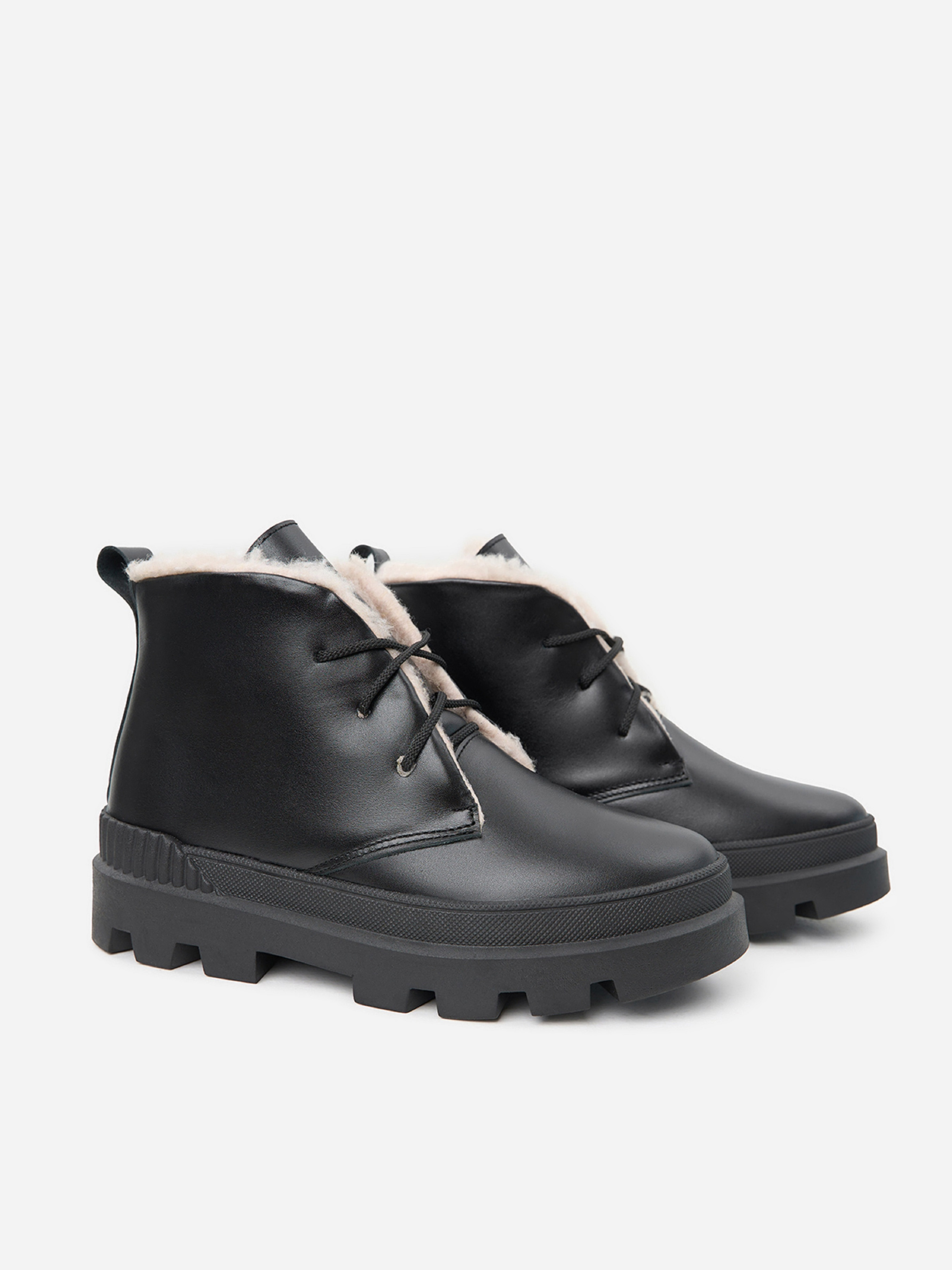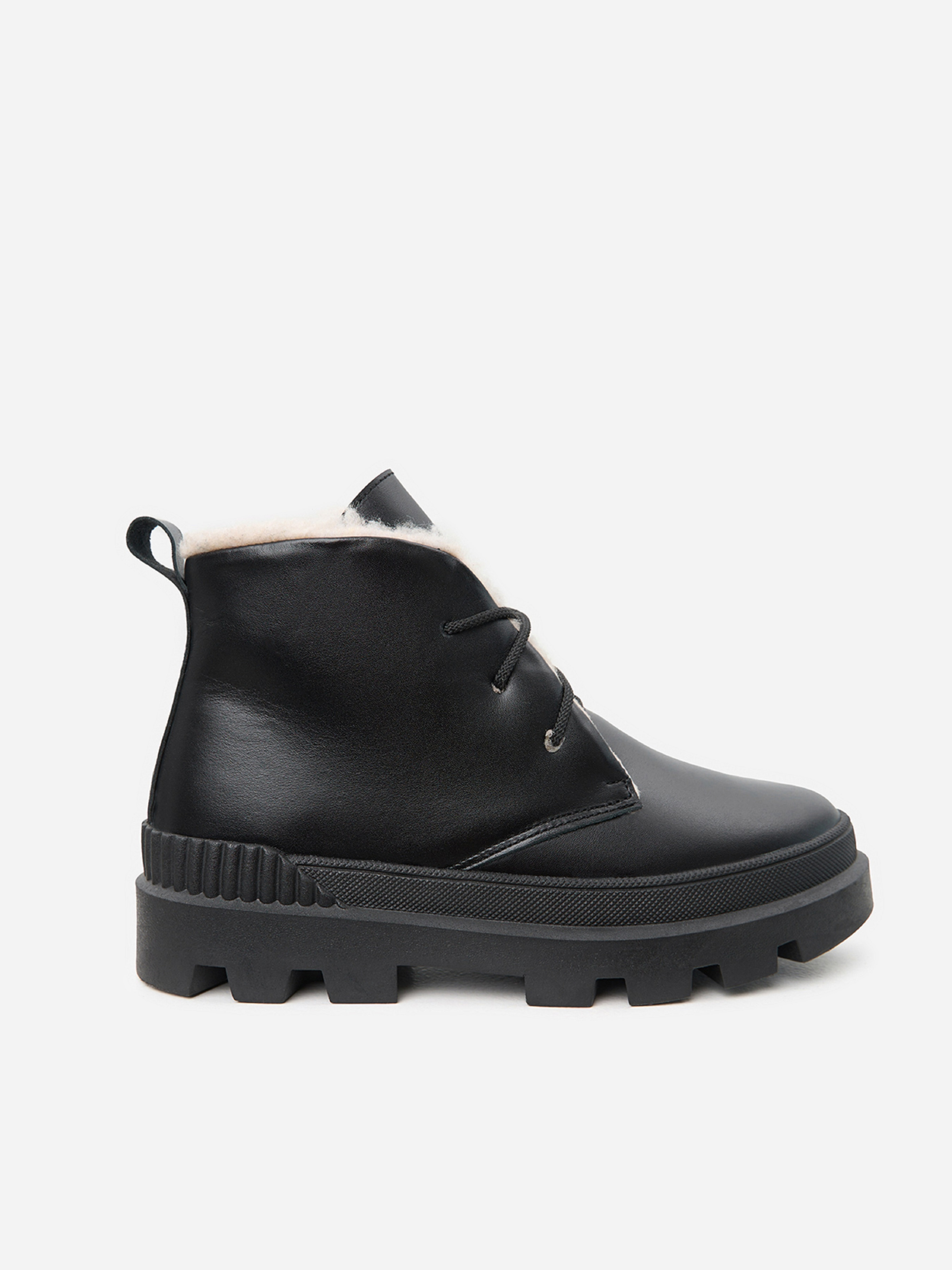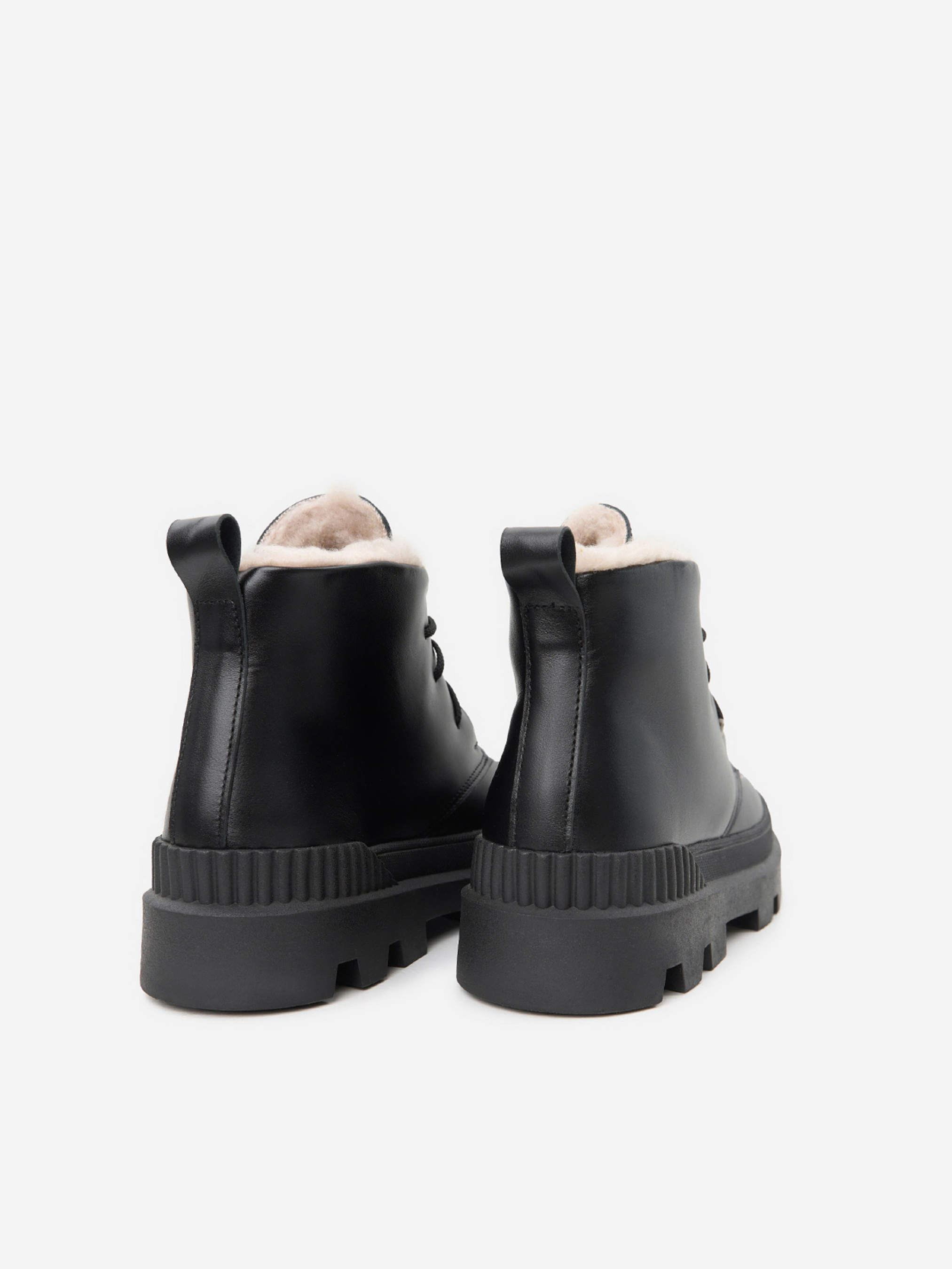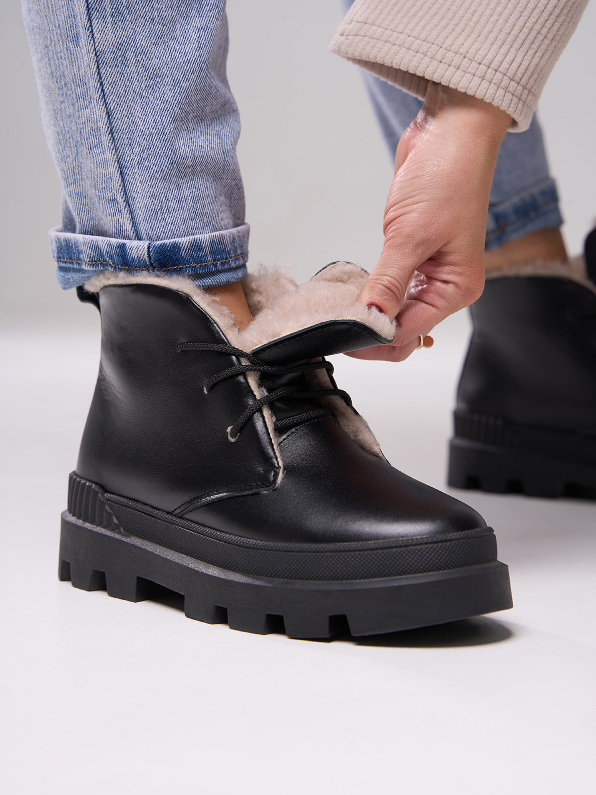 Чорні шкіряні черевики на хутрі зі шнурівкою. Модель на платформі з петлицею позаду. Матеріал верху: натуральна замша. Підклад: хутро штучне. Підошва: TR (терморезина). Висота підошви: 5 см та 3,5 см. Висота черевиків: 9,5 см. Заміри: 36 (23,5), 37 (24), 38 (24,5), 39 (25), 40 (25,5), 41 (26)