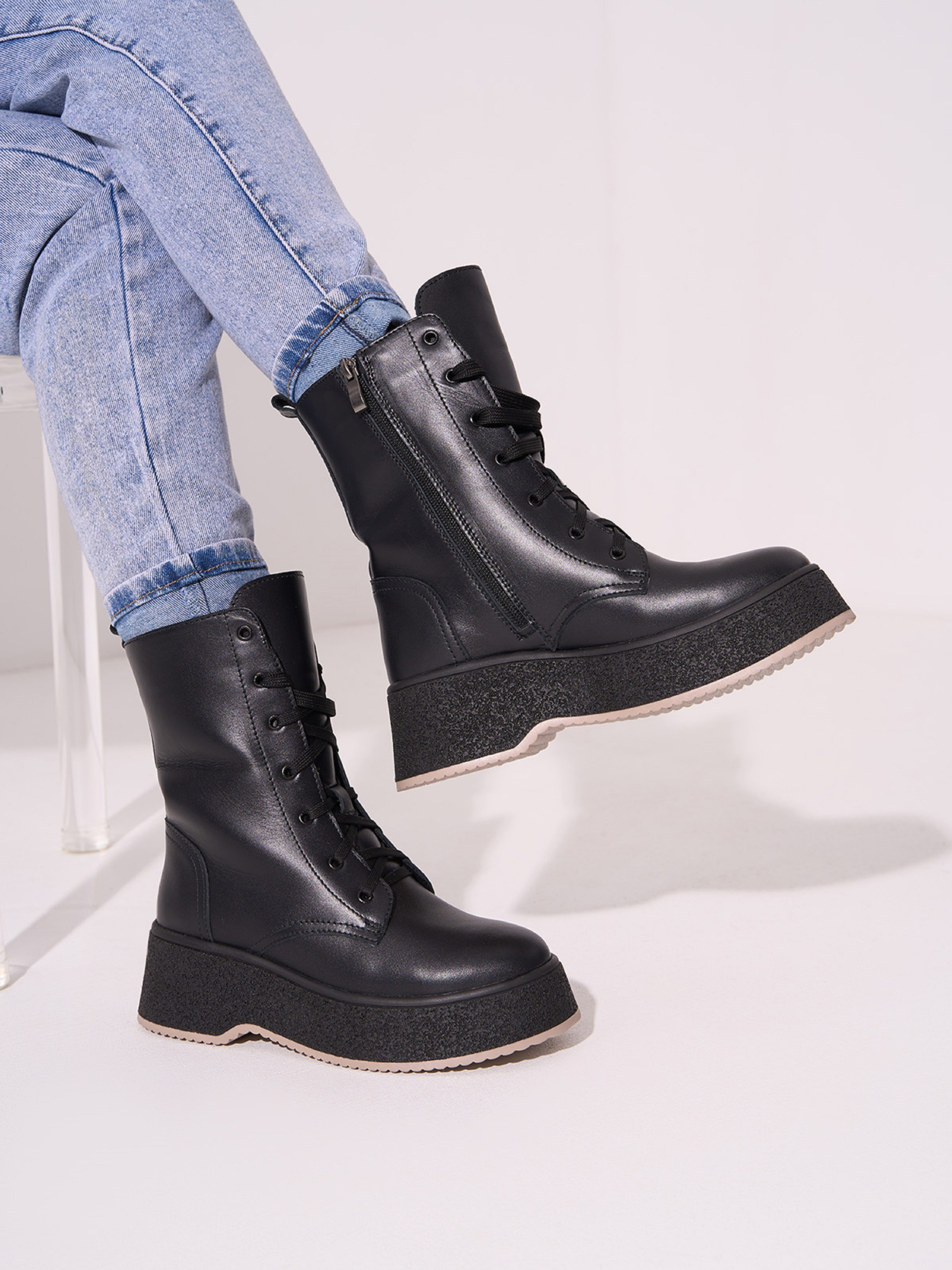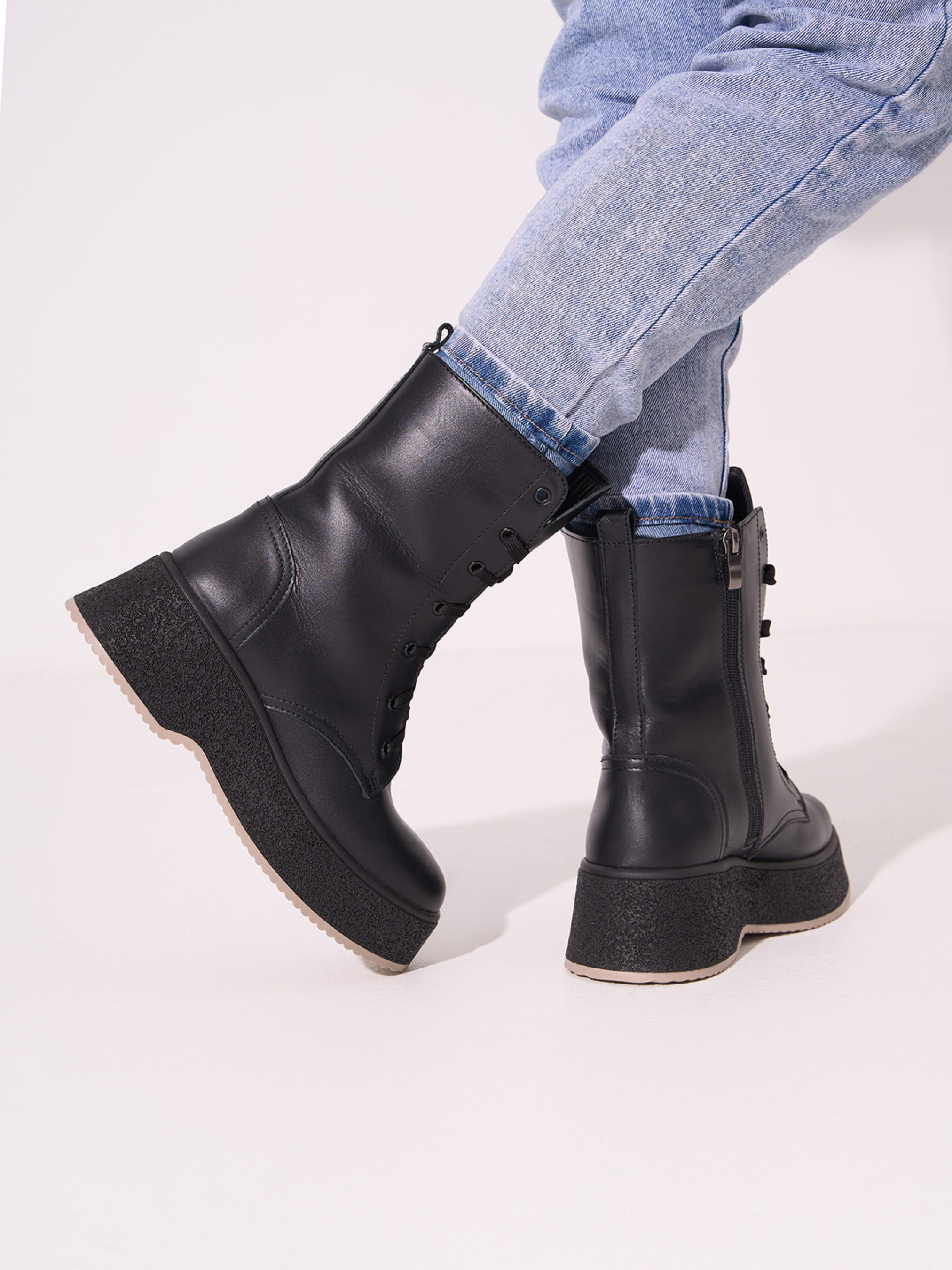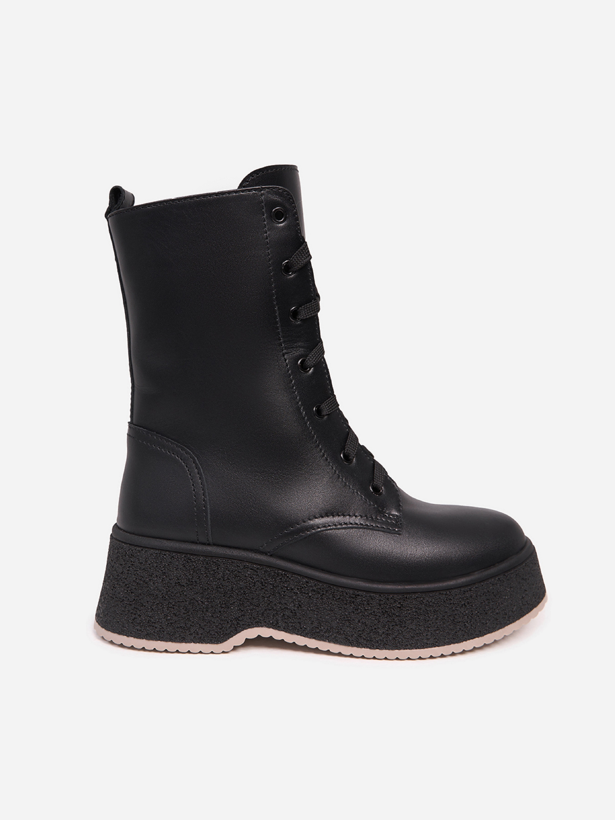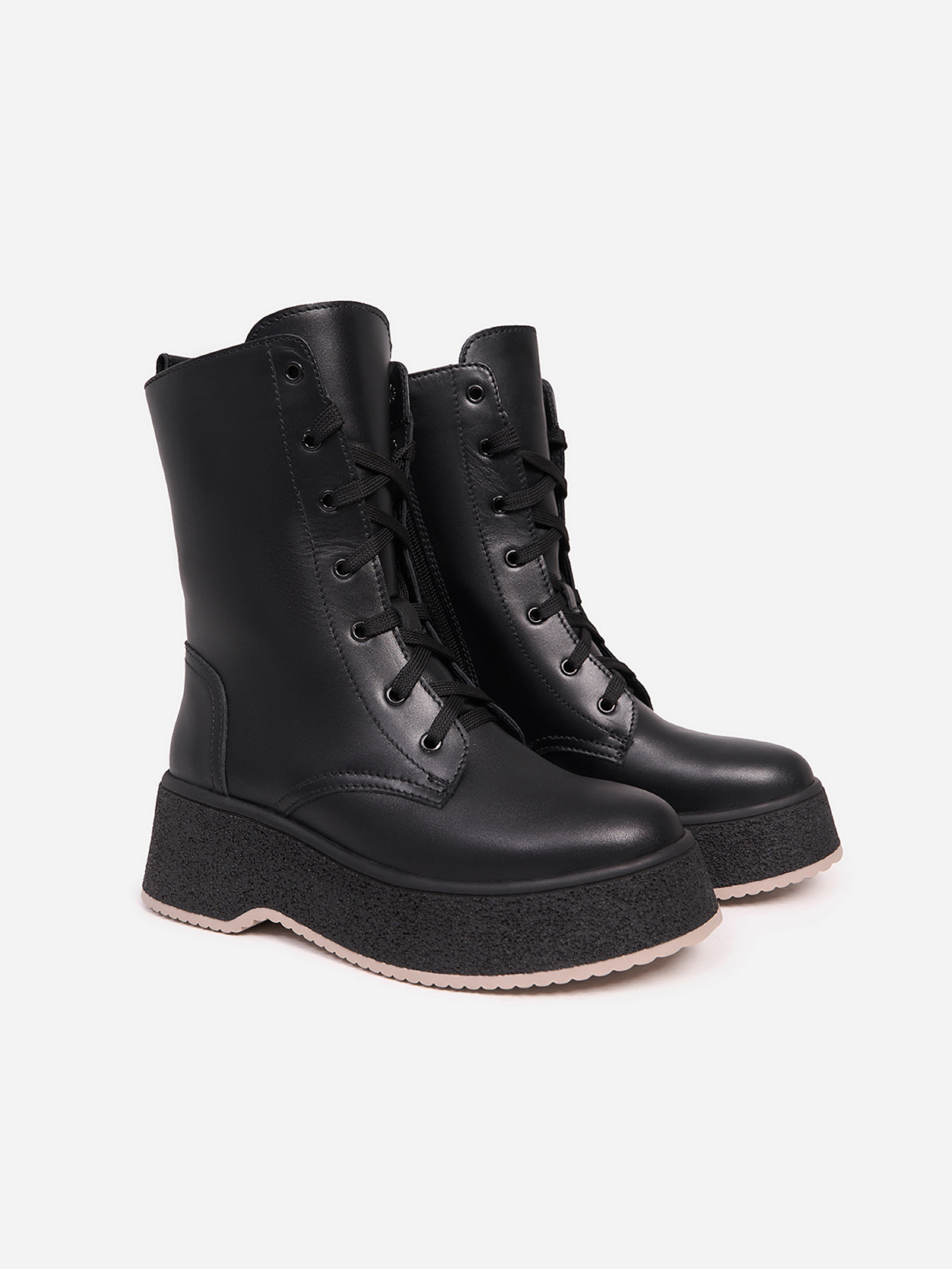 Високі чорні черевики берці на платформі, виготовлені зі шкіри на хутряному утеплювачі. Черевики зі шнурівкою, бічною блискавкою та задньою петлицею. Матеріал верху: натуральна шкіра. Підклад: хутро штучне. Підошва: TR (терморезина). Висота підошви: 6 см та 4 см. Висота черевиків: 16,5 см. Заміри: 36 (23,5), 37 (24), 38 (24,5), 39 (25), 40 (25,5), 41 (26)
