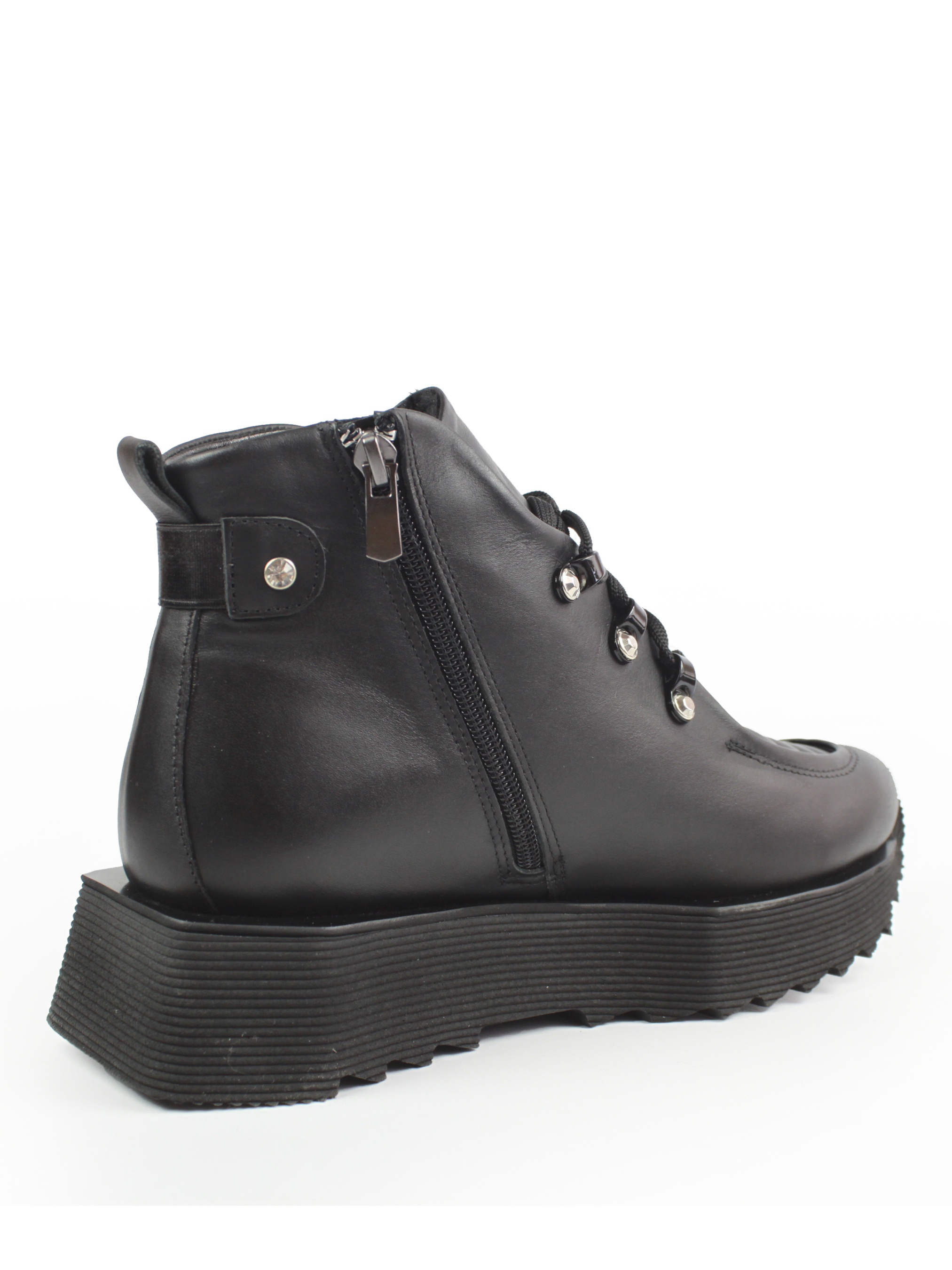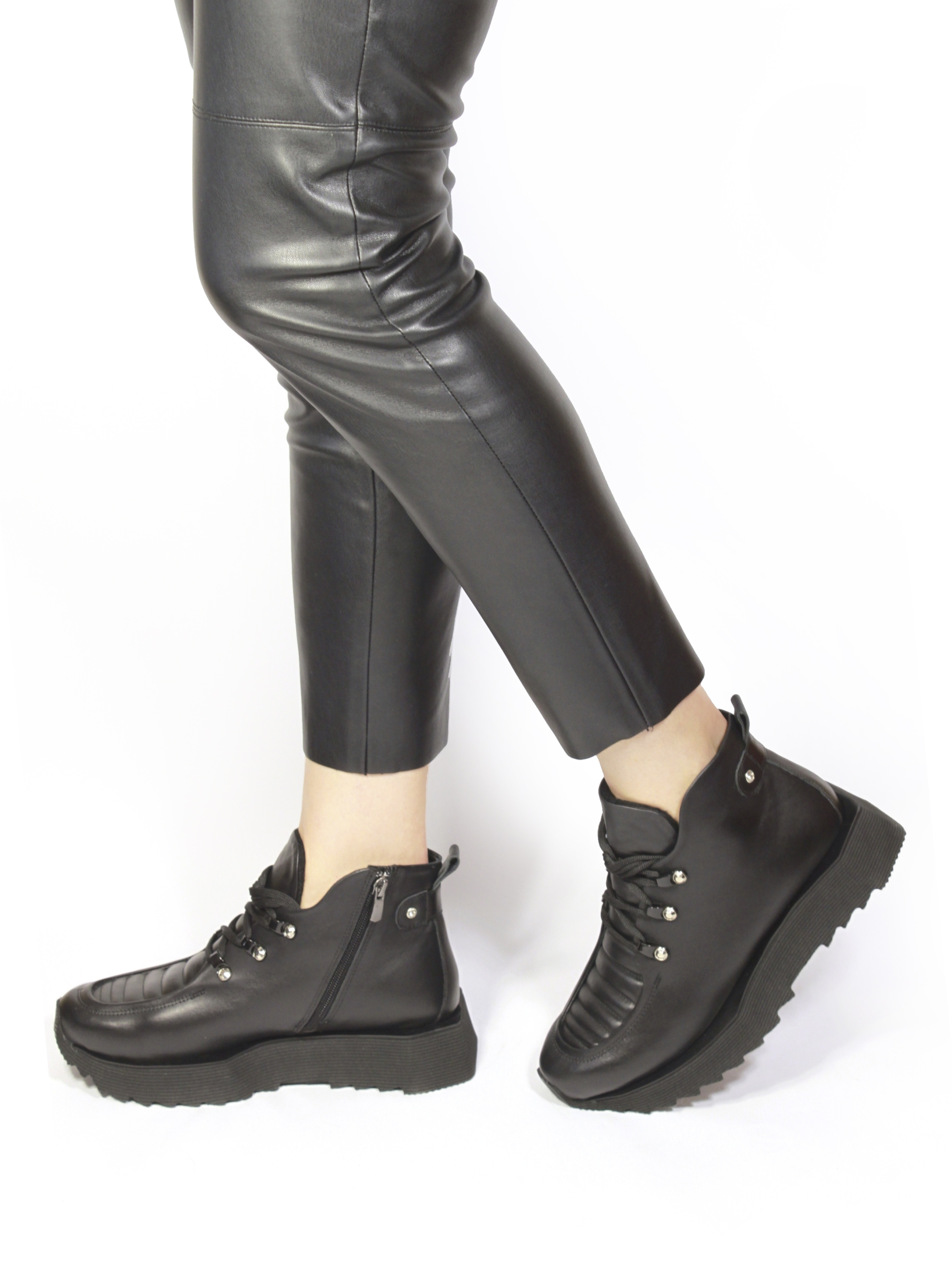 Ці жіночі черевики поєднують спортивний стиль і сучасний дизайн, що робить їх чудовим варіантом для активного способу життя. Виконані з чорної гладкої шкіри, вони відрізняються своїм оригінальним зовнішнім виглядом з прошитими деталями на передній частині. Модель має товсту рифлену підошву, що забезпечує максимальний комфорт і хорошу амортизацію під час ходьби. Декоративні металеві елементи та система шнурівки додають сучасного акценту до загального вигляду. Високий верх надійно фіксує ногу, роблячи ці черевики ідеальним вибором для прохолодної погоди. Розмірна сітка 36р-23,5 37р-24 см 38р-24,5см 39р-25 см 40р-25,5см.