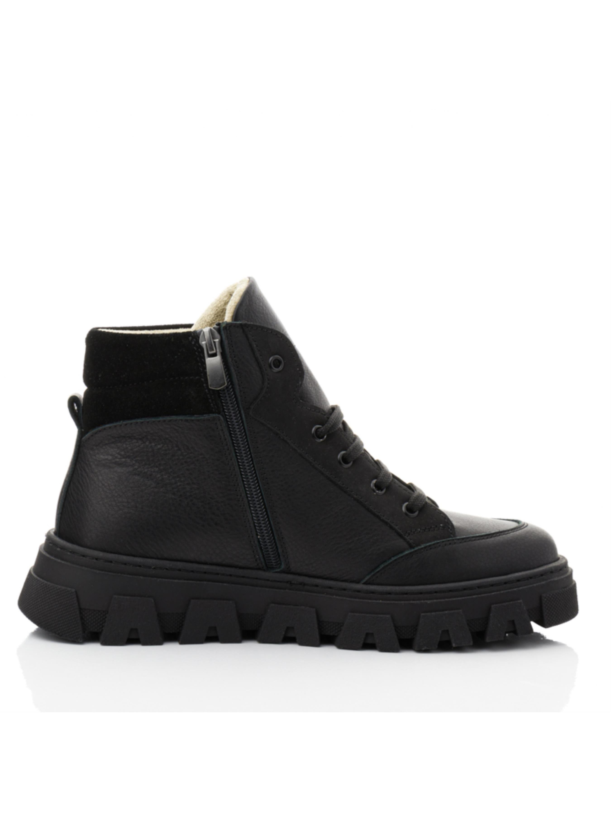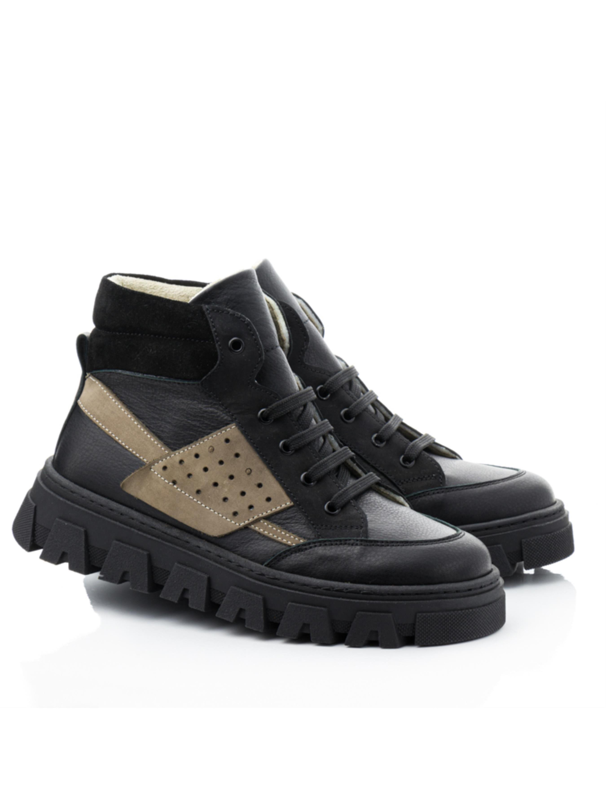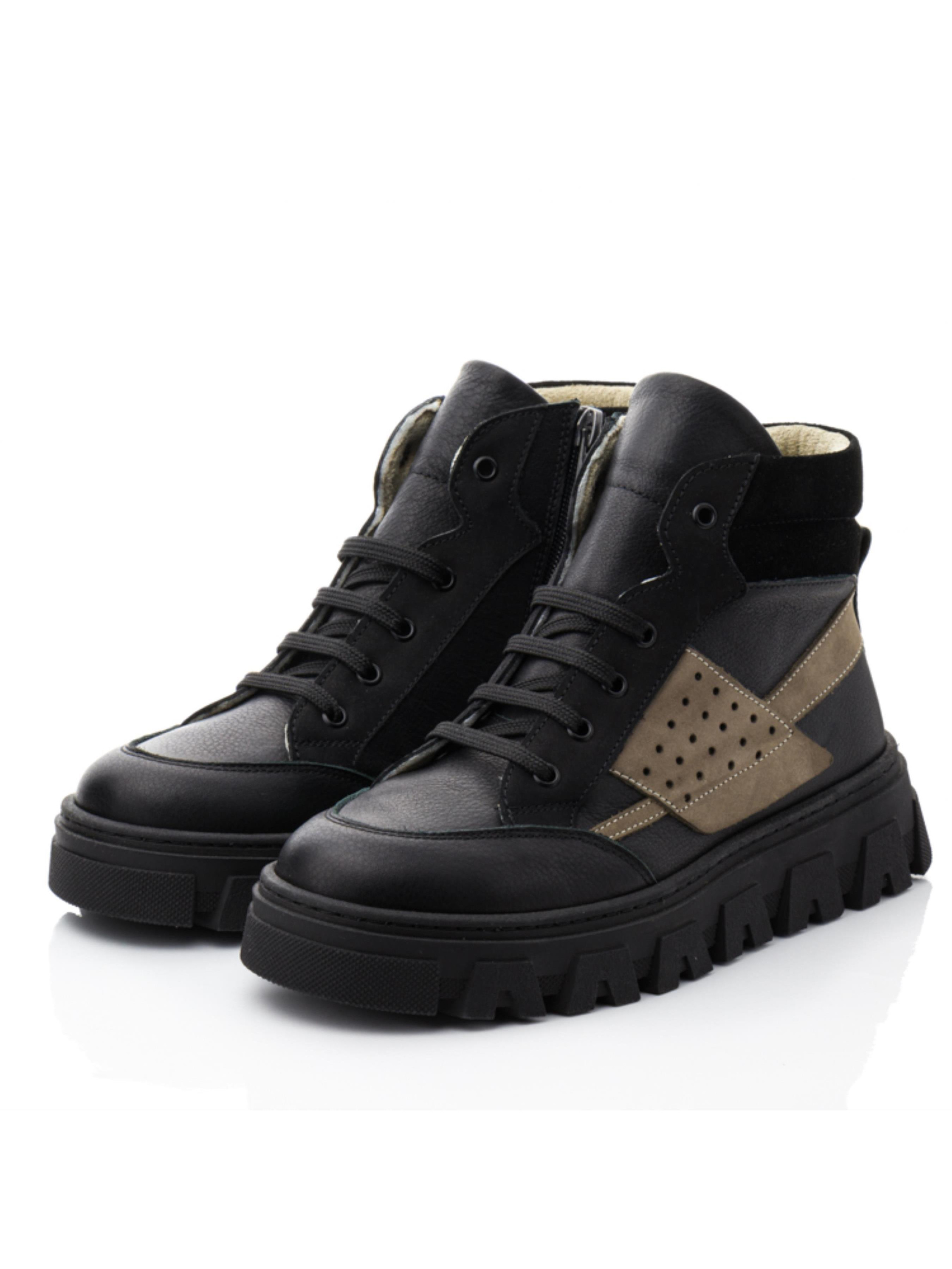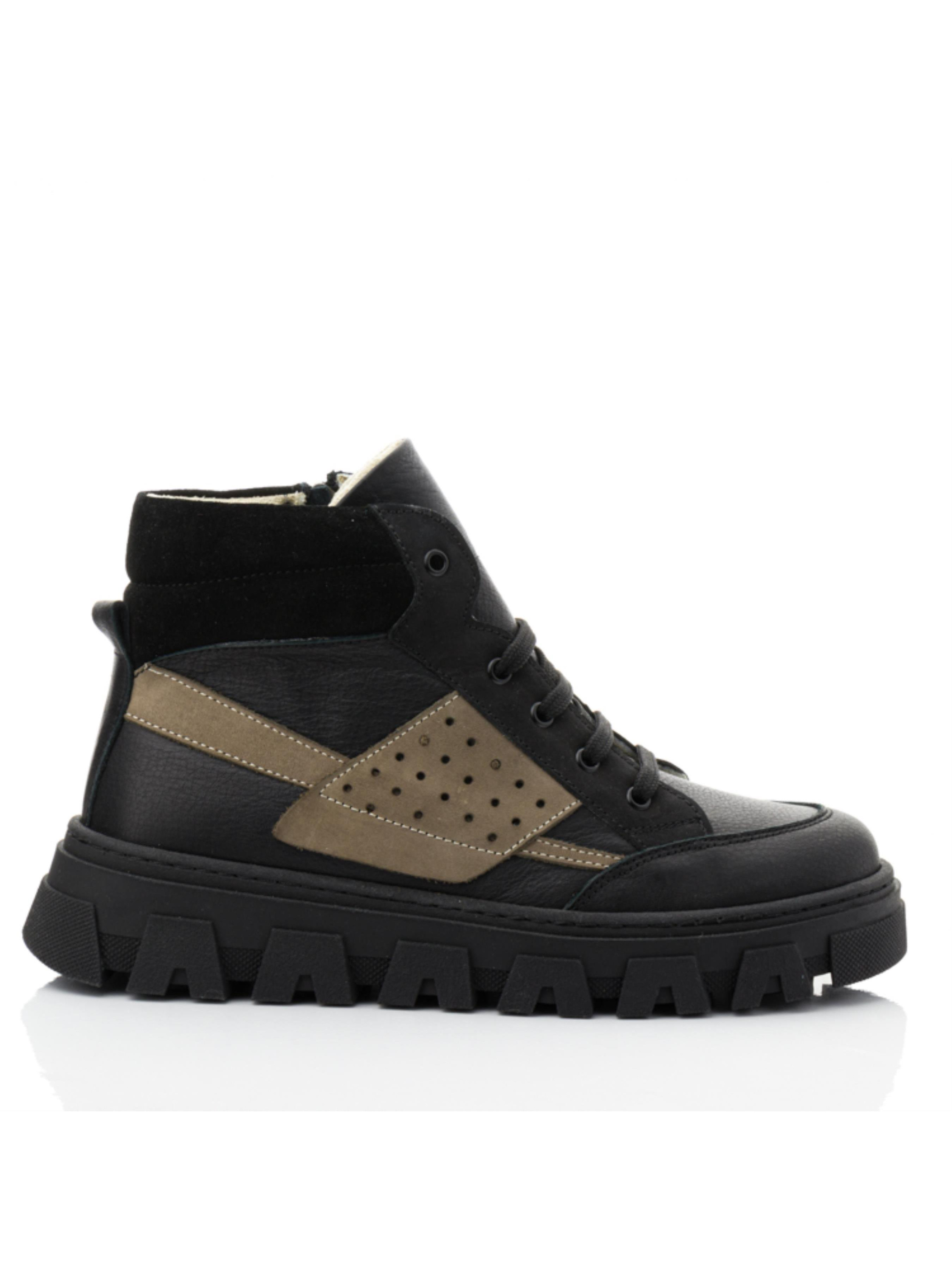 Демісезонні черевики для підлітків Papi Ці стильні хай-топи від бренду Papi — ідеальний вибір для підлітків у демісезонний період. Верх черевиків виконаний із натуральної шкіри, доповнений вставкою з нубуку сірого кольору та чорного замшу на п’ятці, що надає взуттю сучасного та виразного вигляду. Внутрішня підкладка з м’якого флісу забезпечує тепло та комфорт навіть у прохолодну погоду. Міцна підошва з глибоким протектором гарантує чудове зчеплення з поверхнею, що робить черевики зручними для прогулянок у будь-яку погоду. Класична шнурівка плюс бокова блискавка дозволяє точно відрегулювати посадку черевиків на нозі. Кольорова гама в чорних тонах із сірими акцентами робить цю модель універсальною, підходящою як для повсякденного носіння, так і для більш офіційного стилю. Ці демісезонні черевики чудово поєднують стиль і практичність, даруючи підліткам комфорт і впевненість у кожному кроці.