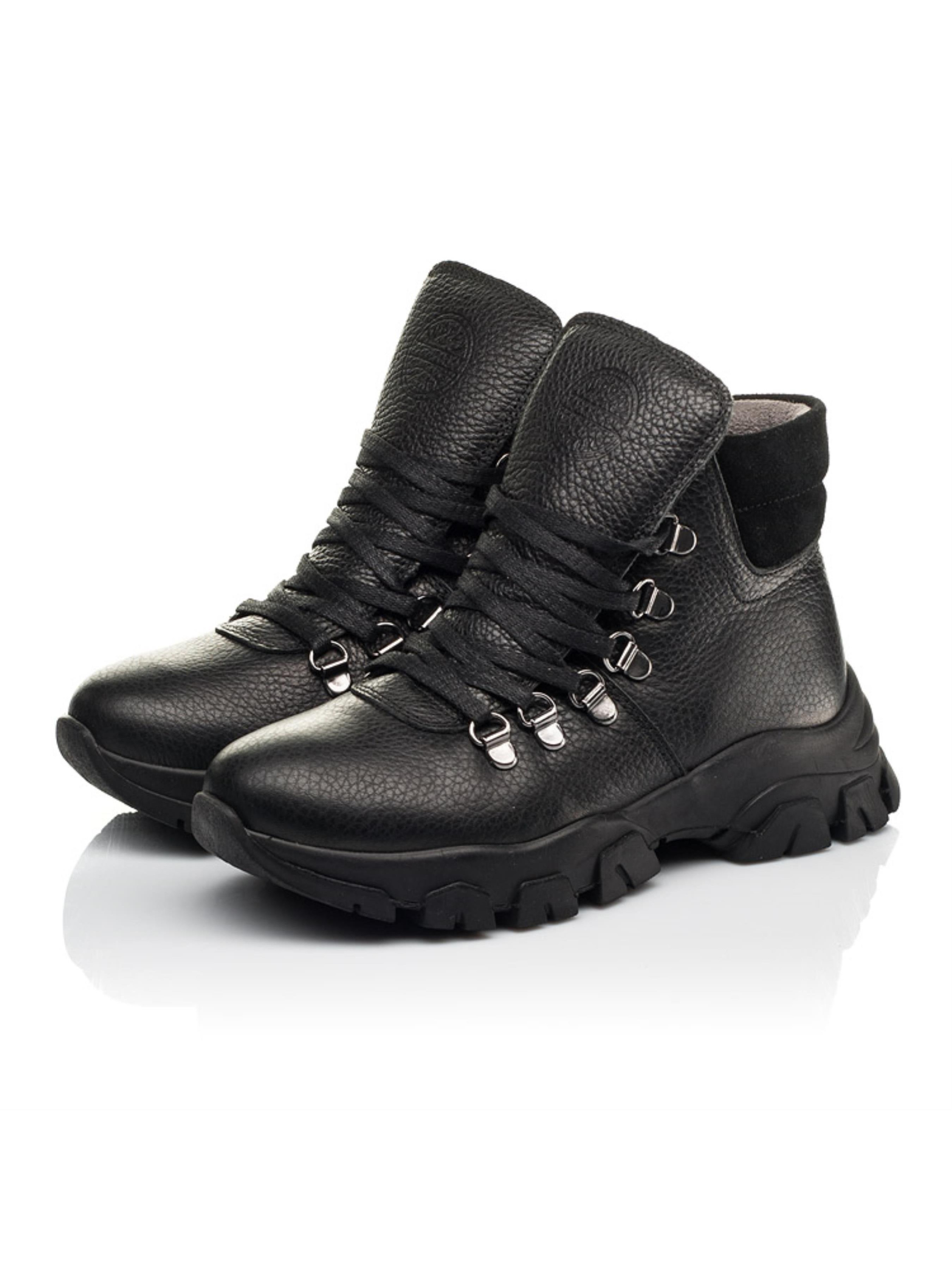 Мінімалістична модель демісезонного взуття без зайвих деталей пошита з натуральної шкіри класичного чорного кольору. Матеріал підкладки - фліс, устілка шкіряна. Дитячі демісезонні черевики для хлопчика пошиті з врахуванням таких складових дитячого взуття: жорсткий задник, супінатор та анатомічно правильна устілка. Зручність взування забезпечить бокова блискавка, а шнурівка надійно зафіксує ніжку у взутті та дозволить відрегулювати повноту. Дизайнерським доповненням моделі виступає вставка з натуральної замші та сучасна рифлена підошва. Особливим акцентом виступають металеві петлі для шнурівки.