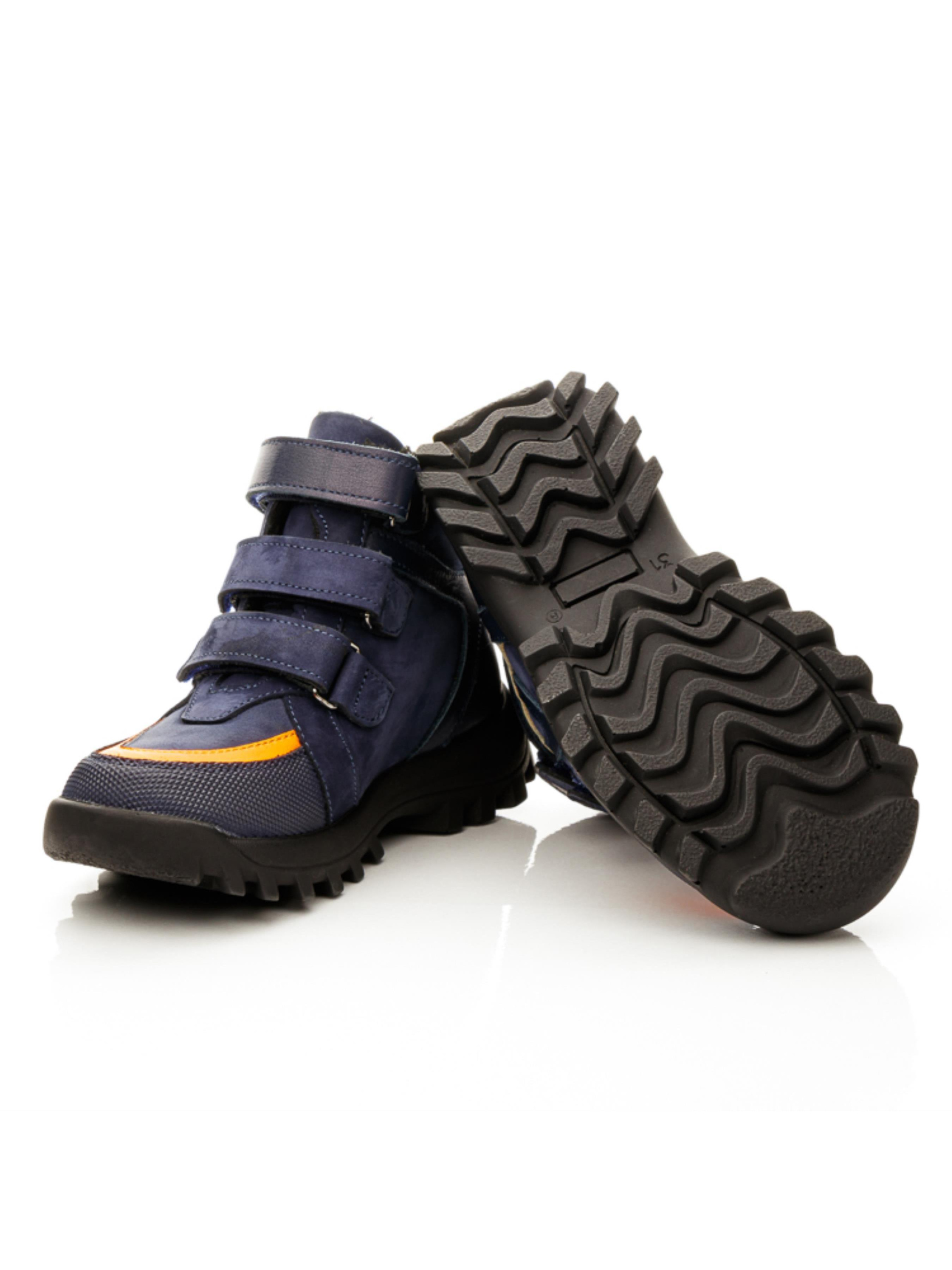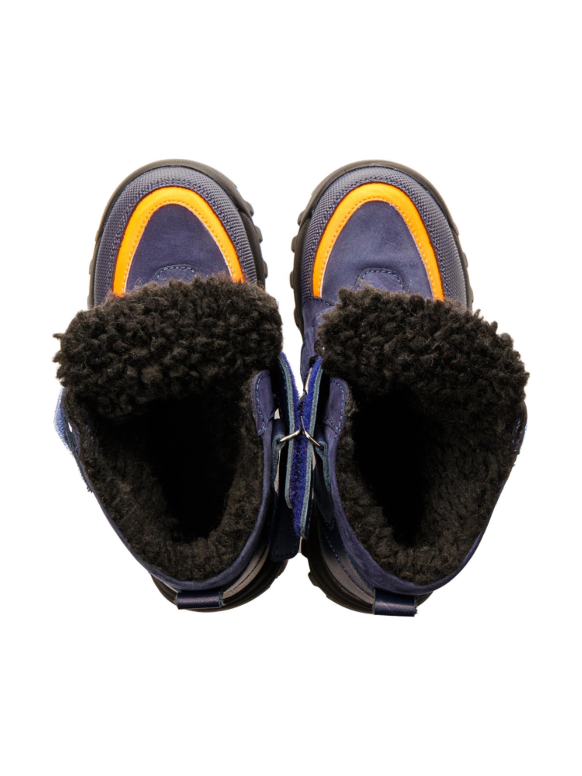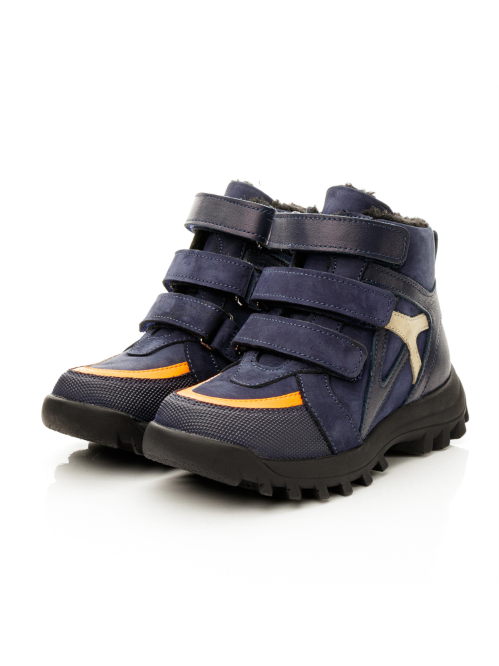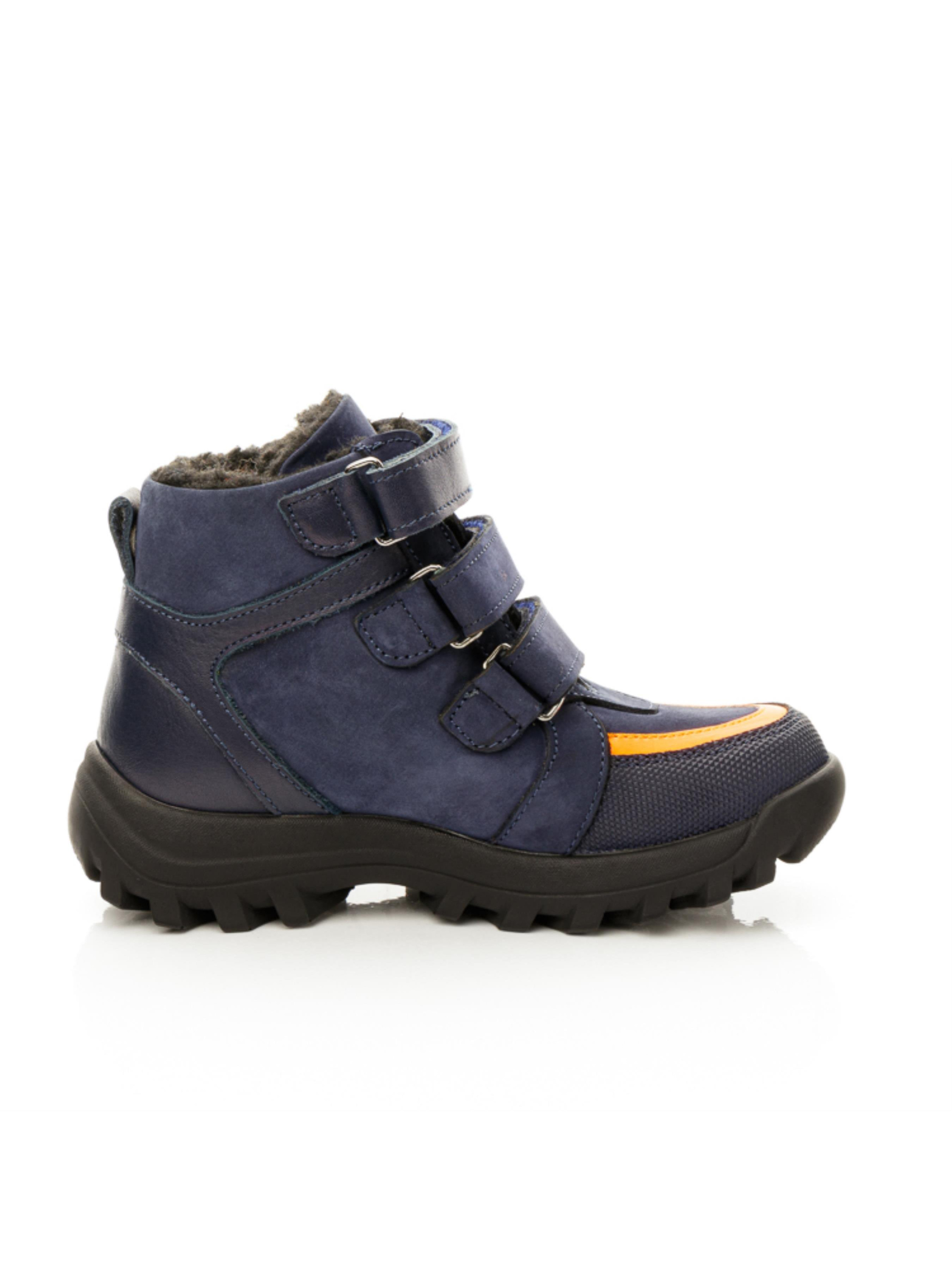 Раді представити Вам нашу новинку зимової колекції 2022. Максимально легкі та зручні дитячі зимові черевики для хлопчика пошиті з натурального нубука приємного темно-синього кольору, всередині утеплені натуральною вовною. Температурний режим такої моделі до -10 градусів. Контрастним акцентом пари виступають вставки з натуральної шкіри синього та насиченого помаранчевого кольору. Бокову частину черевик прикрашає вставка з натурального нубука бежевого кольору, носочок захищено "неубивайкою". Спосіб застібання - 3 надійні липучки. Головними комфортними елементами пари є жорсткий задник, супінатор та анатомічно правильна устілка.