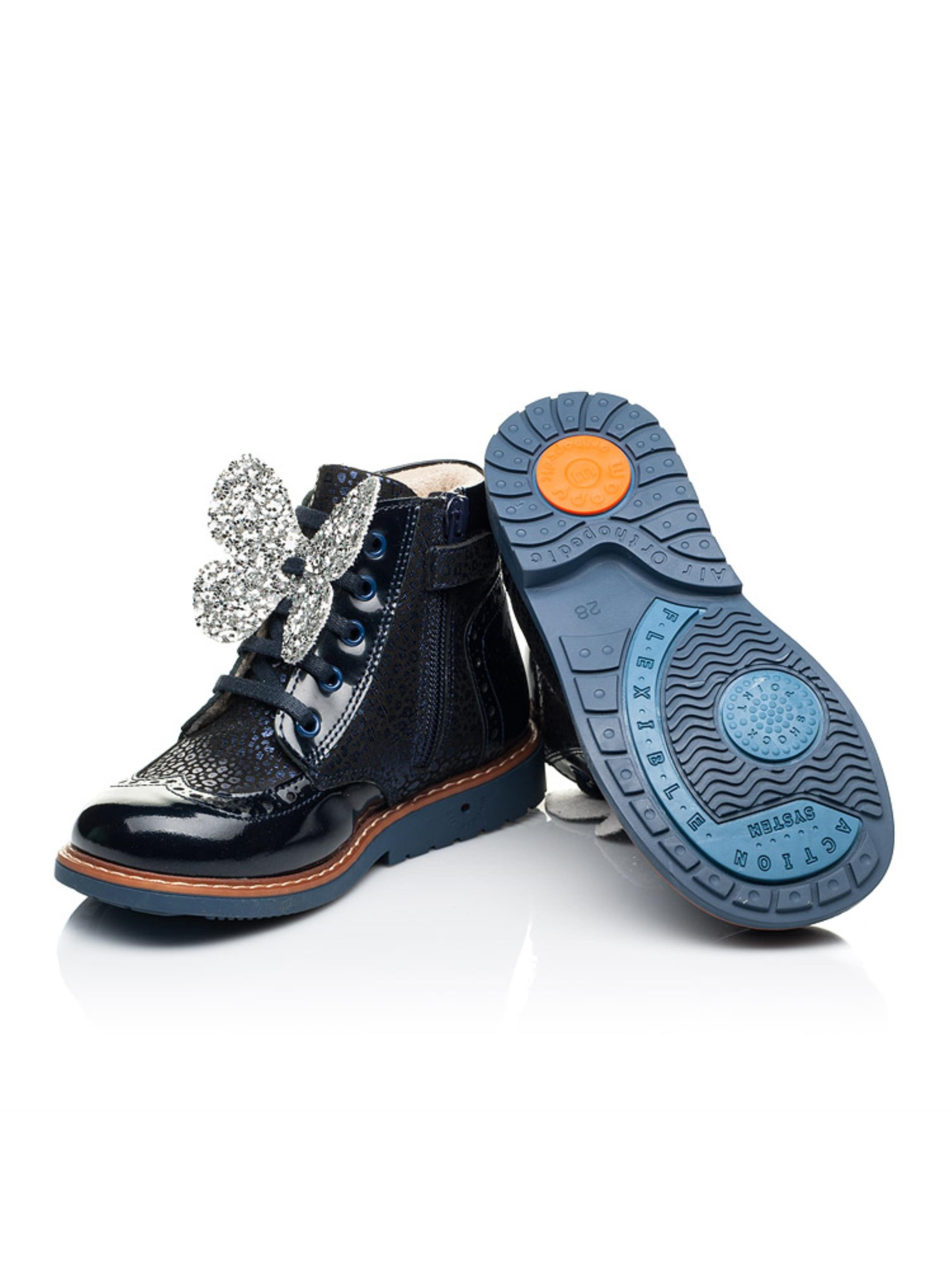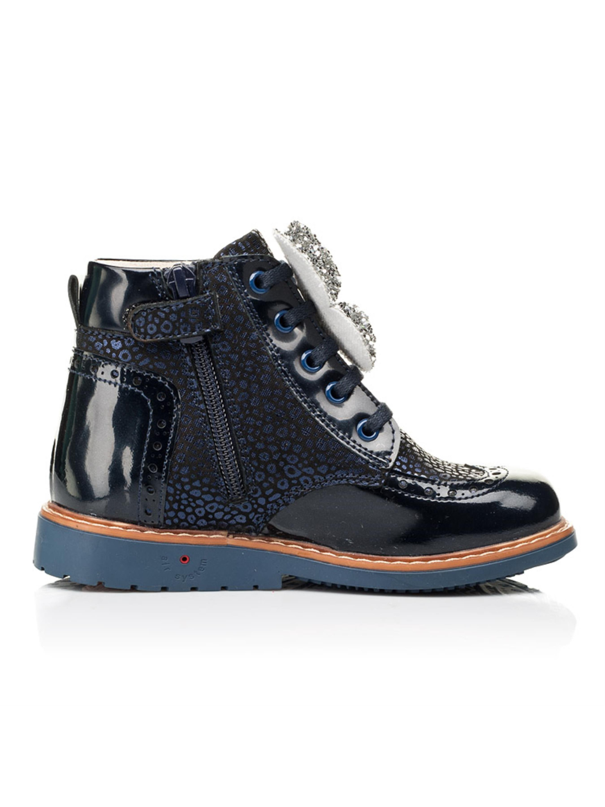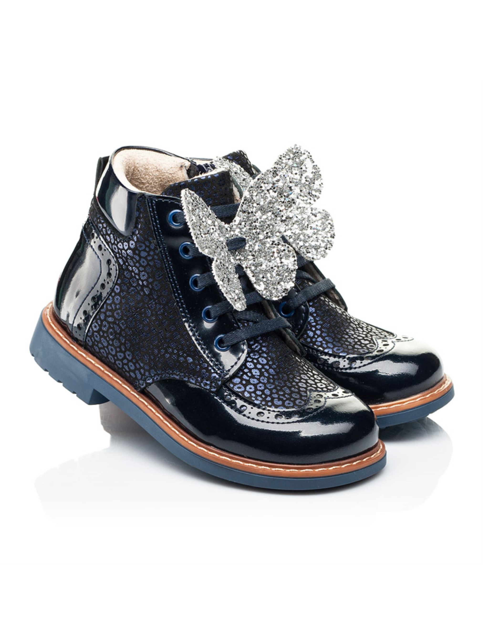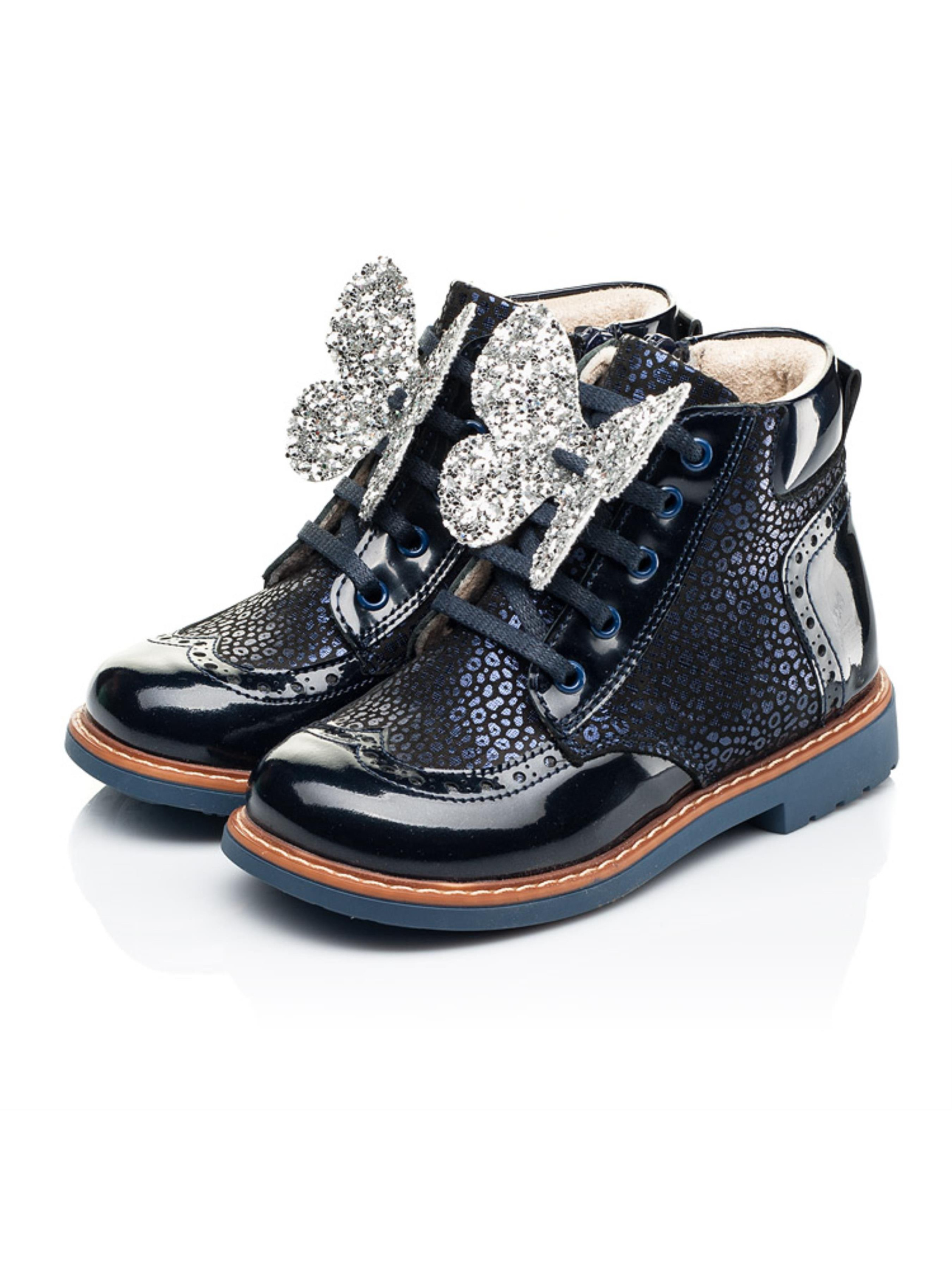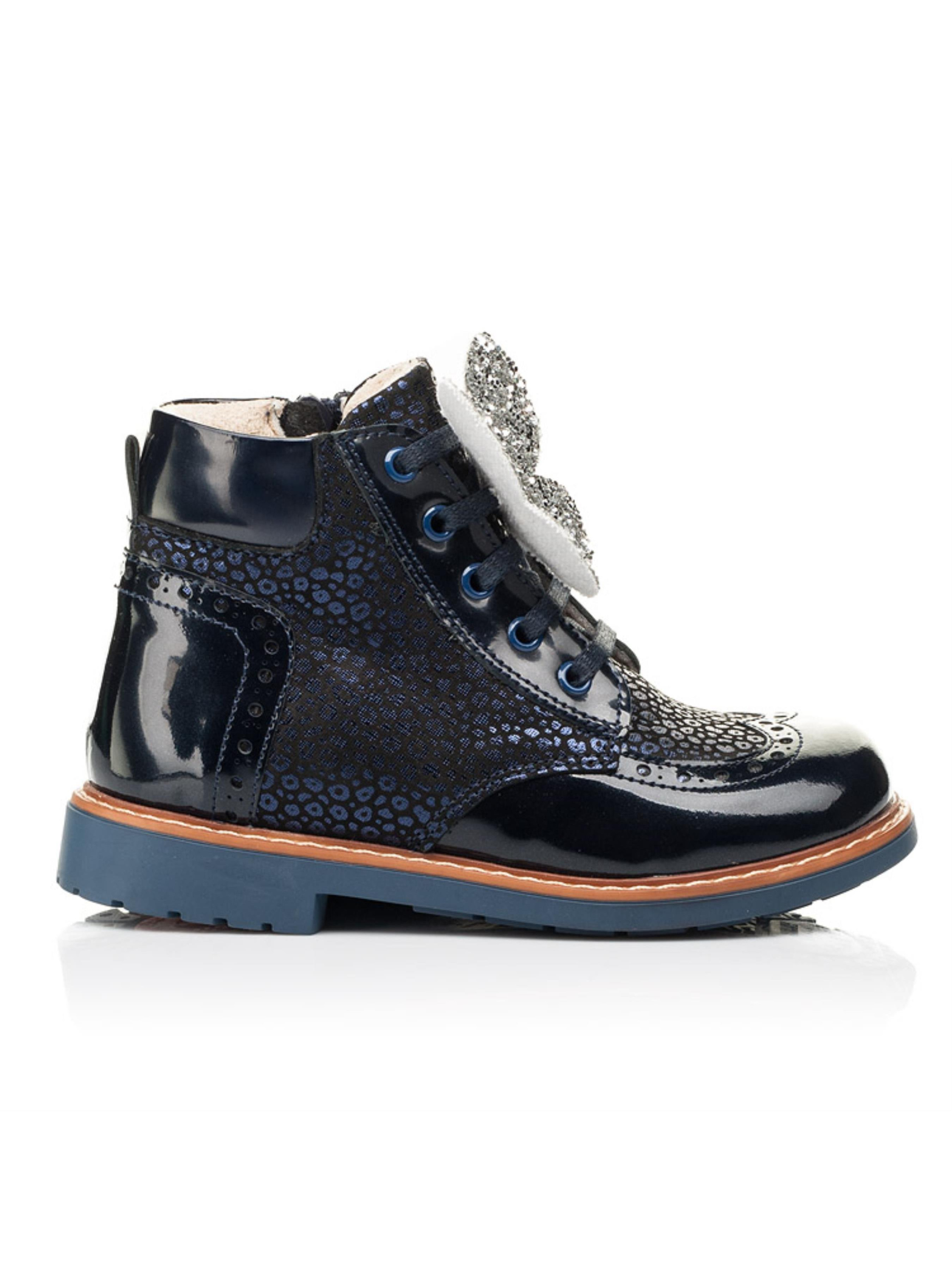Милі та в той час надзвичайно комфортні демісезонні черевики для дівчинки вражають поєднанням фактур та зручністю. Дитячі демісезонні черевики для дівчинки пошиті з натурального нубука темно-синього кольору та доповнені вставками з натуральної лакованої шкіри. Матеріал підкладки - фліс, який забезпечить комфорт у прохолодну пору року. Головними комфортними деталями цієї пари демісезонного взуття виступають каблук Томаса, жорсткий задник, супінатор та анатомічна правильна устілка. Всі ці деталі надзвичайно важливі для правильного формування та розвитку дитячої стопи. Декоративним елементом виступає вставка з лакованої шкіри, яка доповнена стильною прошивкою та перфорацією. Візитною карткою моделі виступає леопардовий принт з переливом, який створено завдяки застосуванню напилення. Аби забезпечити комфортний процес взування Вашій крихітці в якості застібки використовується блискавка, яка для кращої фіксації ніжки доповнена шнурівкою. Ваша дівчинки буде в захваті від краси такої моделі демісезонного взуття, а Ви
