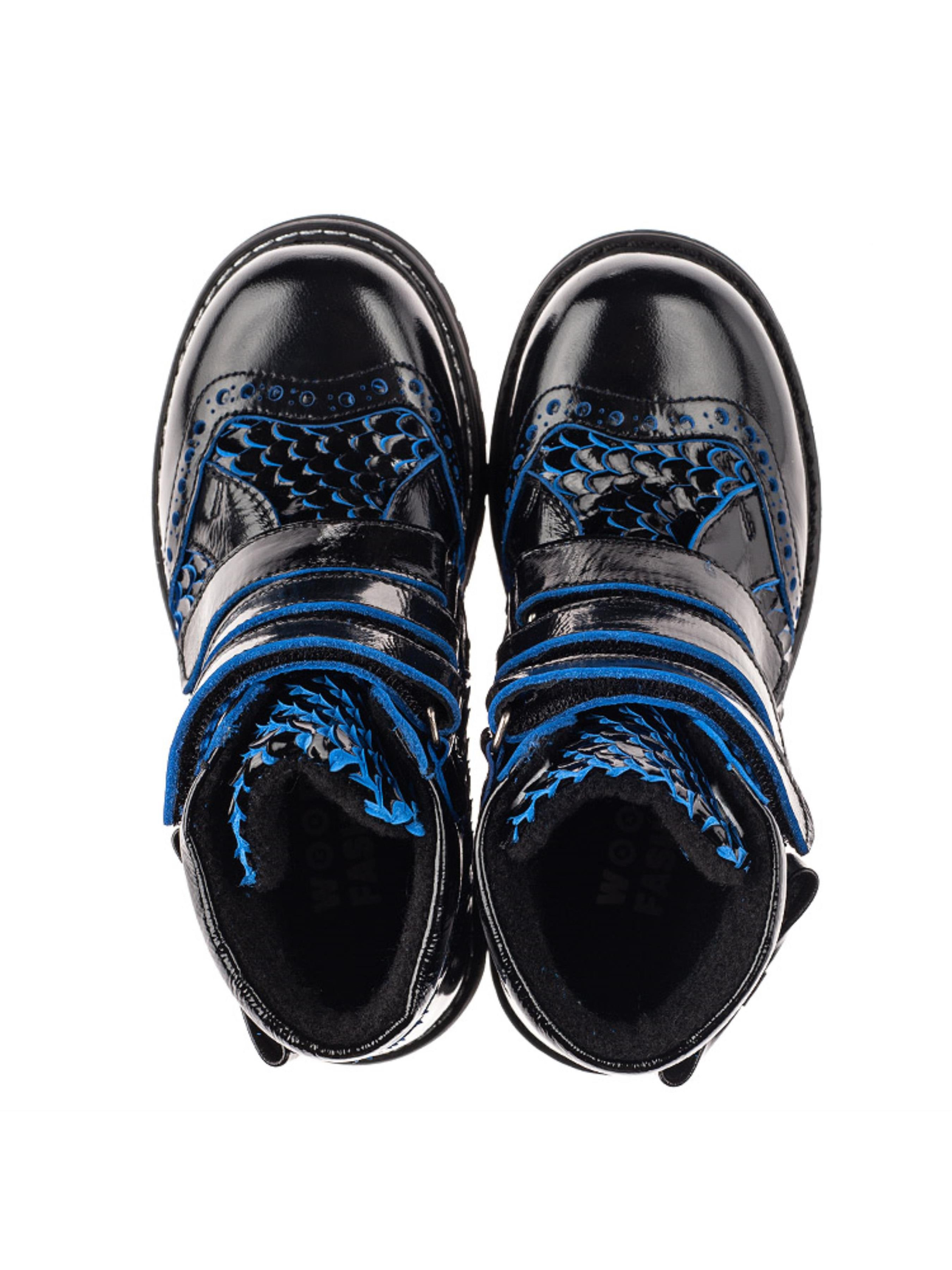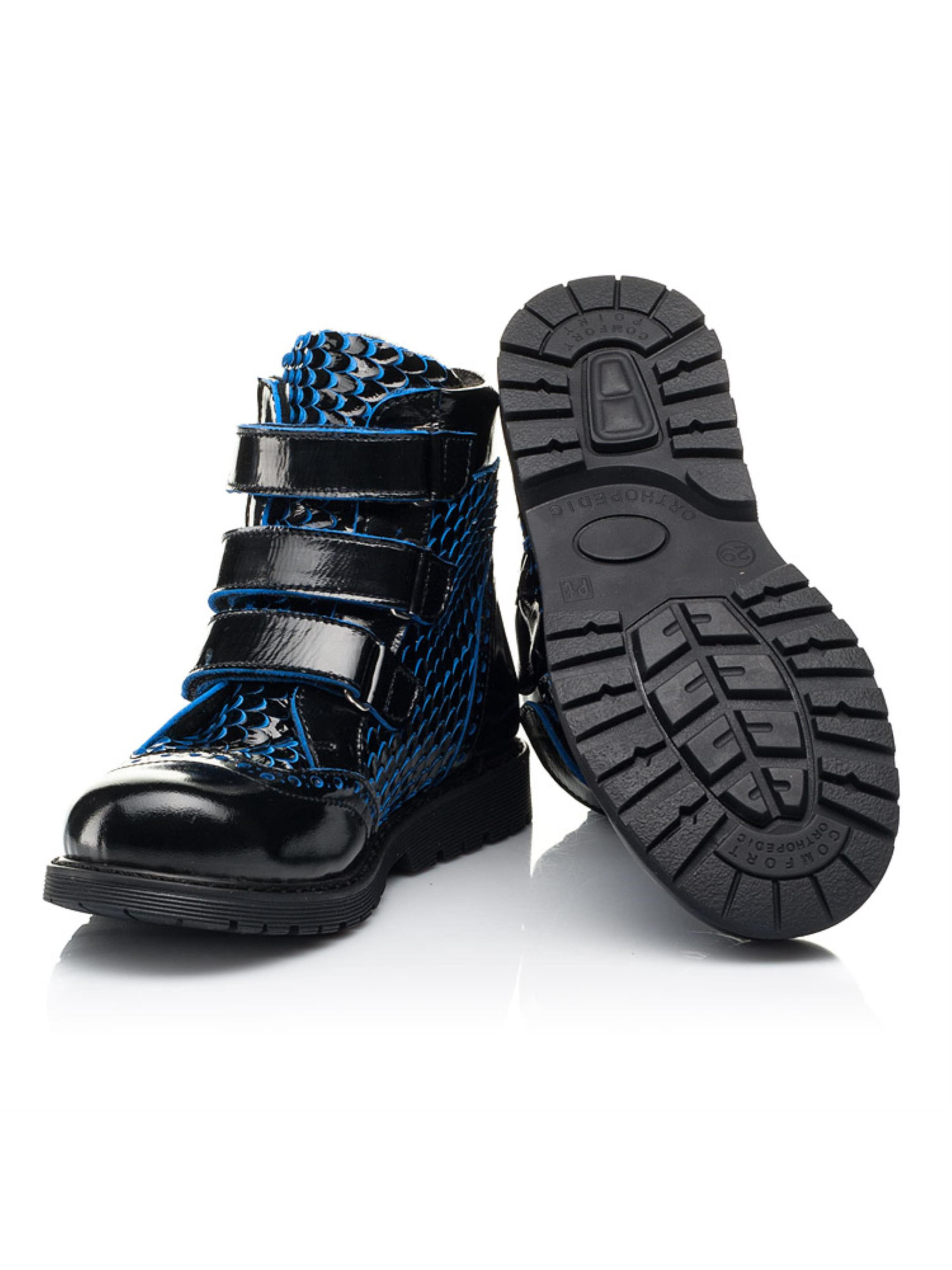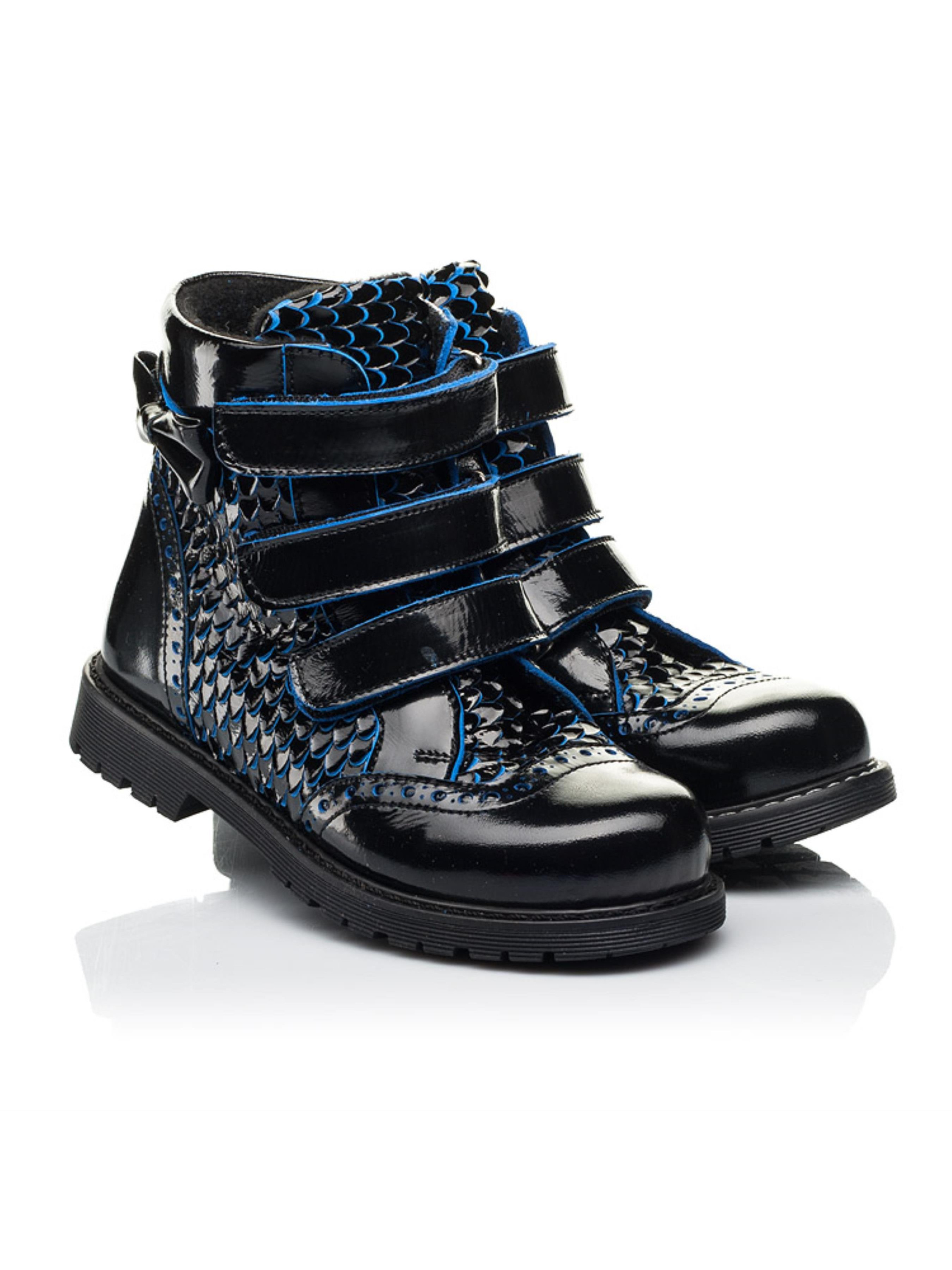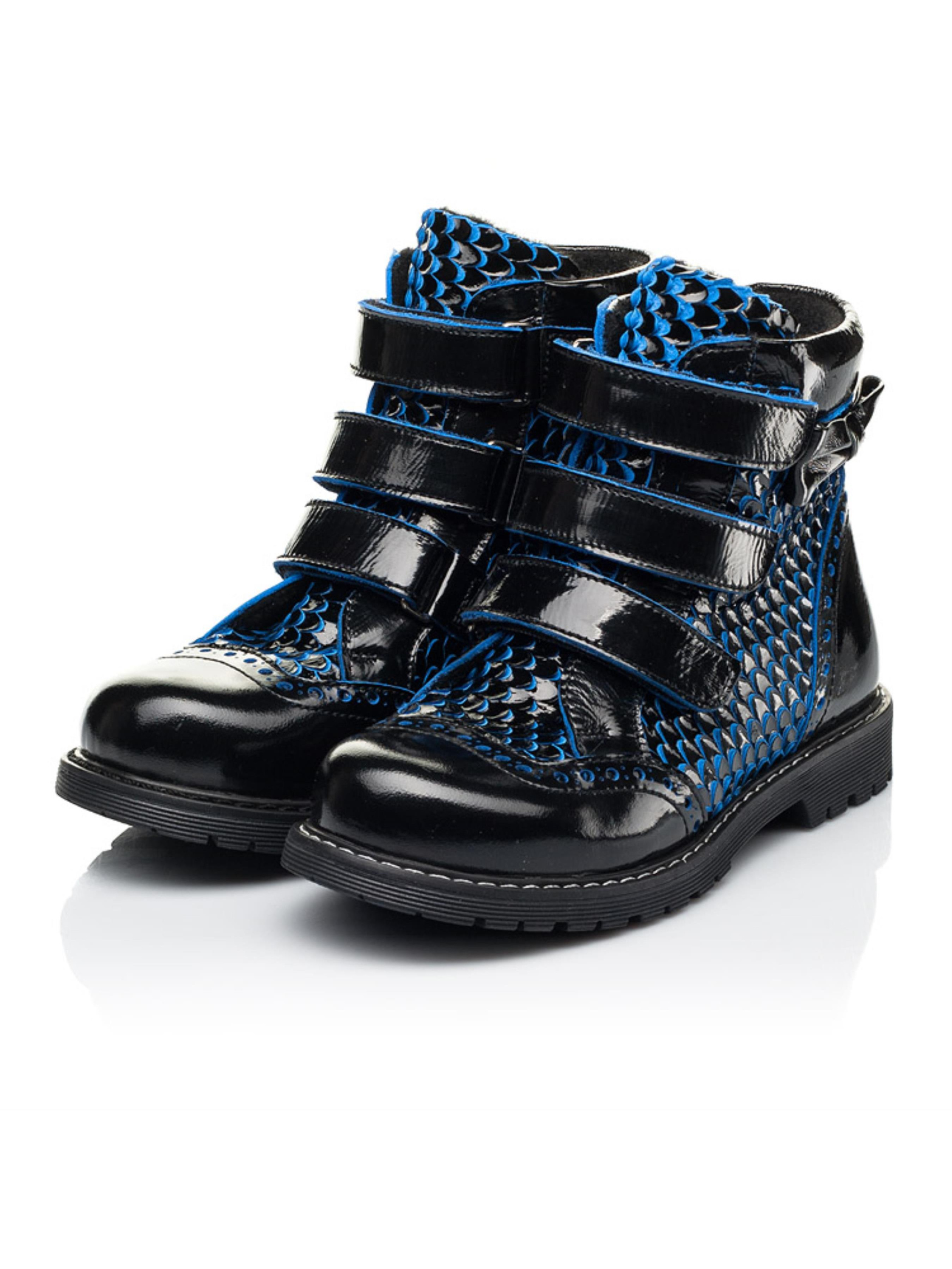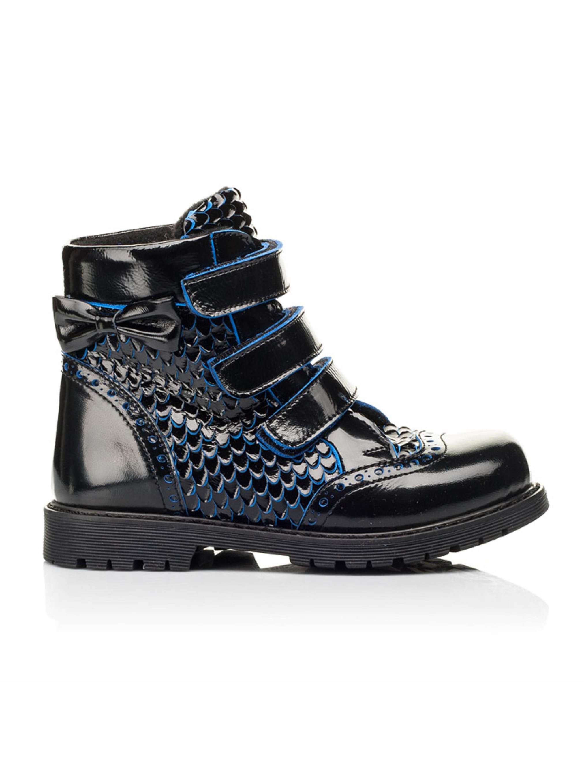Дизайн незвичного формату та важливі комфортні деталі виділяють цю взуттєву пару серед інших. Дитячі черевики єврозима пошиті з натуральної лаковоної шкіри чорного кольору. Окрасою цієї моделі виступає декор під луску, який розбавляє класичний чорний колір вкрапленням синього. Матеріал підкладки та устілки - натуральна вовна. Окрім неповторного дизайну такі дитячі зимові черевики вразять Вашу дівчинку і зручністю, адже взуття має всі важливі ортопедичні елементи. Каблук Томаса, жорсткий задник, супінатор та анатомічна устілка забезпечать правильне положення ніжки у взутті. Аби пришвидшити процес взування в якості застібки використовуються три надійні липучки. Модель дитячих черевик оздоблена фігурною перфорацією у верхніх шарах шкіри та доповнена милим бантиком, який прикрашає верхню частину взуття.