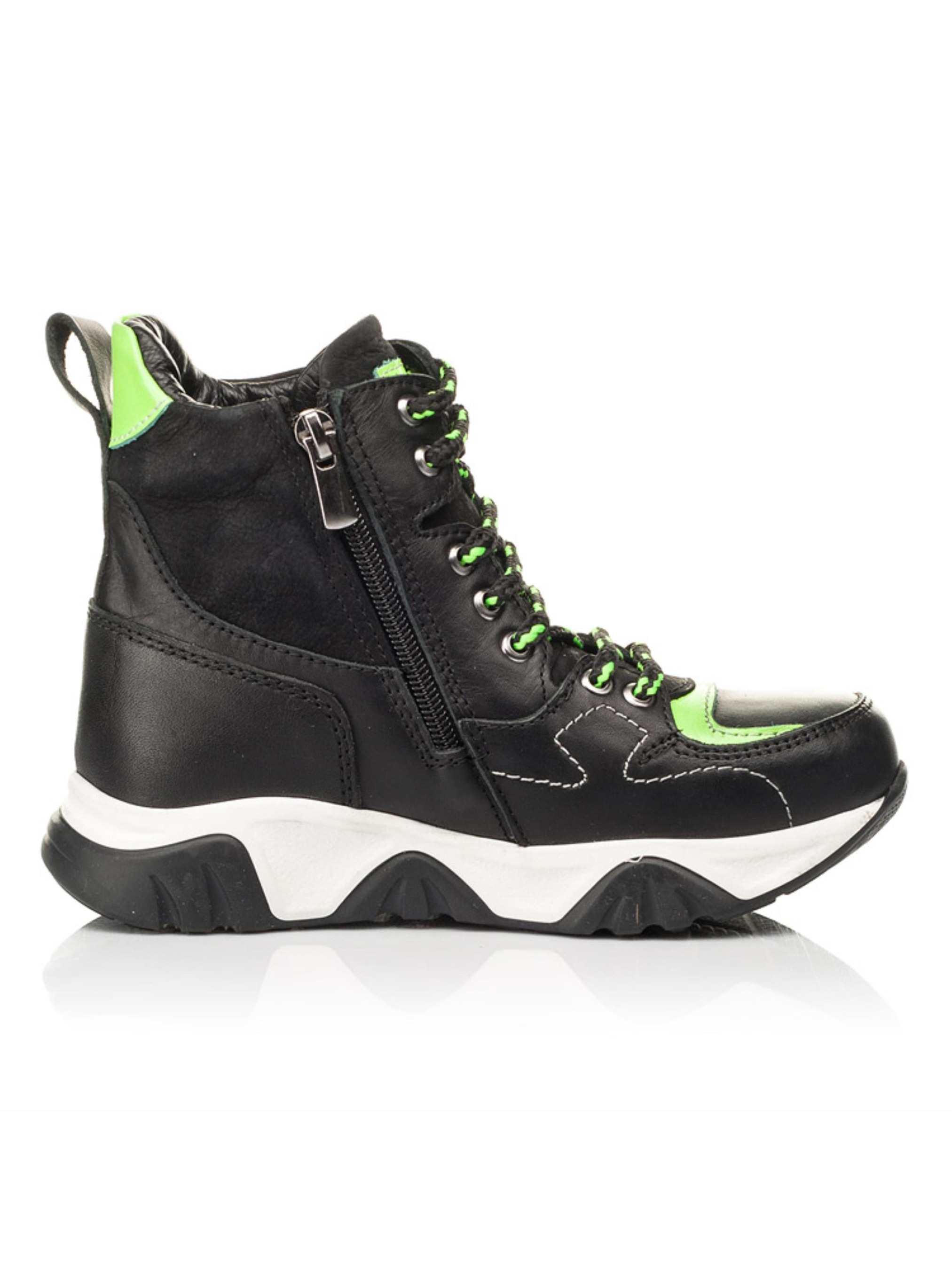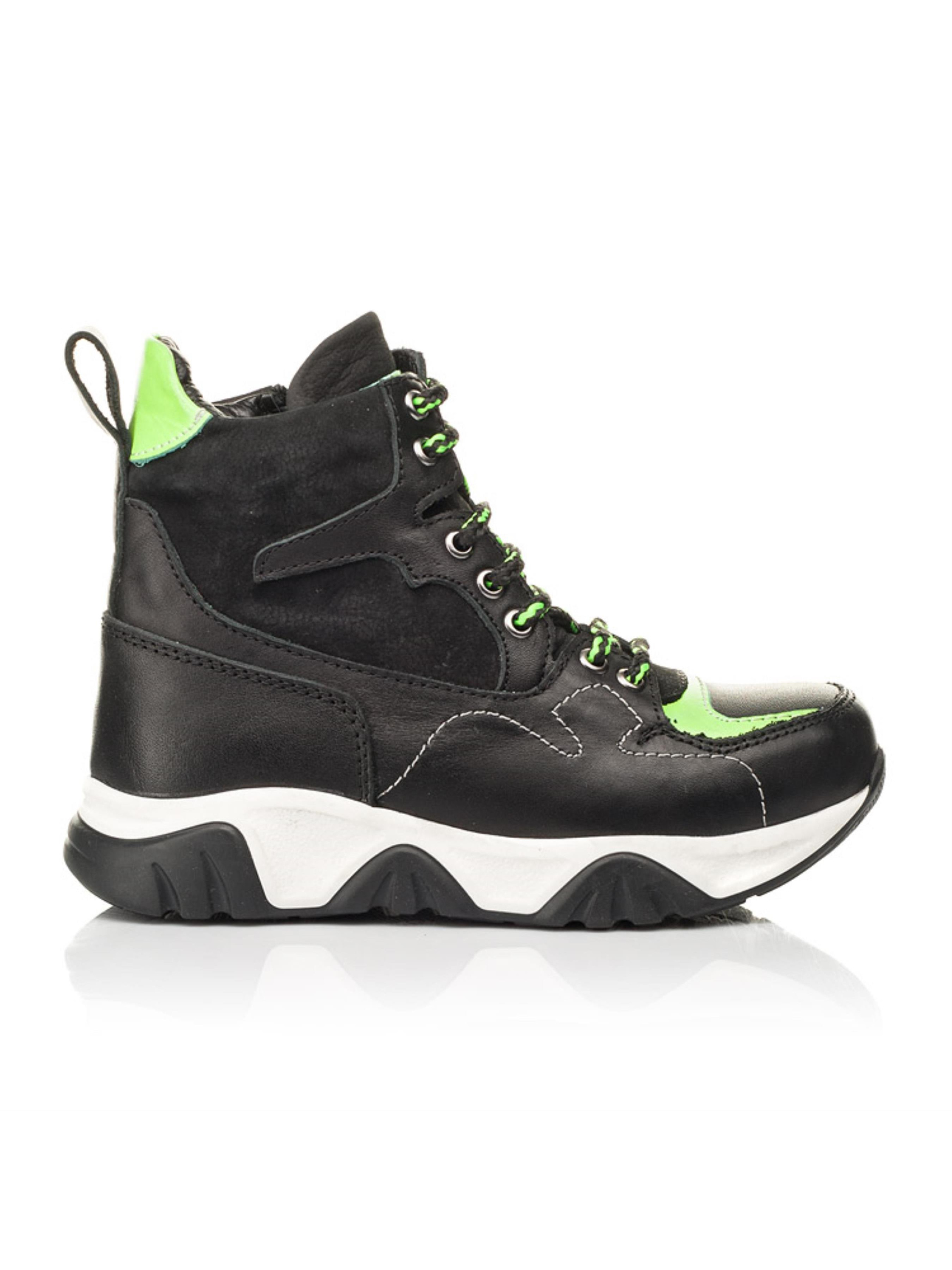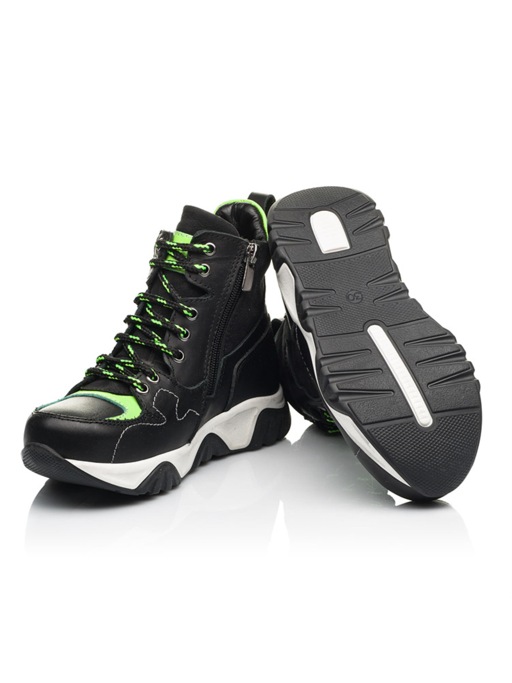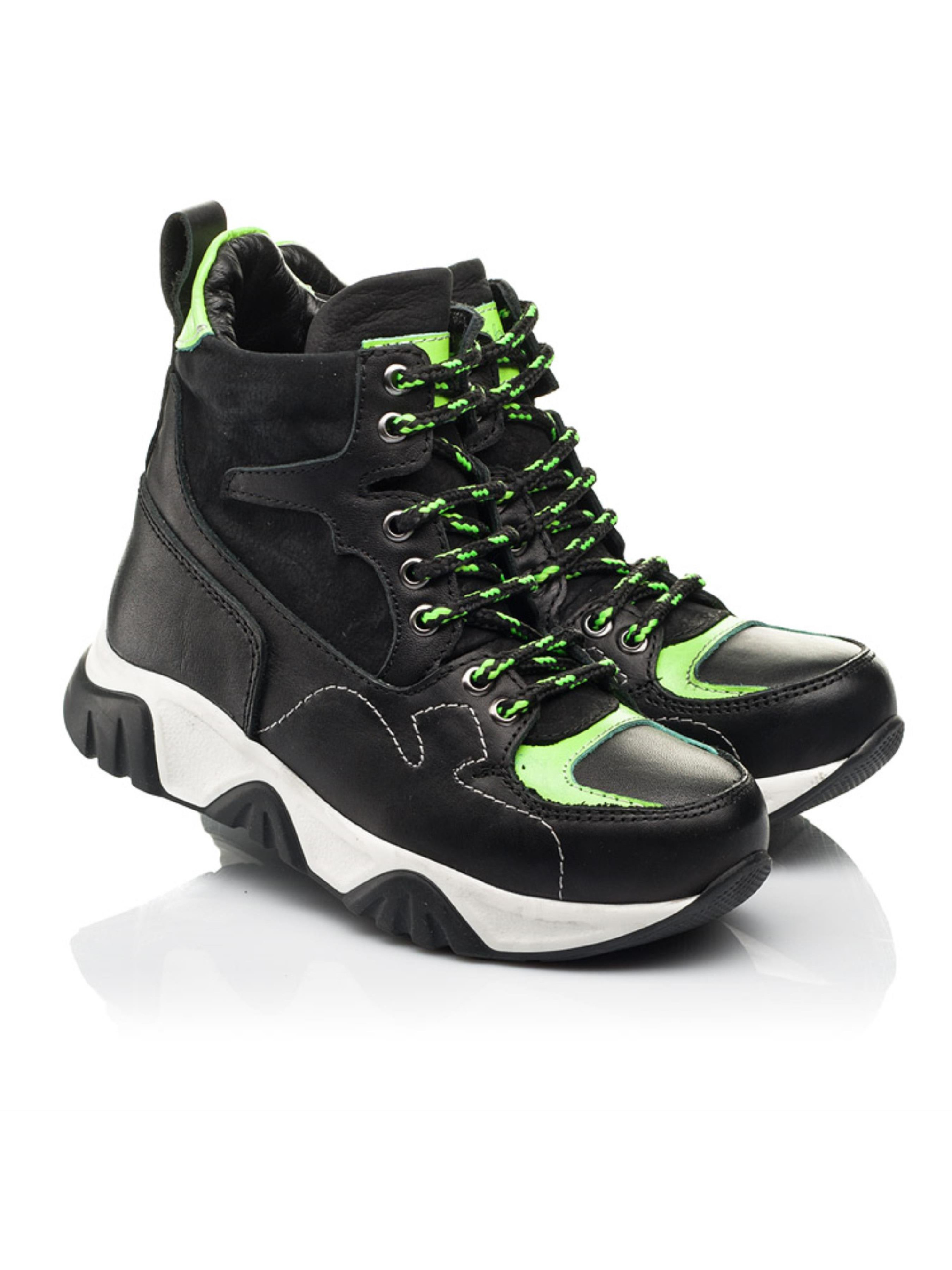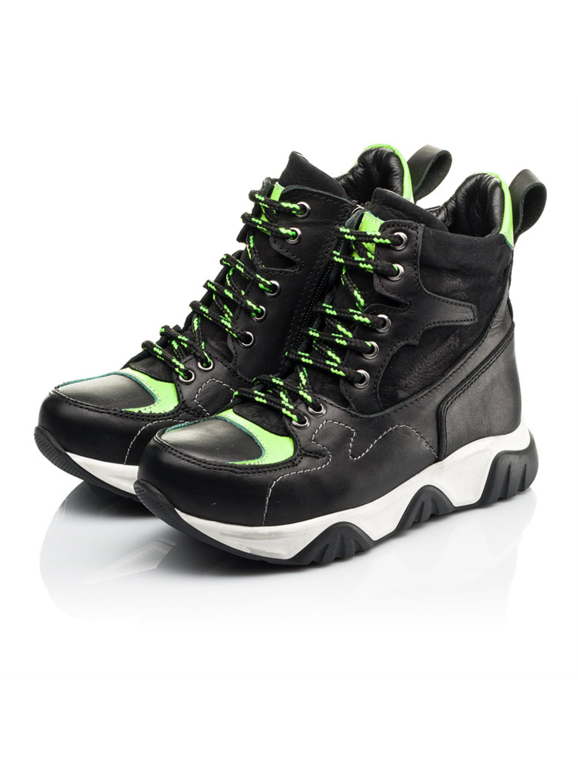 Супер крута модель з "Вау" ефектом для впевненої в собі модниці. Дитячі демісезонні черевики для дівчинки пошиті з натуральної шкіри класичного чорного кольору та доповнені вставками з натурального нубука. Матеріал підкладки - фліс, устілка шкіряна. Головним акцентом пари виступає мега крута висока рельєфна підошва та контрастні вставки насиченого салатового кольору. Швидкість взування гарантує бокова блискавка, а відрегулювати повноту дозволить шнурівка. Комфорт дитячим стопам гарантує жорсткий задник, супінатор та анатомічно правильна устілка. Ефектні підліткові демісезонні черевики для дівчинки стануть яскравим доповненням будь-якого осіннього образу.