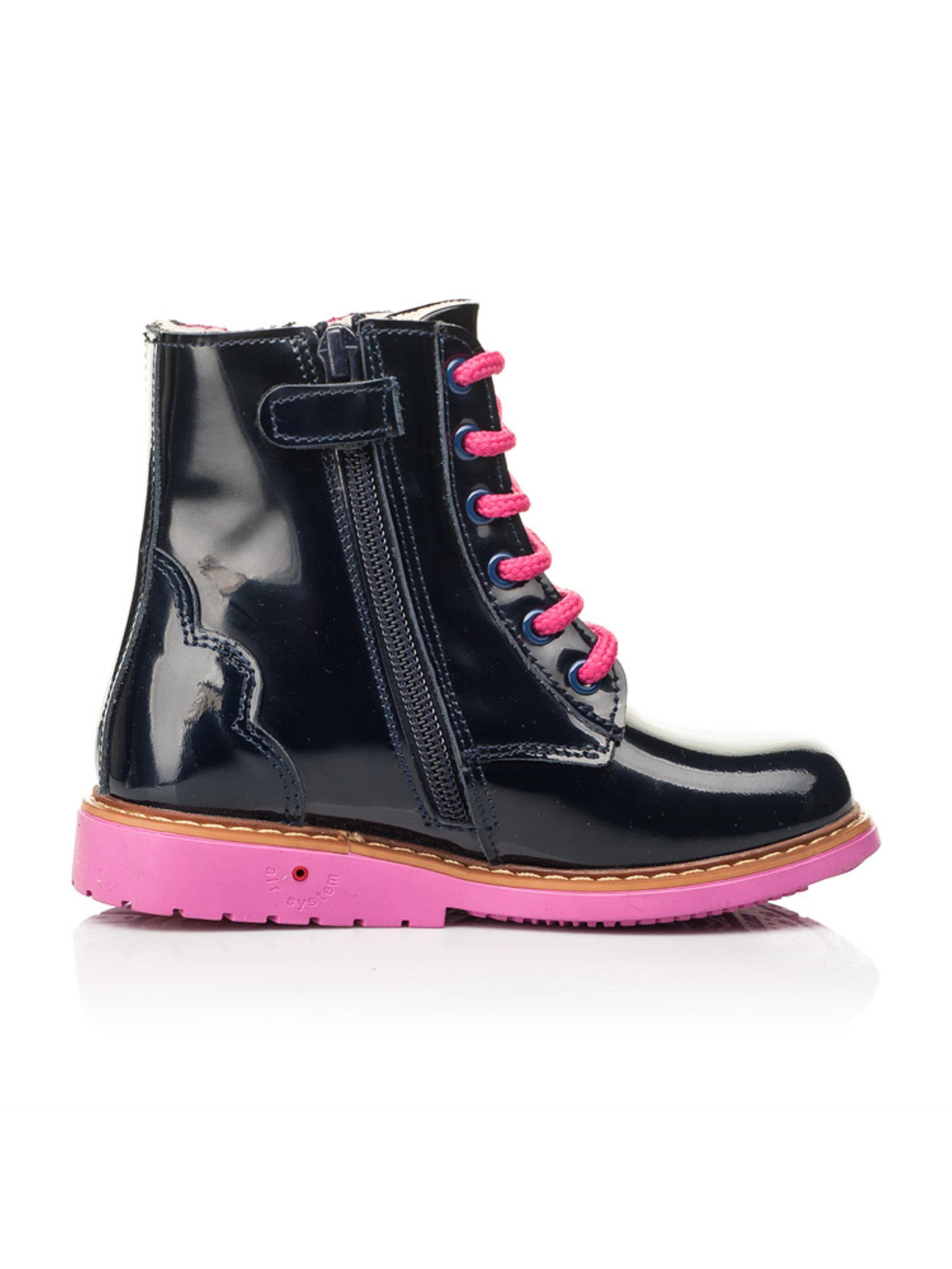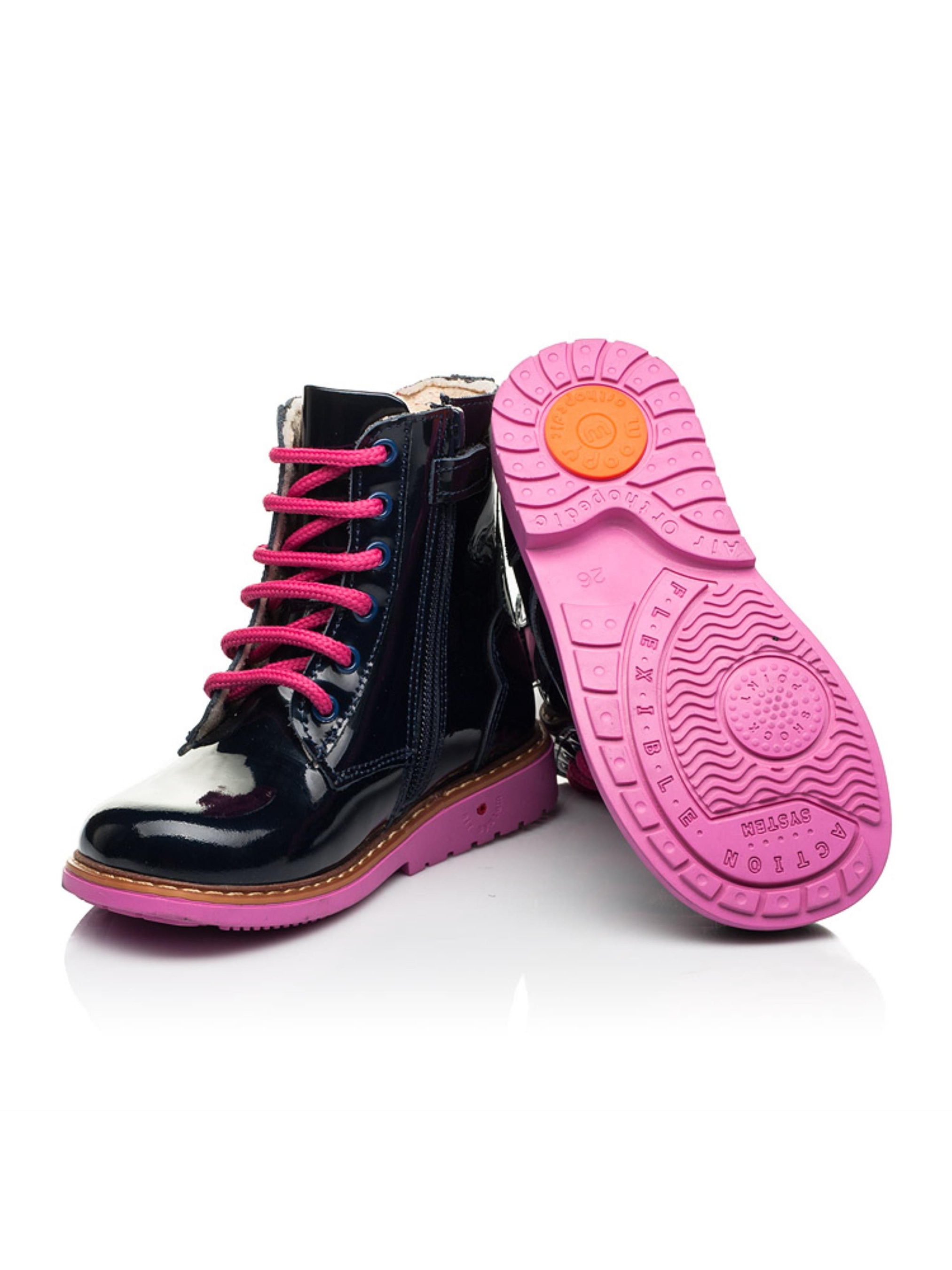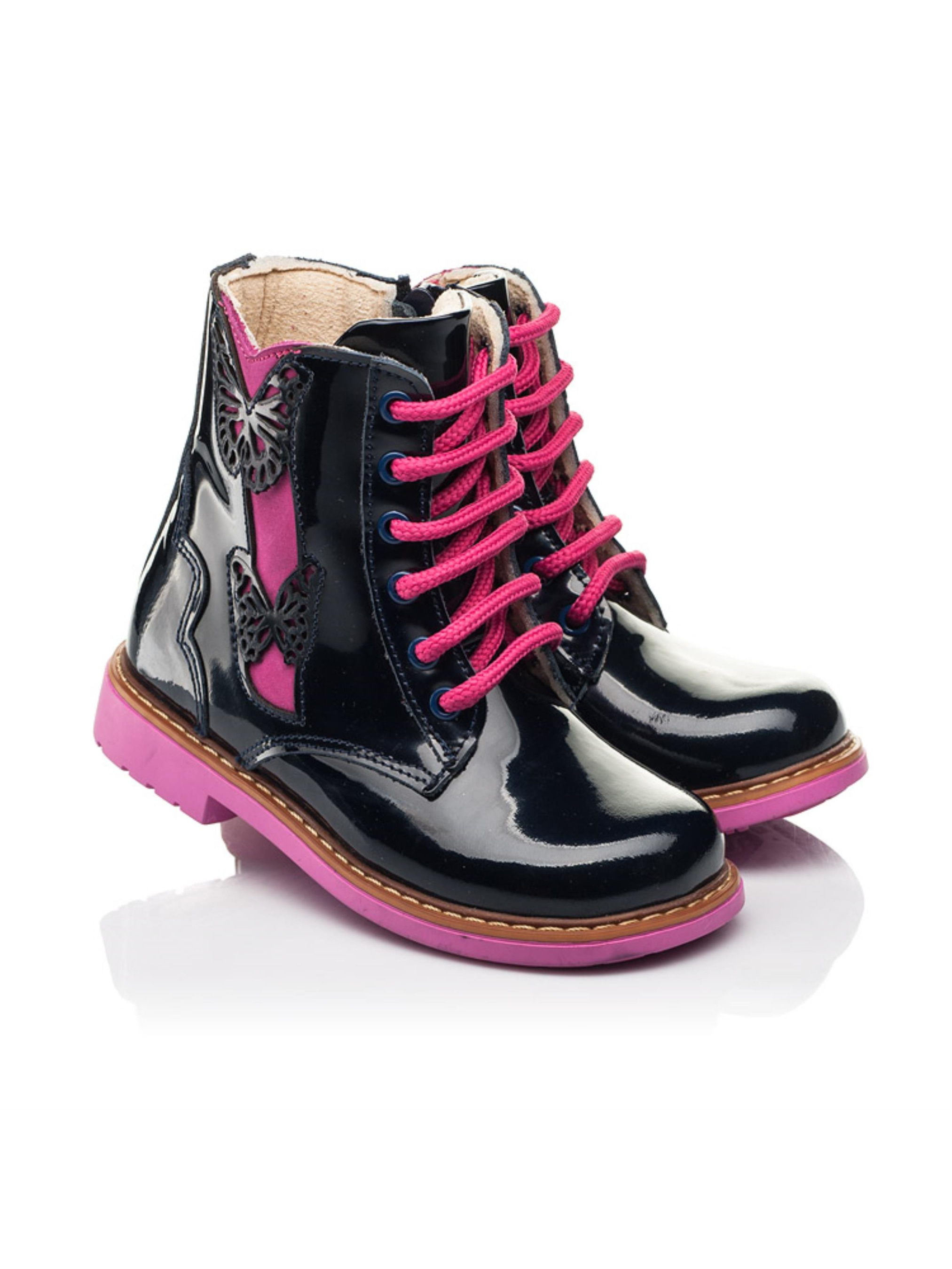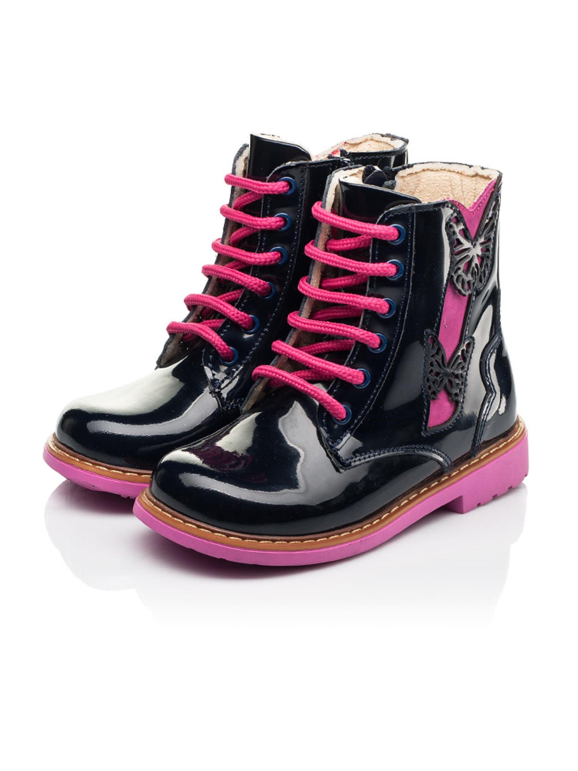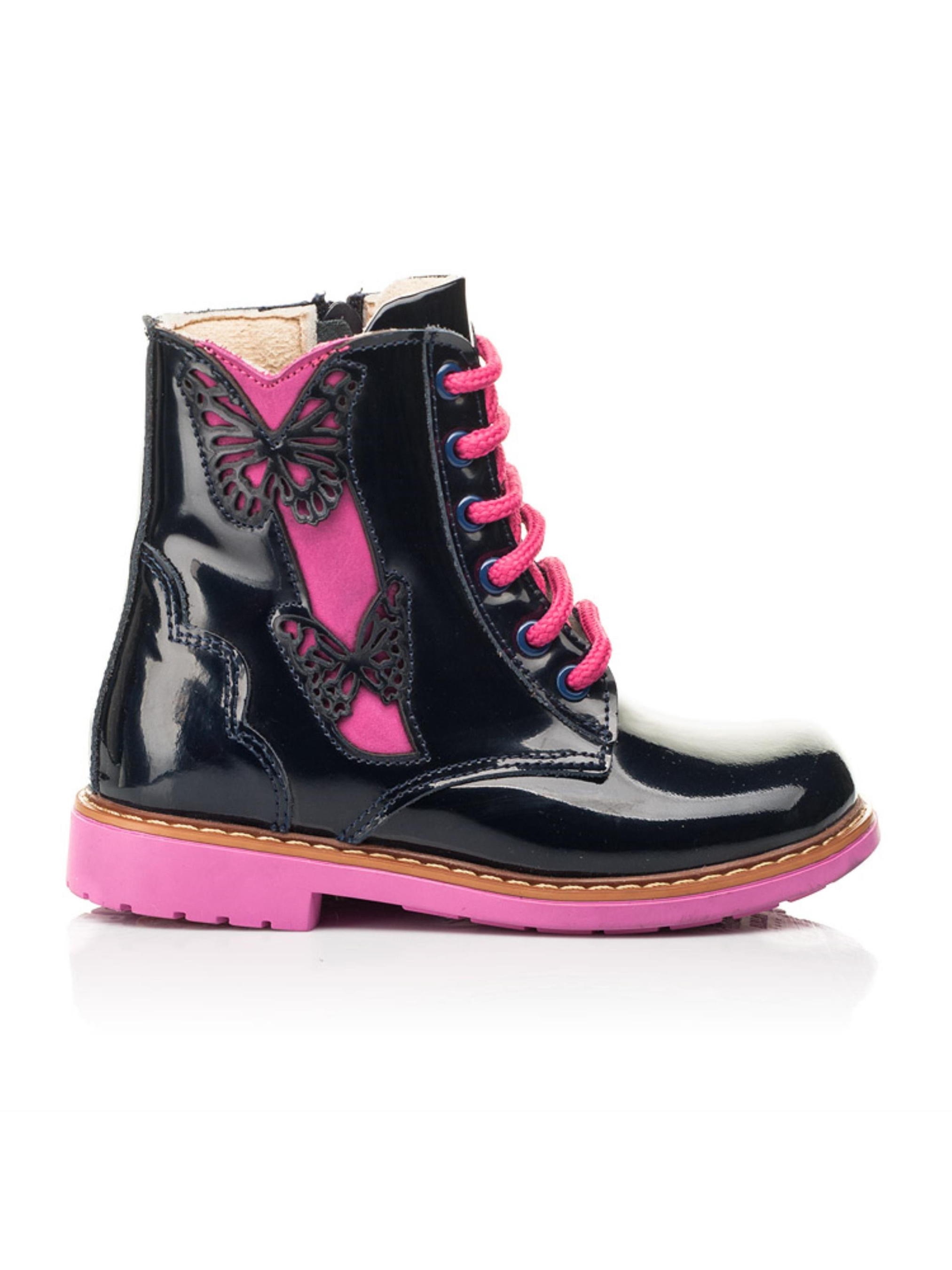 За основу для створення такої моделі демісезонного взуття наші креативні дизайнери обрали лаковану шкіру синього кольору. Всередині черевики утеплені флісом, температурний режим моделі до -4 градусів. Матеріал устілки - натуральна шкіра. Дитячі демісезонні черевики в такому дизайні вразять Вас та Вашу дівчинку не лише зовнішнім виглядом, а й комфортом. Пошита така модель з врахуванням усіх важливих ортопедичних складових дитячого взуття: каблук Томаса, жорсткий задник, супінатор та анатомічно правильна устілка. Спосіб застібання - бокова блискавка, яка для кращої фіксації ніжки доповнена шнурівкою. Як ефектно на фоні синього кольору виглядає вставка з натурального нубука та шнурівка малинового кольору. Чи не так? 100% окрасою моделі виступають два метелики, які для невагомості мають перфорований орнамент.
