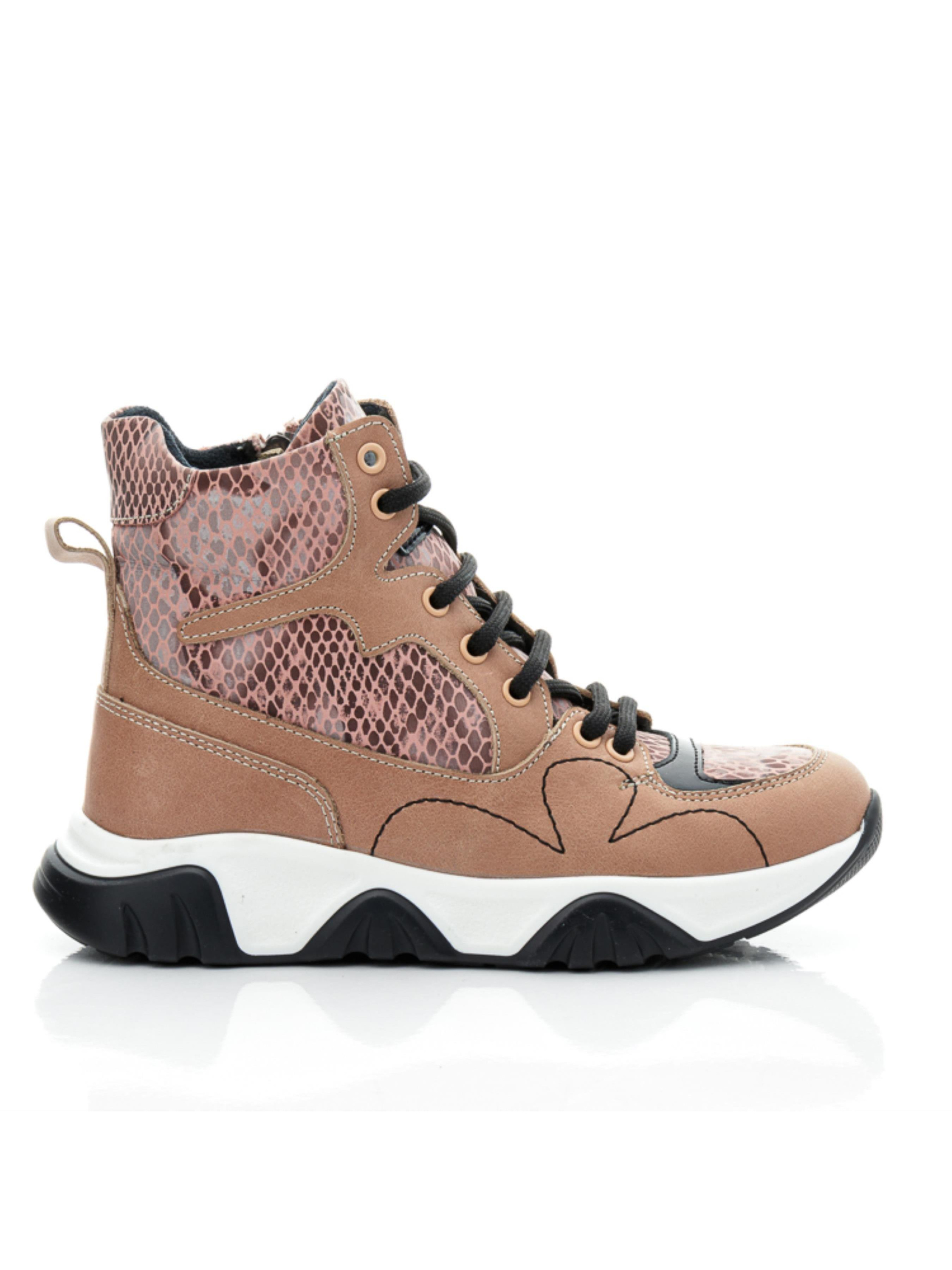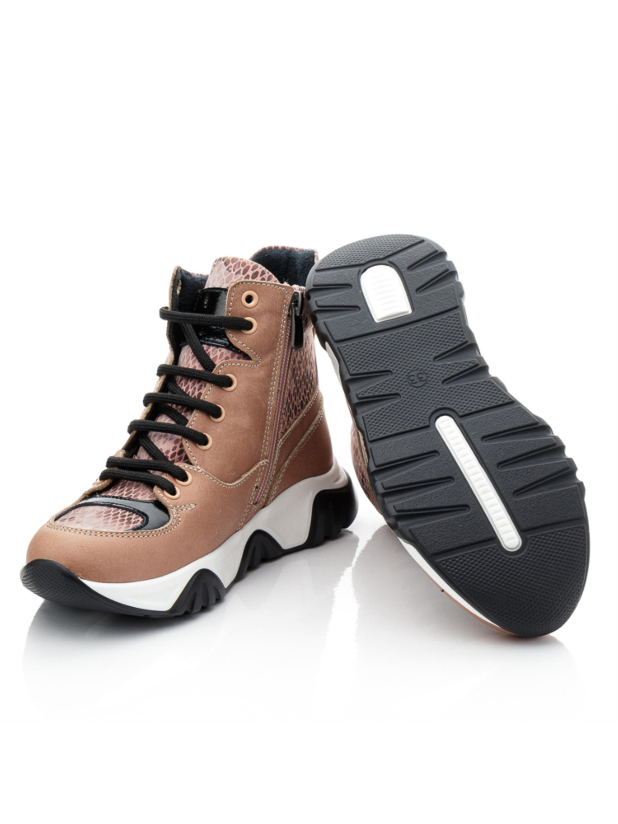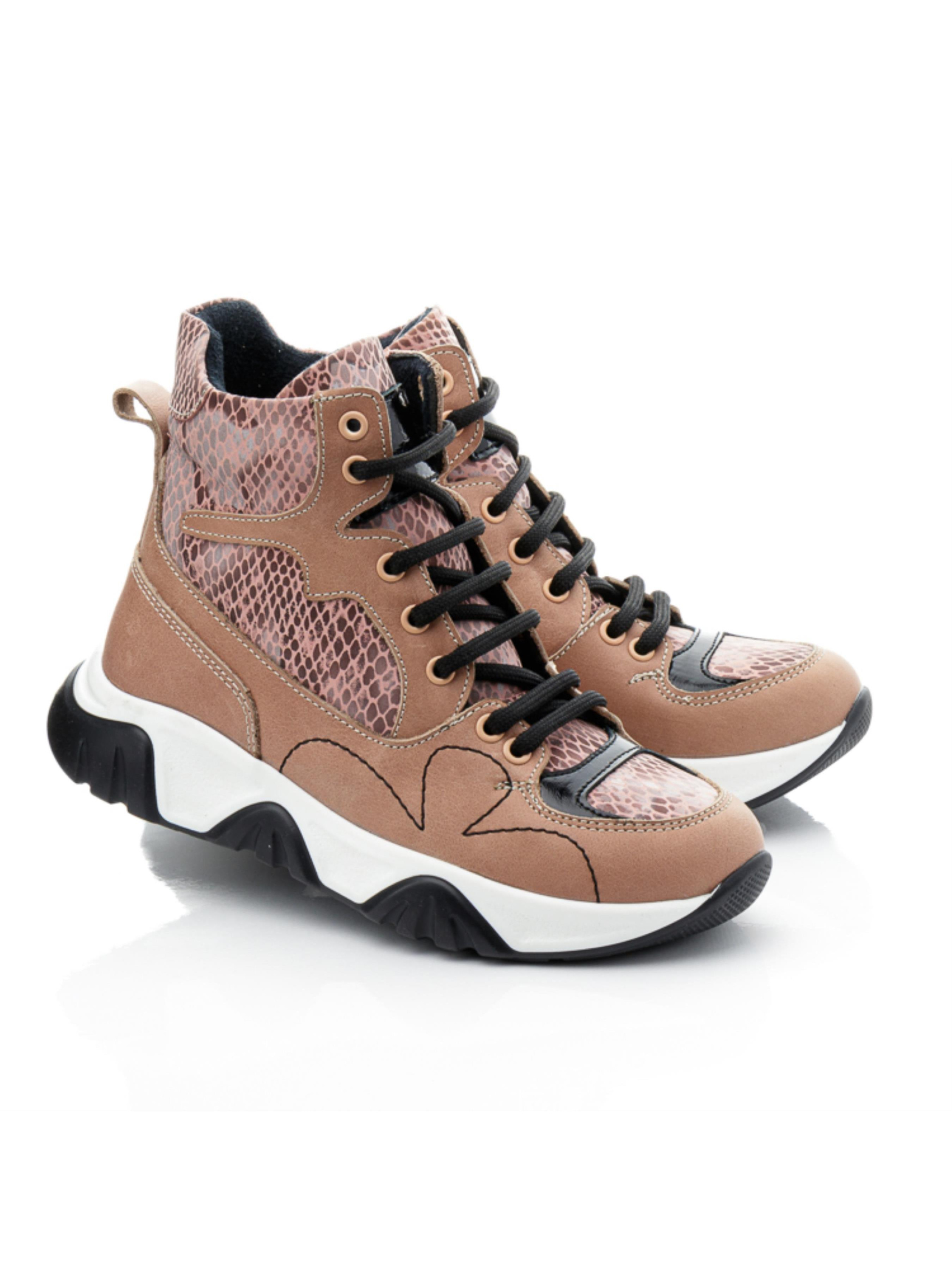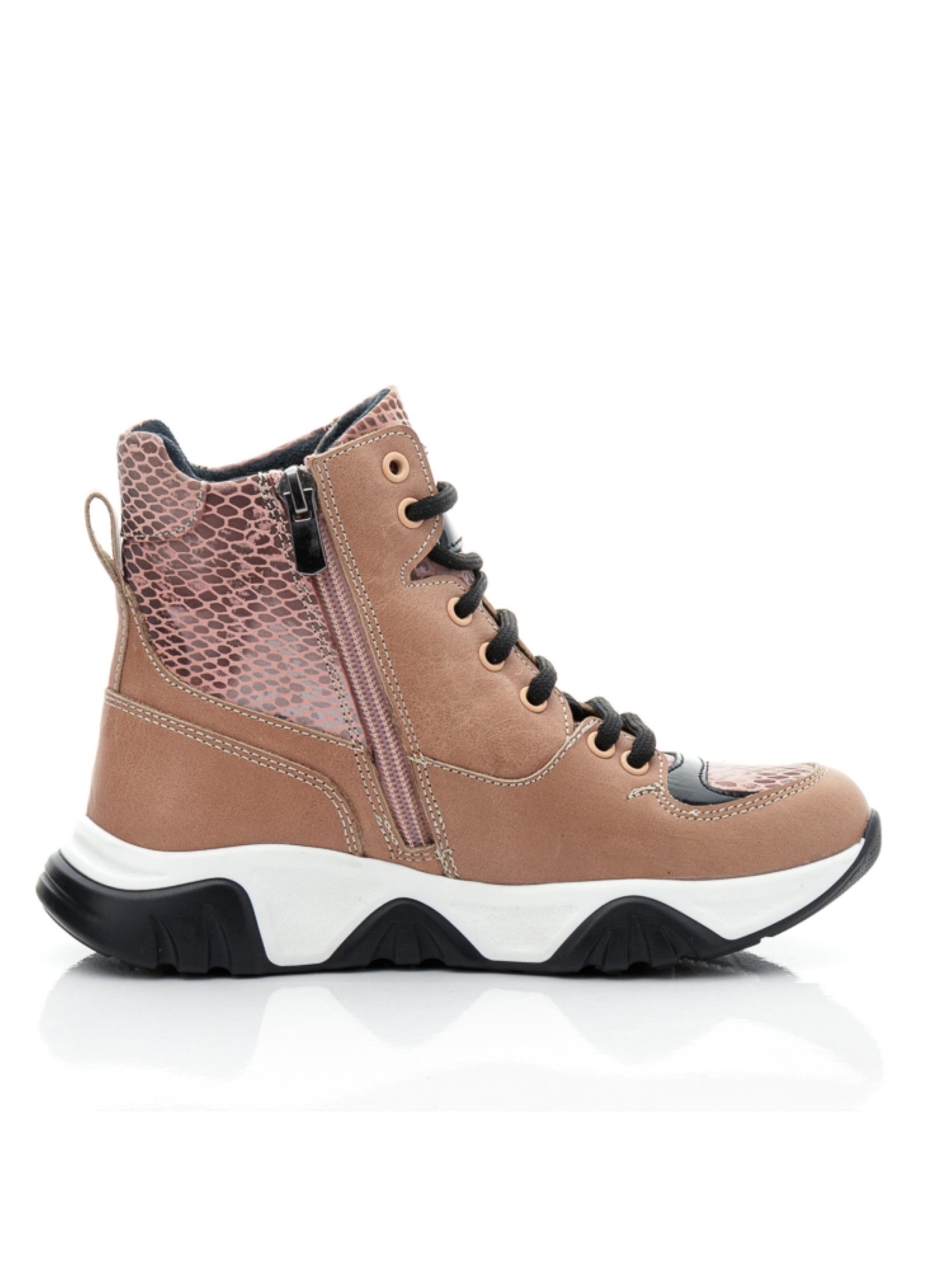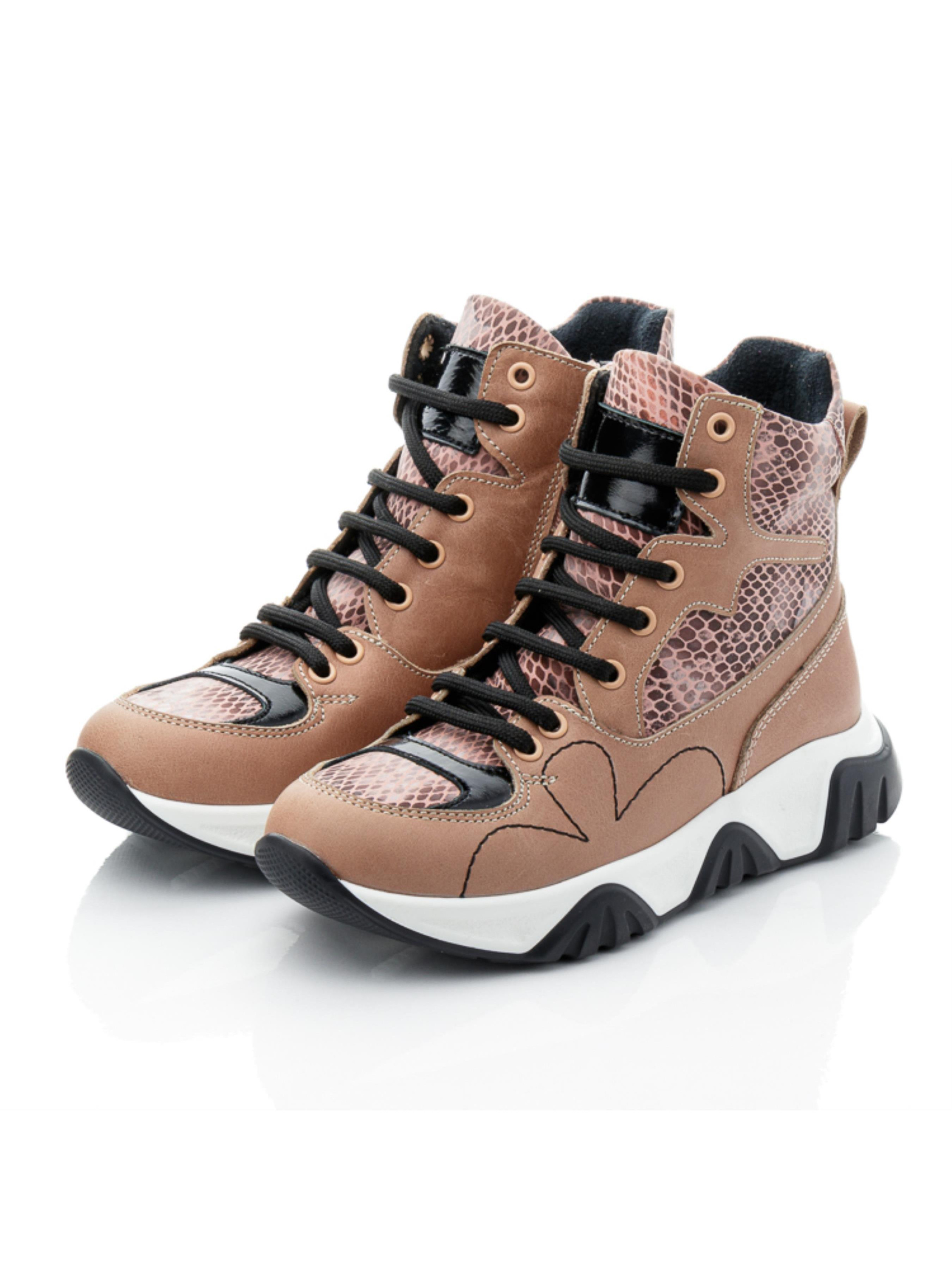Осінь надихає нас своїми барвами для створення ніжних моделей черевик. Ідеальні дитячі демісезонні черевики для дівчинки пошиті з натуральної шкіри бежевого кольору та доповнені вставкою з натурального нубука з стильним зміїним принтом. Всередині демісезонні черевики утеплені флісом, устілка в парі шкіряна. Носочок в моделі доповнено вставкою чорного кольору з натуральної лакованої шкіри, а бокову частину черевик прикрашає стримана чітка фігурна прошивка. Підошва відлита з якісної гуми контрастного чорно-білого кольору, вона висока, фактурна. Черевики для зручності взування мають бокову блискавку, а для кращої фіксації ніжки доповнені шнурівкою.