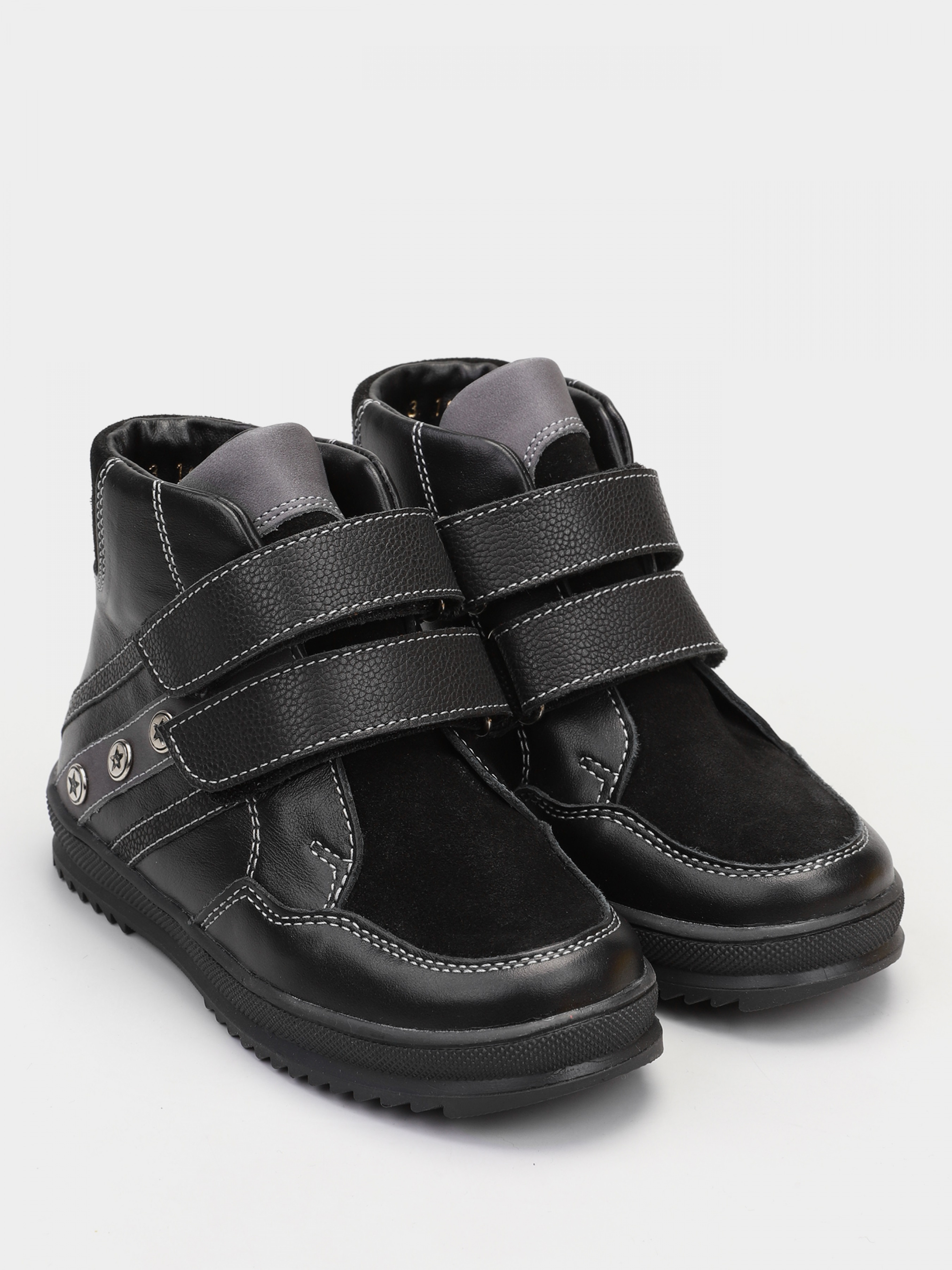 Осінньо-зимові черевики для хлопчика, виконані з натуральної гладкої шкіри, в комбінації з замшею і фактурною шкірою. Вони володіють благородним чорним кольором, з вставкою декоративних елементів і металевої фурнітурою. Підошва виконана з еластичного термоеластопласту, який забезпечує міцне з'єднання з поверхнею і стійкість при будь-якій осінній погоді.