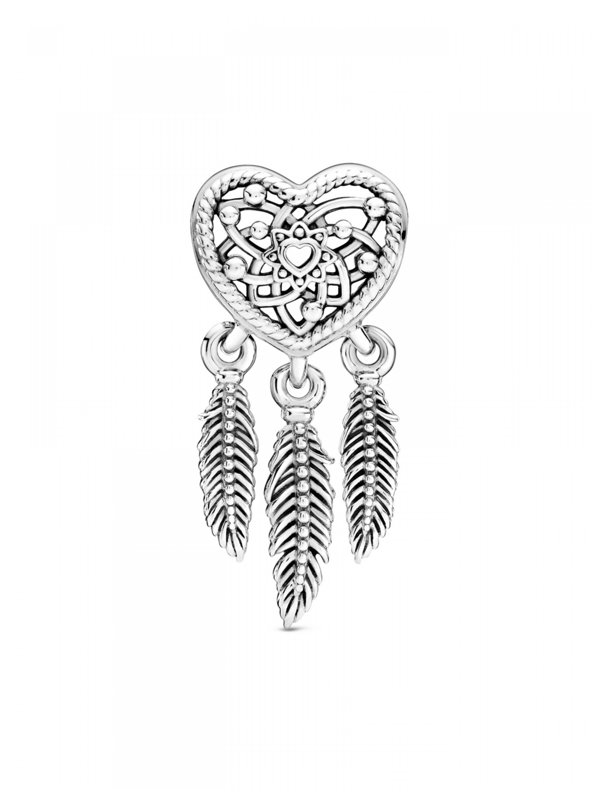 Ловіть флюїди позитиву разом з ажурною намистиною-серцем із трьома пір'їнками "Ловець снів". У центрі цієї довершеної вручну філігранної намистини, що виготовлена зі срібла 925-ї проби, розміщено невелике різьблене сердечко. На виготовлення цієї ажурної намистини-серця з підвісками-пір'їнками нас надихнула оригінальна намистина "Ловець снів" Pandora. Доповнює намистину гравіювання "Dreams of the heart" ("Мрії серця") у верхній частині прикраси, що охороняє від злих сил і поганих снів і просто піднімає настрій.