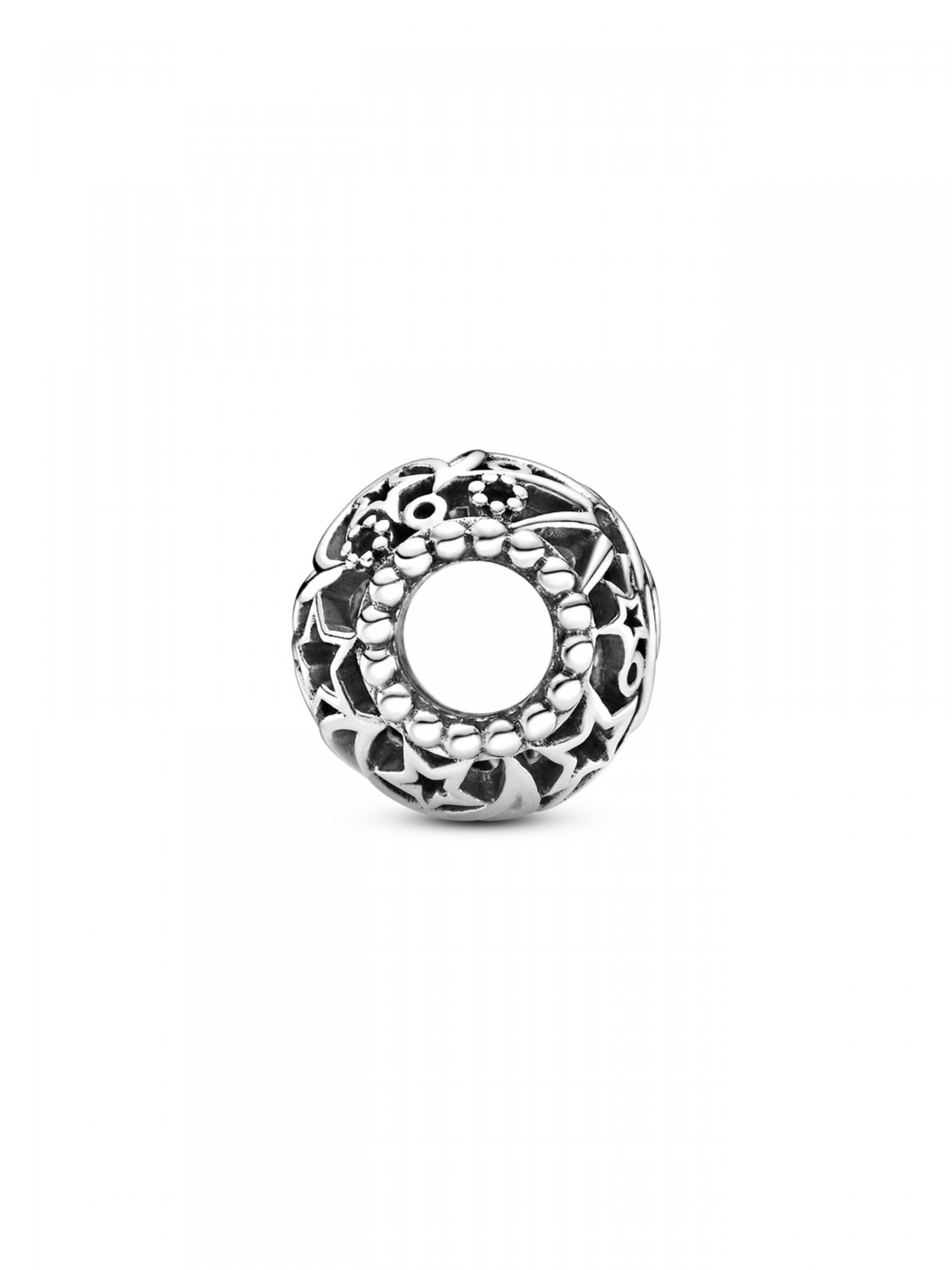 Відшукайте свій власний шлях у галактиці за допомогою ажурної намистини "Сонце, зорі та місяць". Ця, довершена вручну, філігранна прикраса, виготовлена зі срібла 925-ї проби. В ажурній намистині втілено молодий місяць, сонце та зорі. Обидві дірочки намистини оздоблено металевими кульками. Щоб створити особливий образ із містичним змістом, поєднайте цю прикрасу з вашими улюбленими намистинами тематичного дизайну та закріпіть добірку на браслеті Pandora Moments.