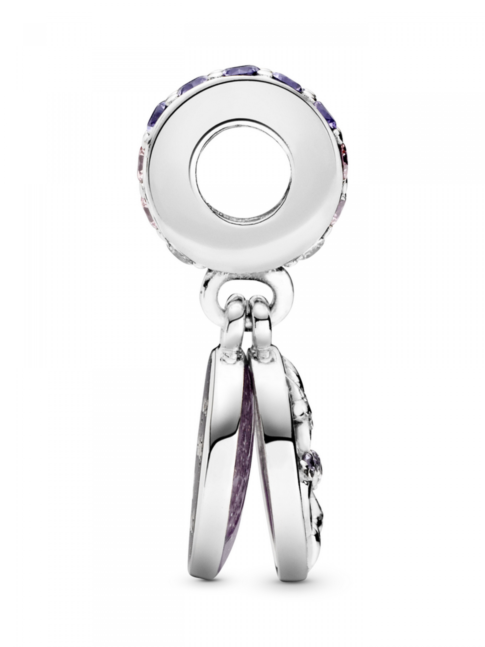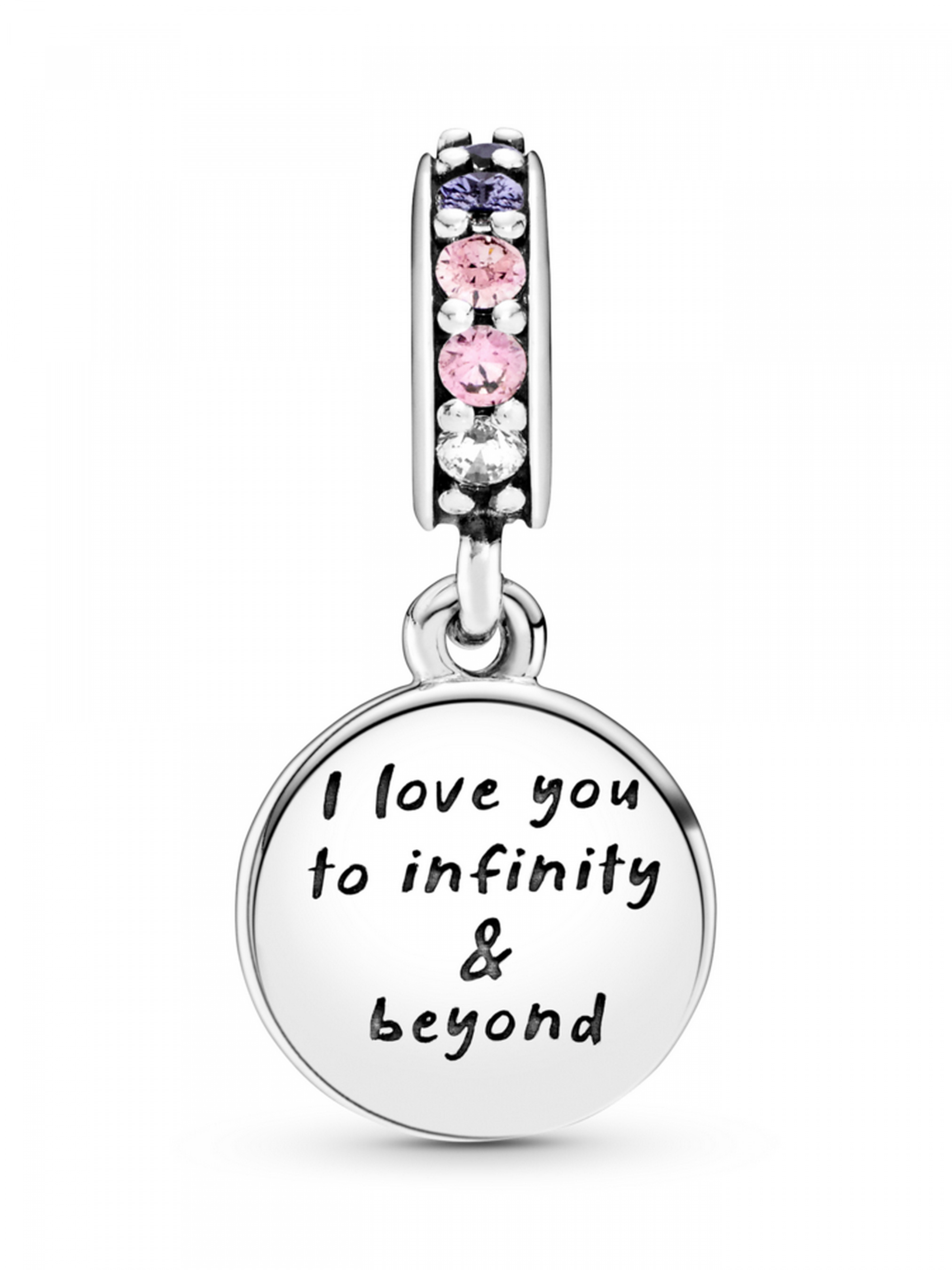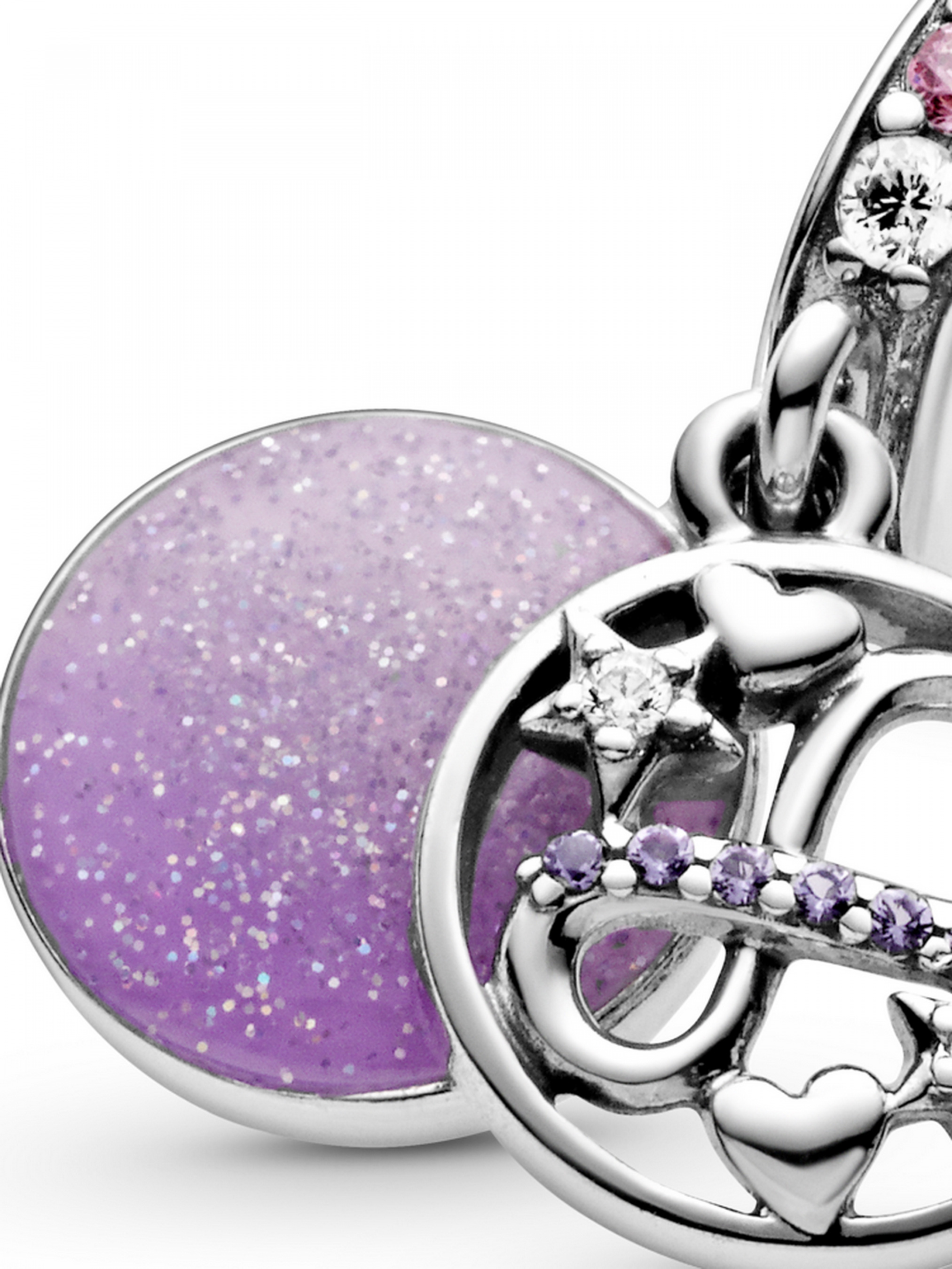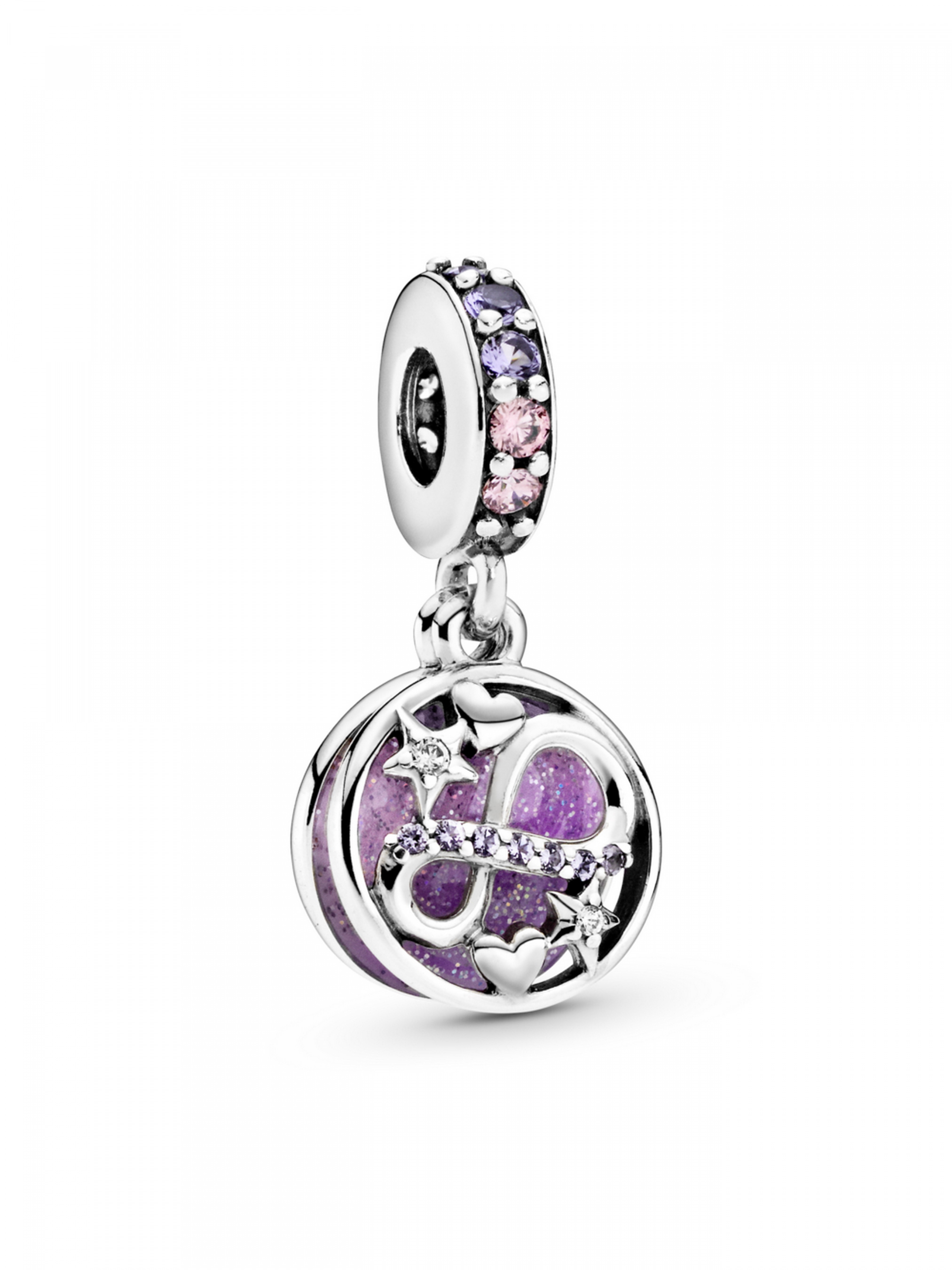 Намистина з підвіскою "Мерехтлива нескінченність, серця та зорі" — це символ вічного кохання. Як і любов між батьками та дитиною, вона символізує нерозривний зв'язок довжиною на все життя. Цю намистину з двома підвісками інкрустовано пурпуровими та рожевими кристалами, прозорими кубічними оксидами цирконію, а також вручну оздоблено емаллю пудрово-рожевого, насичено-лавандового та мерехтливого срібного кольорів. Доповнює намистину гравіювання зі словами "I love you to infinity & beyond" ("Я люблю тебе до нескінченності та більше").