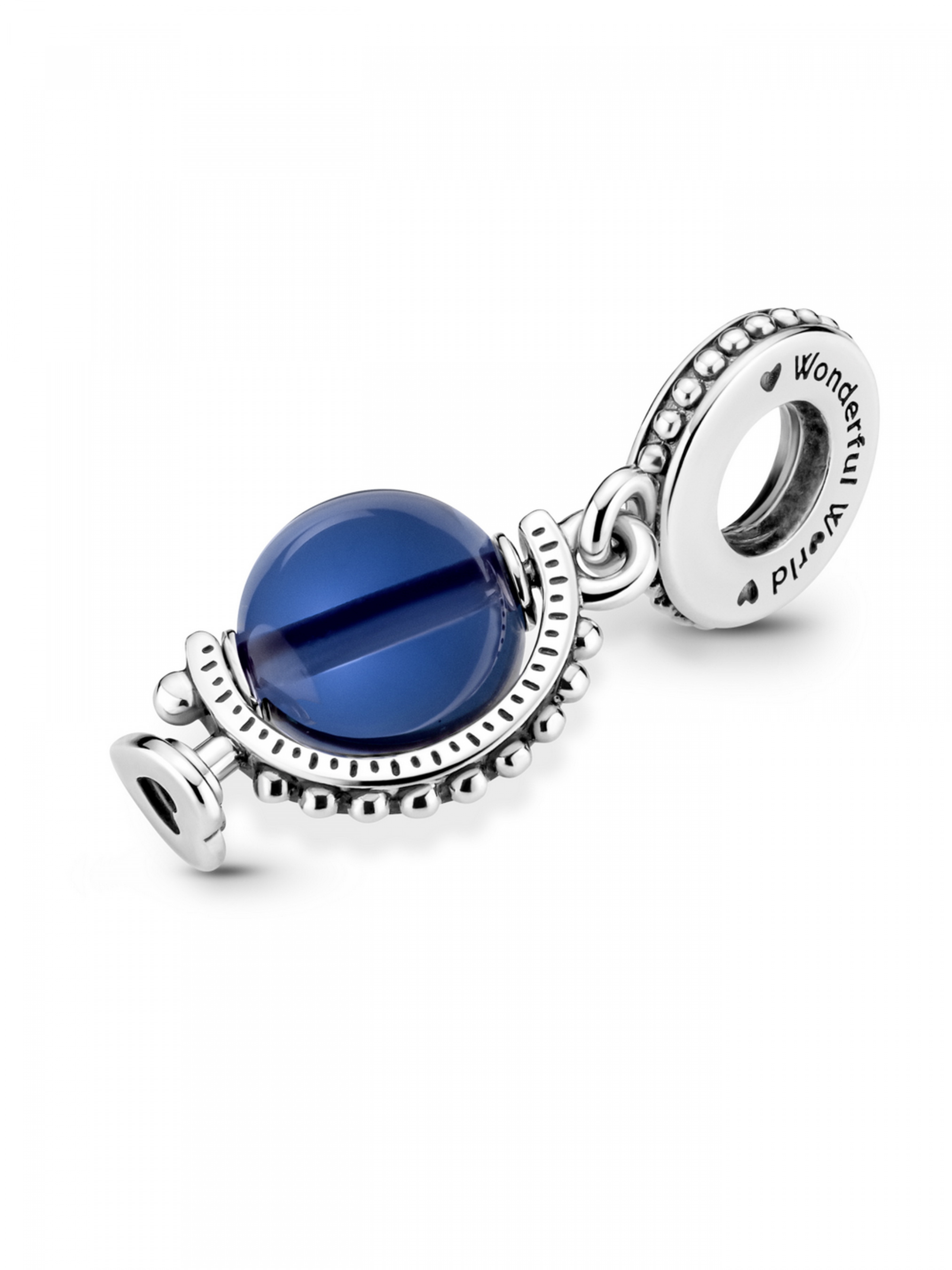Намистина з підвіскою "Чудовий світ", краще за слова, розповість дорогій вам людині, що вона — ваш Всесвіт. У цій прикрасі втілено нашу сучасну інтерпретацію традиційного глобусу: кристал місячно-синього кольору розмістився у кільці меридіану, що оздоблений металевими кульками, й обертається навколо своєї осі. Дужку прикраси доповнено вигравійованим написом "Wonderful World" ("Чудовий світ") і легендарним логотипом Pandora. Ця намистина зі срібла 925-ї проби нагадує про те, наскільки важливо піклуватися про Блакитну планету та не боятися власних мрій. Прикраса ідеально пасує до барвистих намистин із колекції Pandora Moments, а також стане чудовим доповненням до браслету, присвяченого подорожам.
