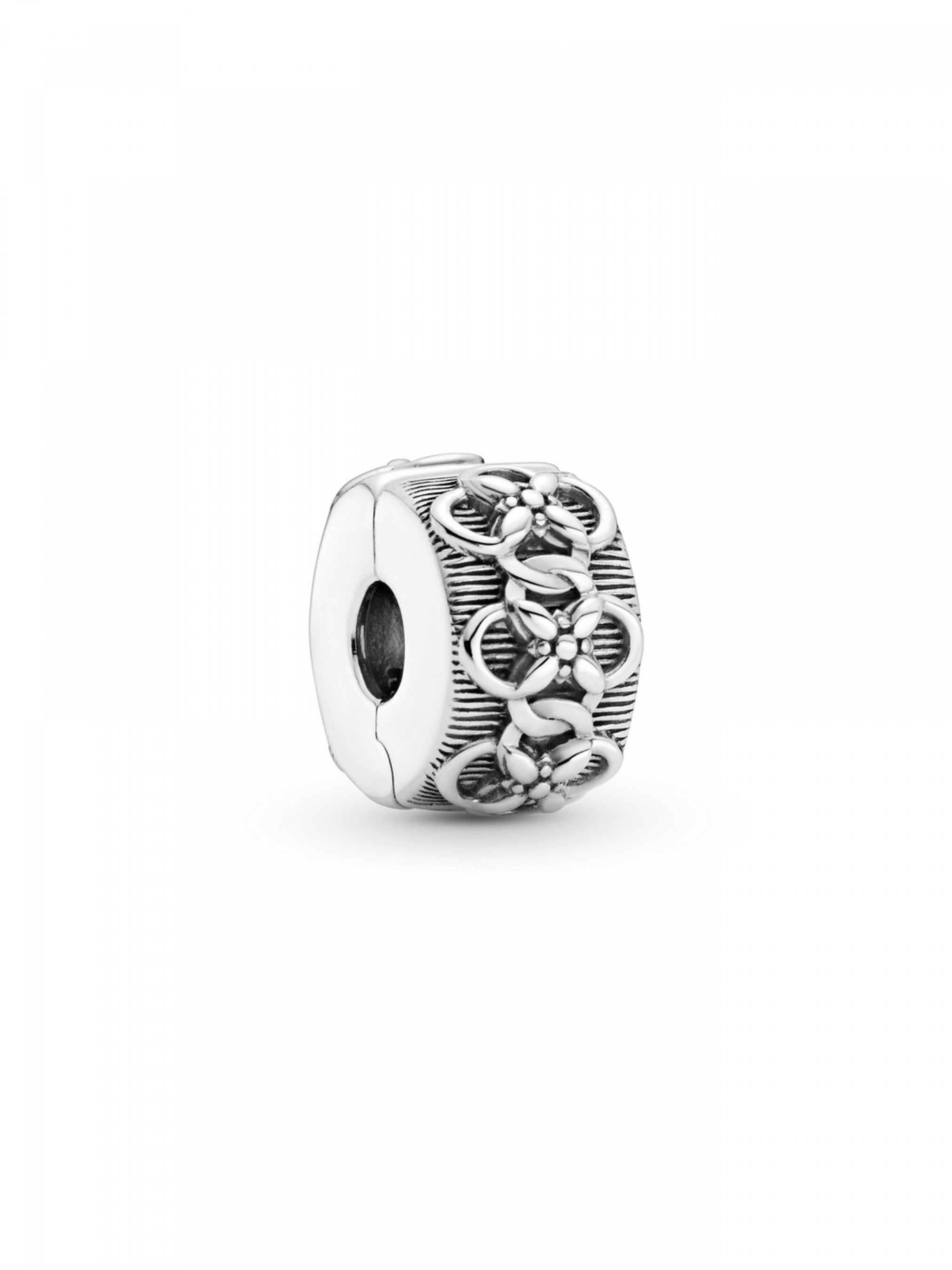 Створіть стильний образ із намистиною-кліпсою з квітковим орнаментом. Ця універсальна намистина-кліпса вирізняється рельєфними зображеннями переплетених кіл та квіткового орнаменту, які височіють над трохи оксидованими смугастими лінями. Пелюстки кожної квітки виконано у формі "маркіз", а центральну частину оточено металевими мікрокульками. Ця неймовірно текстурна та об'ємна намистина-кліпса зі срібла 925-ї проби стане чудовим доповненням до вашого модного образу на кожен день.