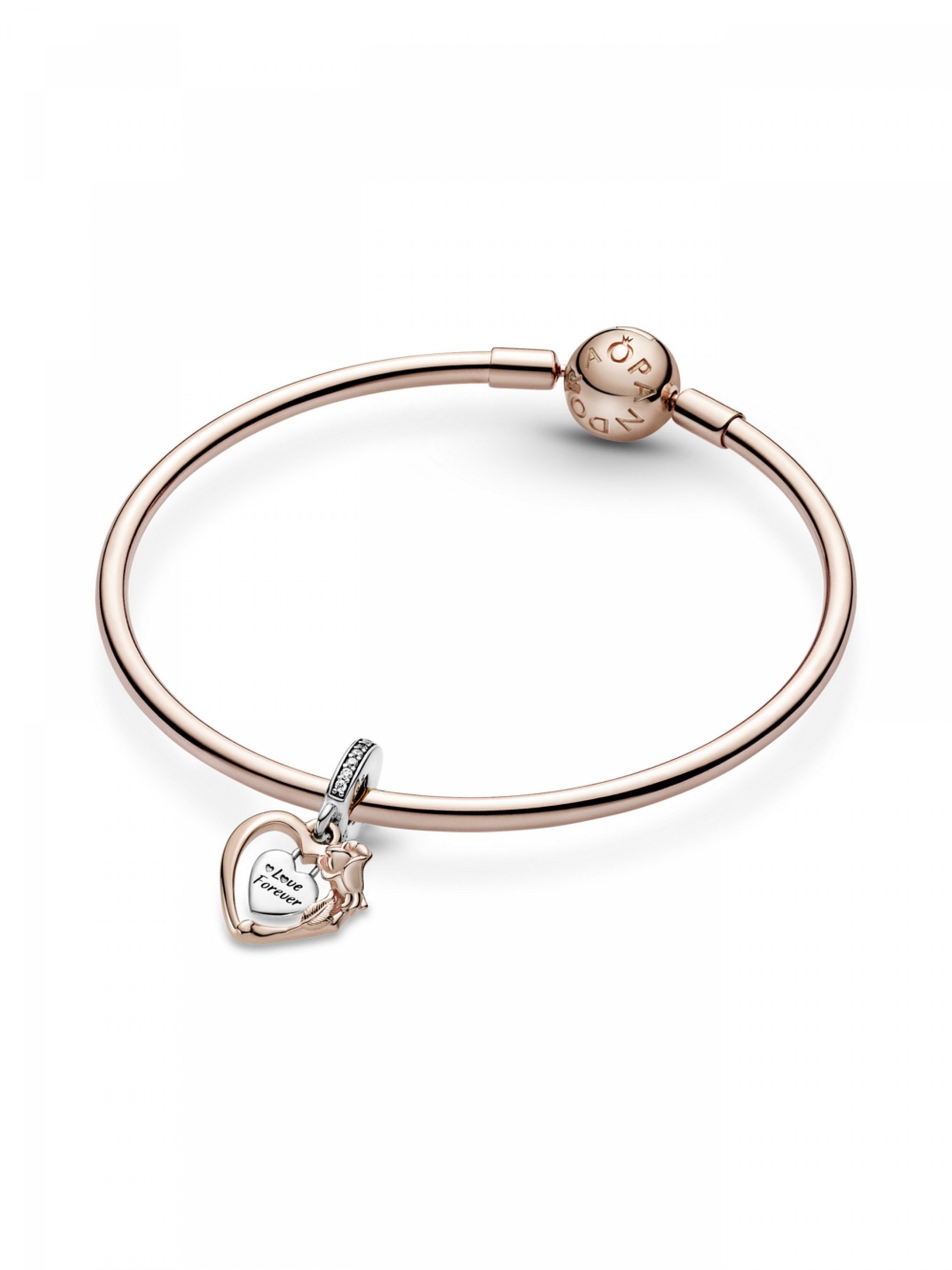 Розкажіть про свою любов за допомогою намистини з підвіскою "Серце та троянда". Цю прикрасу виготовлено та довершено вручну зі срібла 925-ї проби та Pandora Rose™, унікального сплаву металів з покриттям рожевим золотом 14k. Підвіска складається із рамки у формі серця, всередині якої міститься замок-серце. Рамку підіски доповнено філігранним оздобленням у вигляді пелюсток і листочків троянди, а на замок-серце нанесено гравіювання з написом "Love forever" ("Любов назавжди"). Дужку прикраси інкрустовано блискучими камінцями. На створення цієї прикраси нас надихнули п'єса "Ромео та Джульєтта" Вільяма Шекспіра. Подаруйте прикрасу тій, що заполонила ваше серце.