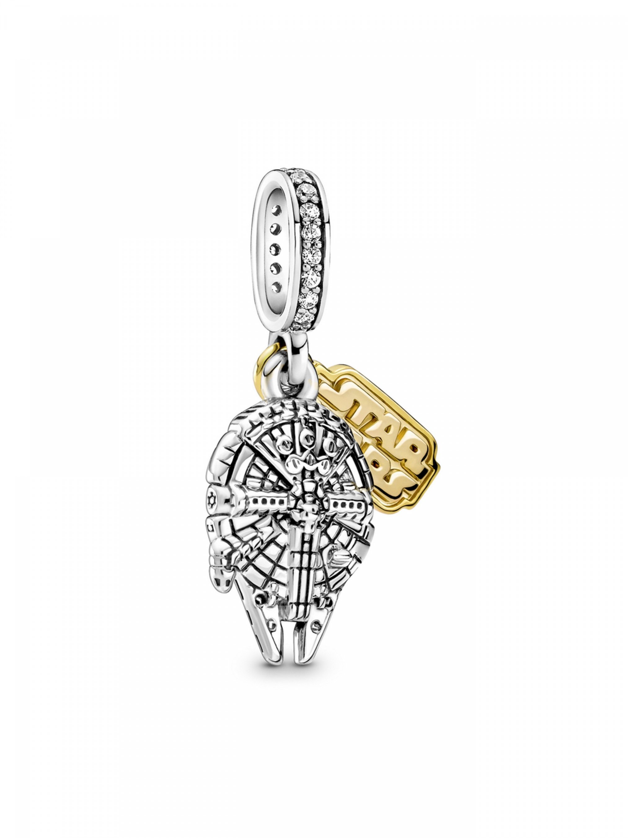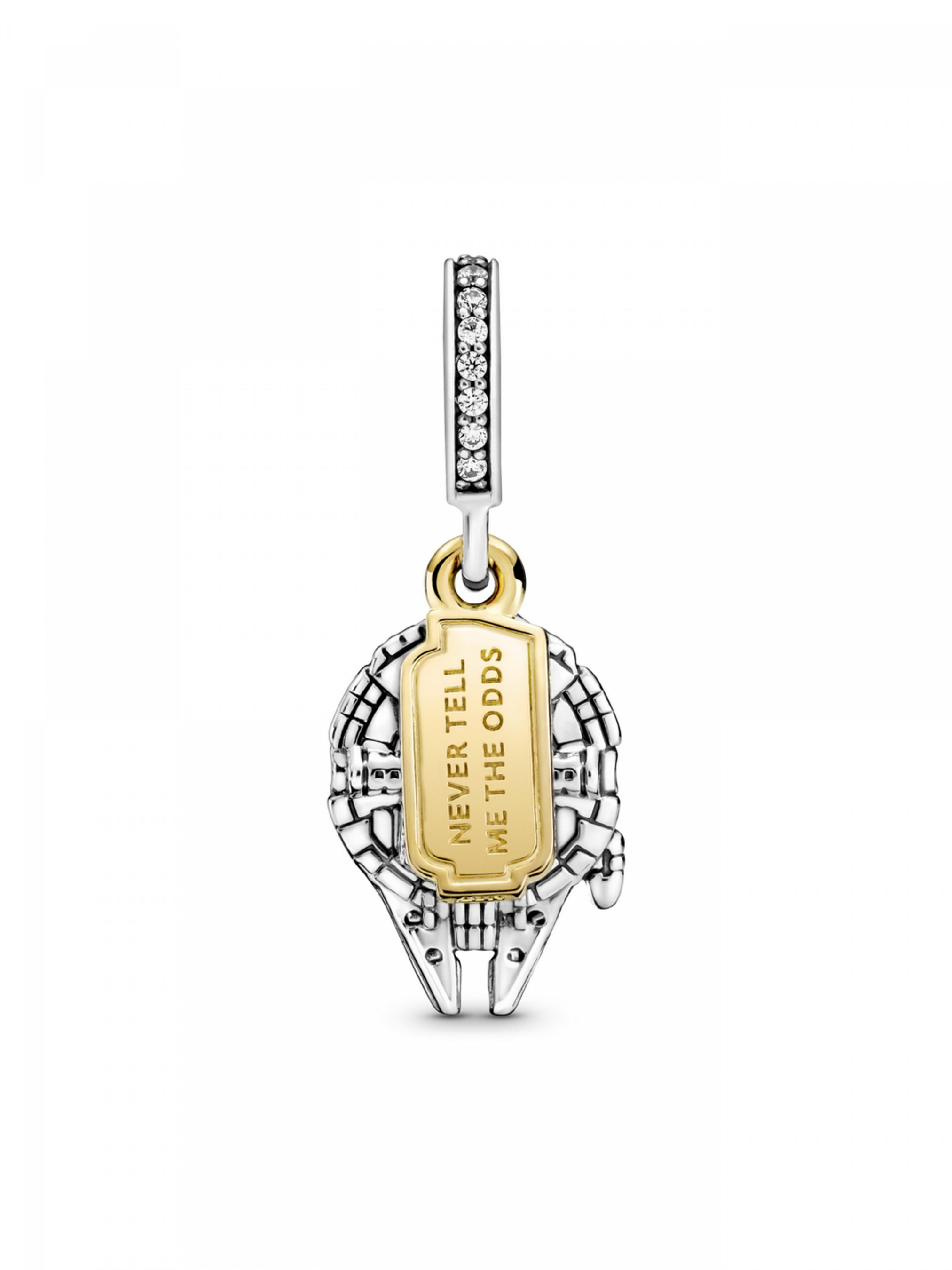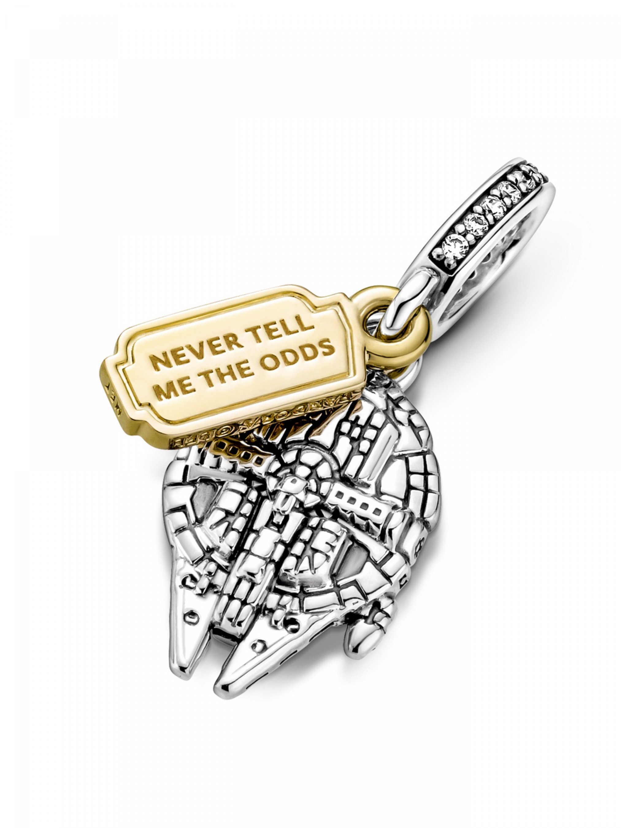 З намистиною з підвіскою "Тисячолітній сокіл" з колекції Star Wars™ Сила завжди буде з вами. Цю довершену вручну двотонову підвіску, що створена за мотивами космічної саги "Зоряні війни", виготовлено зі срібла 925-ї проби та сплаву з покриттям золотом 14k. Прикраса доповнена двома підвісками: одна підвіска містить деталізоване зображення космічного корабля "Тисячолітній сокіл", а інша — виконана у формі жетона з логотипом Зоряних воєн на одному боці та вигравійованим написом "Never tell me the odds" ("Ніколи не кажи мені про шанси") на іншому.