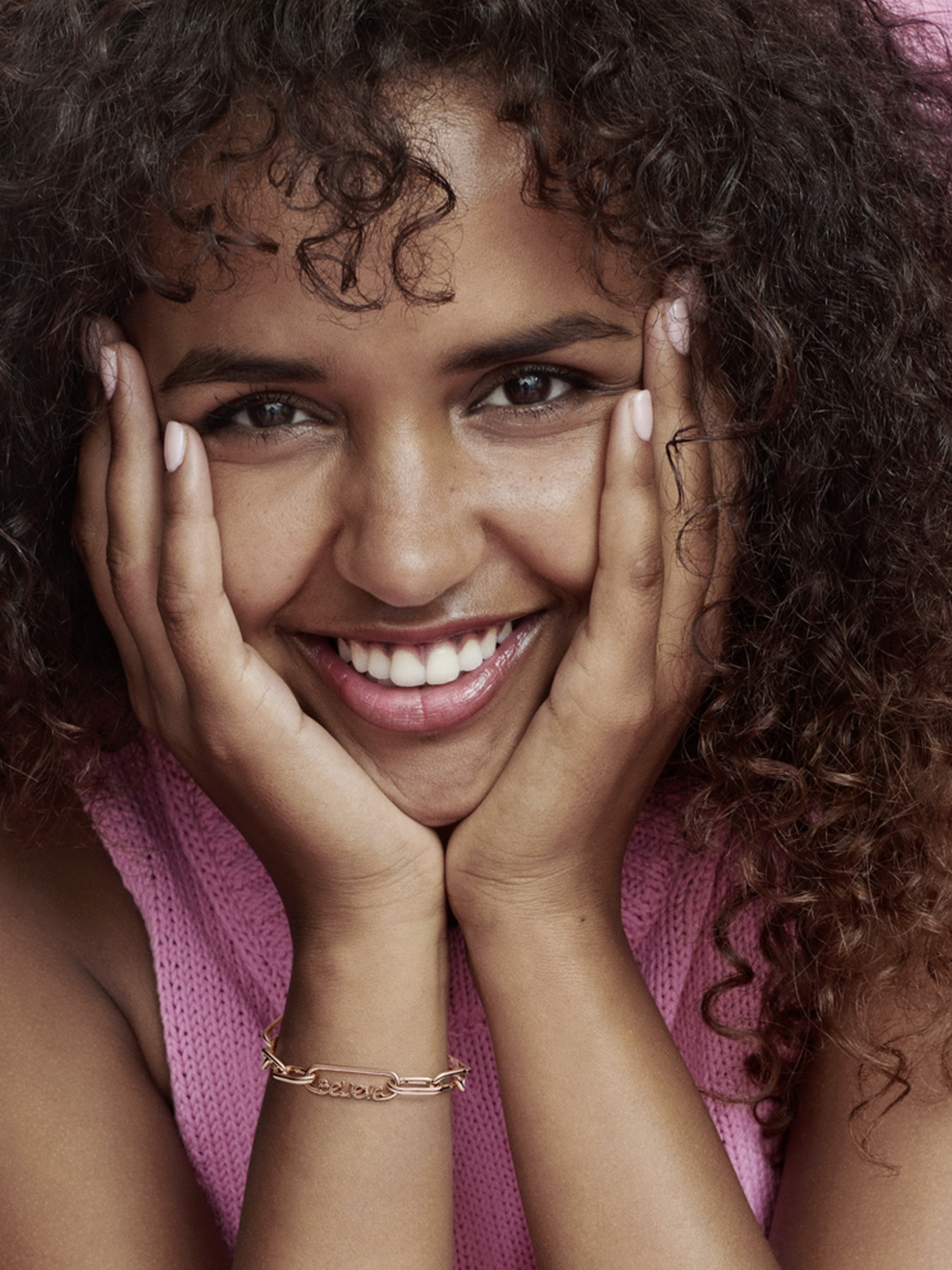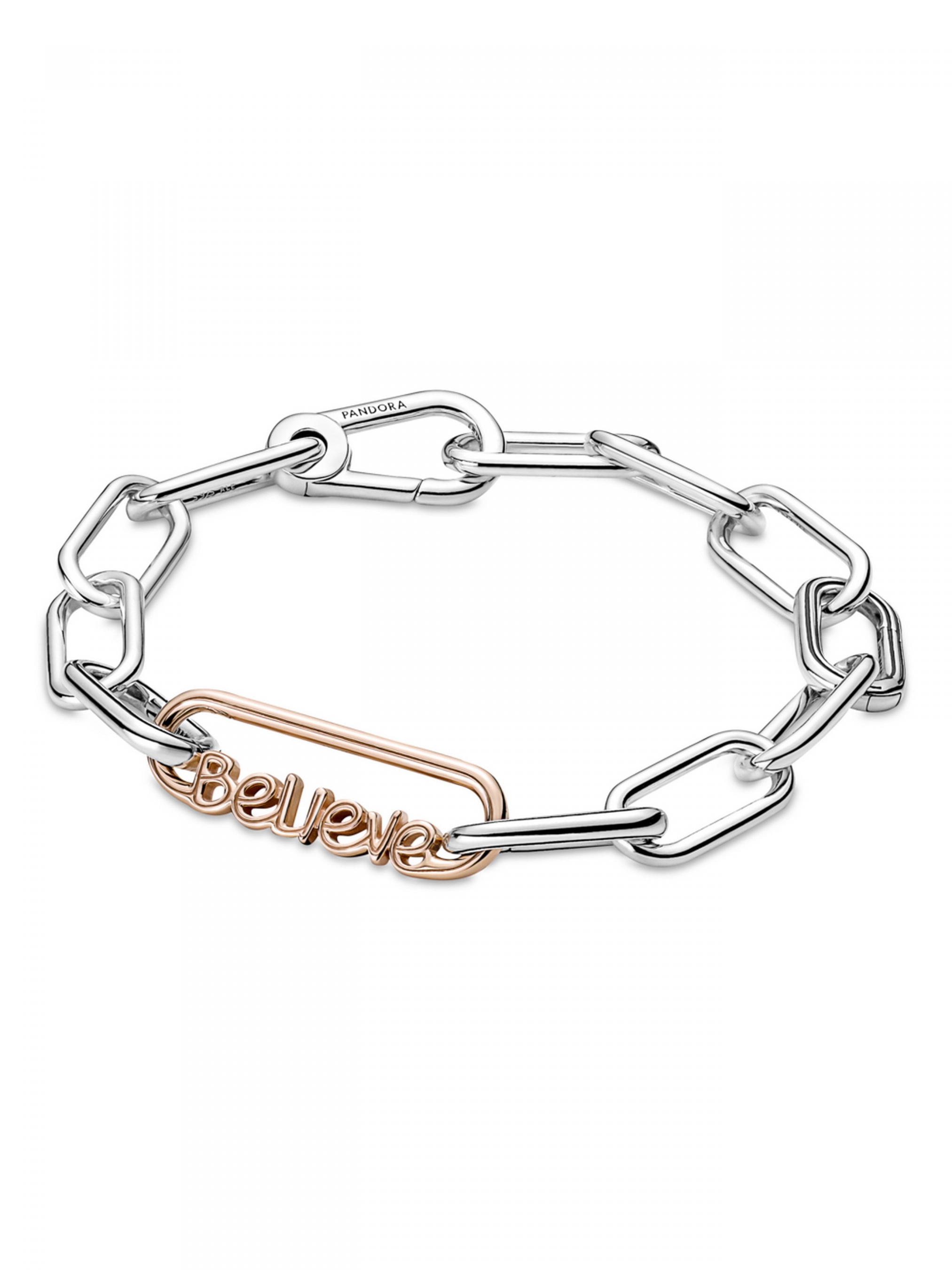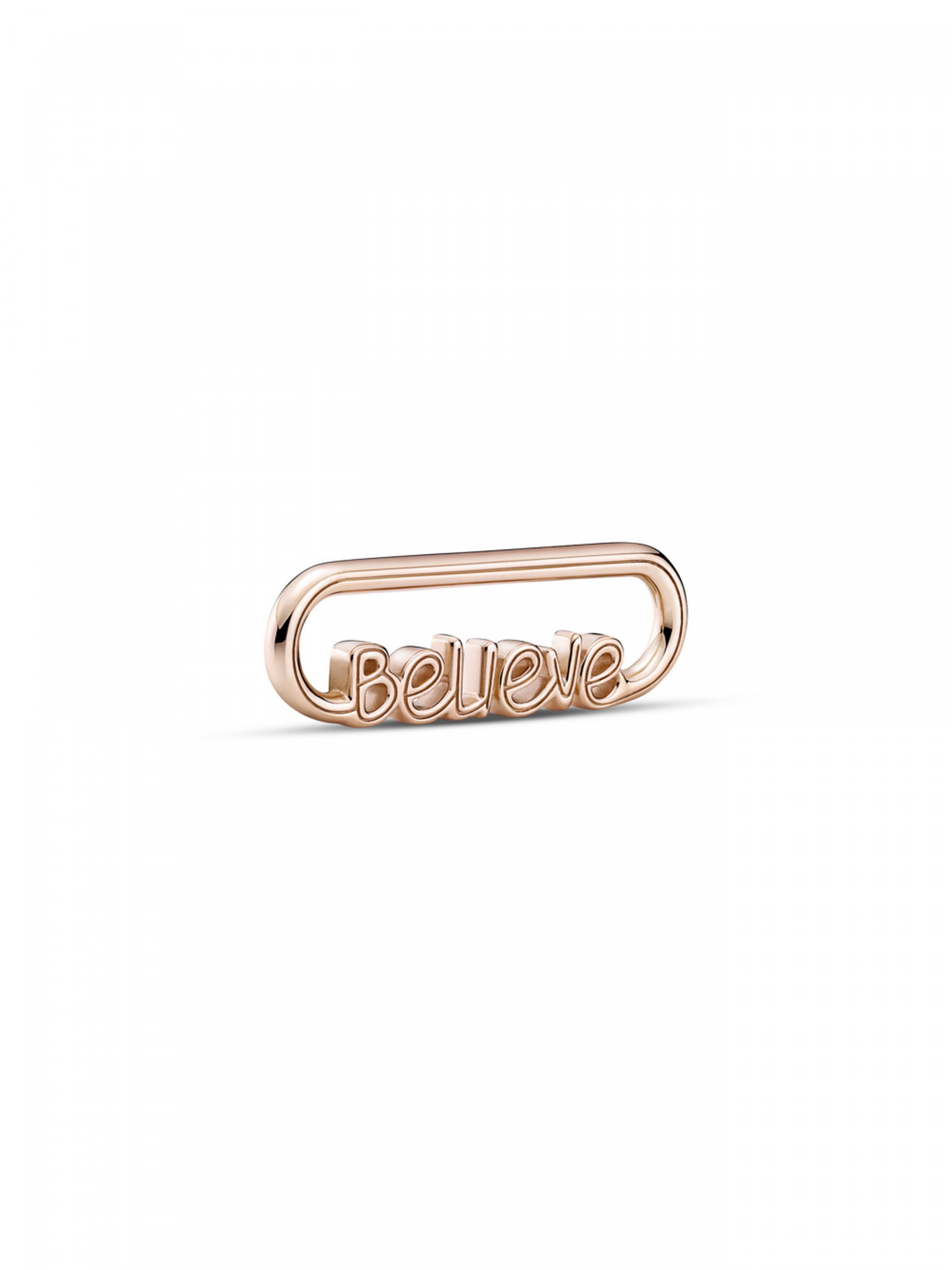 Створіть образ, що випромінюватиме позитивну енергію, доповнивши його ланкою зі словом "Believe" Pandora ME. Центральний елемент цієї довершеної вручну прикраси з покриттям рожевим золотом 14k — слово "believe" ("вір"), що наче написане рукою. Ланку можна закріпити між двома з'єднувачами для стилізації. Вона покликана нагадувати про те, що у світі немає нічого неможливого. Наповніть свій образ особливим змістом, закріпивши цю ланку на браслеті, намисті або сережках-хупах ланкового дизайну. Щоб зробити дизайн прикраси ще більш персоналізованим, доповніть її медальйоном. Стильна порада: довжина однієї ланки зі словом дорівнює довжині однієї подвійної ланки або чотирьох невеликих ланок, тож у вас будуть практично безмежні можливості для комбінацій.