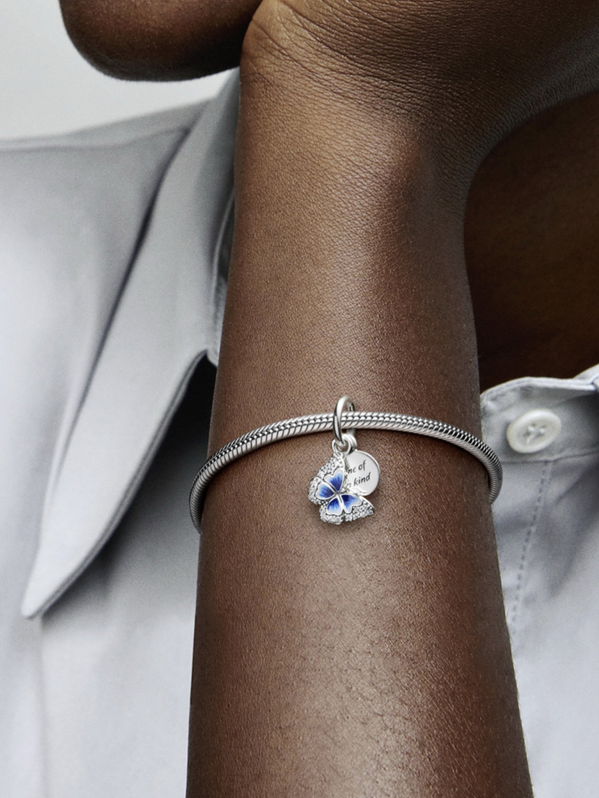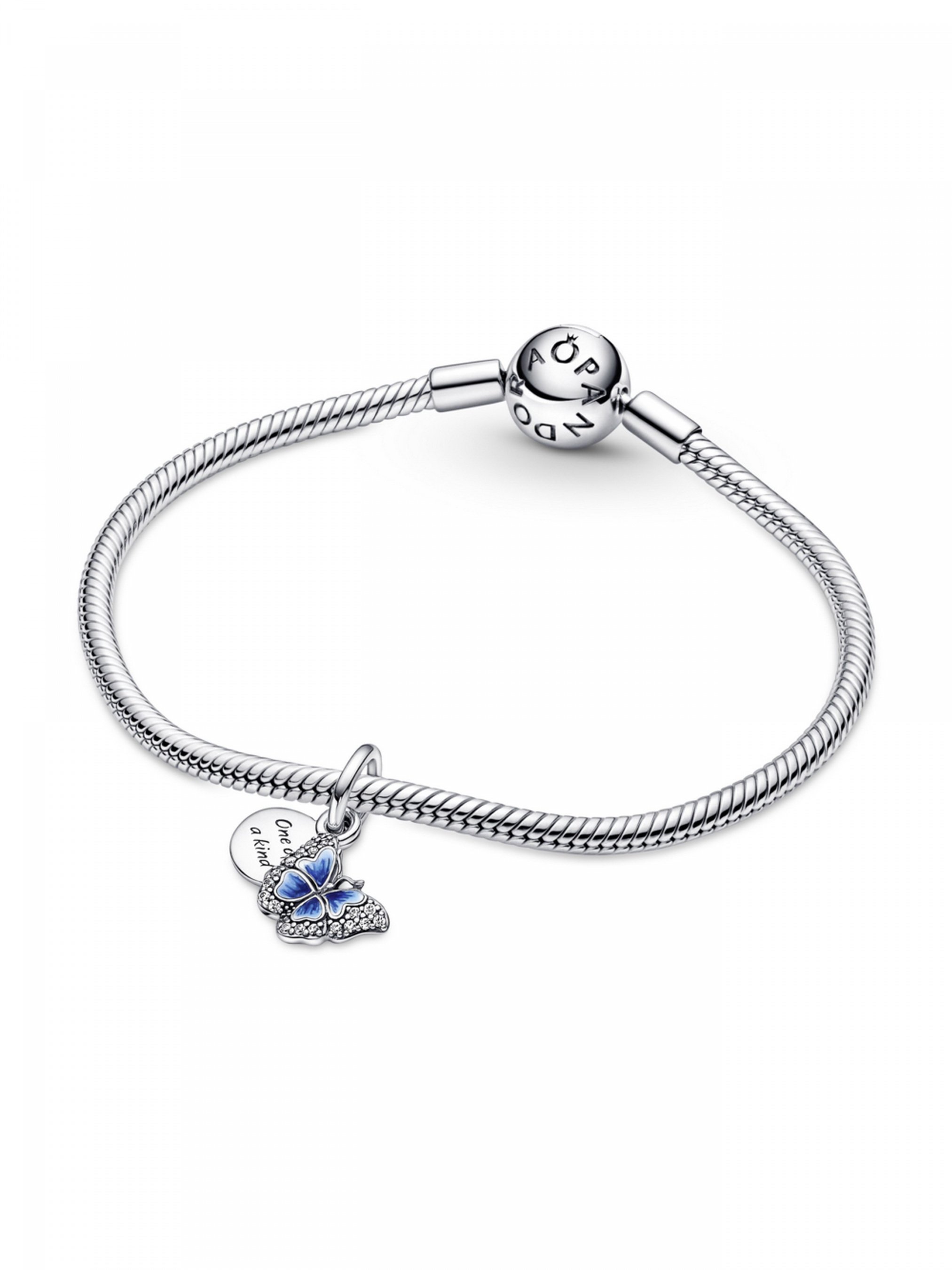 Насолоджуйтеся весняним теплом і красою природи разом із намистиною з двома підвісками "Унікальна". Намистина має дві підвіски: метелик і медальйон. Крила метелика інкрустовано прозорими камінцями кубічного оксиду цирконію діамантового огранювання та вручну розфарбовано блакитною емаллю. Медальйон зі срібла 925-ї проби прикрашено гравіюванням "One of a kind" ("Унікальна"). У природі не існує двох однакових метеликів. Тому кожна з наших намистин теж унікальна. Поєднайте цю прикрасу із сережками-метеликами аналогічного дизайну, щоб створити неповторний весняний образ.