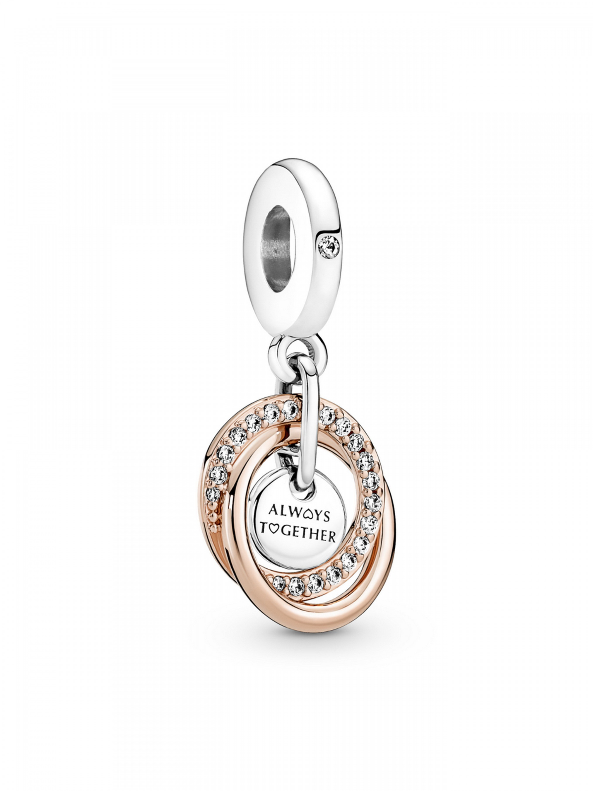 Намистина з підвіскою у кільцях "Сім'я завжди" — потужний символ незламної любові. Прикраса містить два переплетених між собою кільця з покриттям рожевим золотом 14k, одне з яких інкрустовано прозорими камінцями кубічного оксиду цирконію. Всередині кілець міститься срібний жетон, що закріплений на дужці та доповнений вигравійованим написом "ALWAYS TOGETHER" ("ЗАВЖДИ РАЗОМ"). Гармонія форм і кольорів металів у цій намистині символізує собою родину: ми разом, хоча й різні.