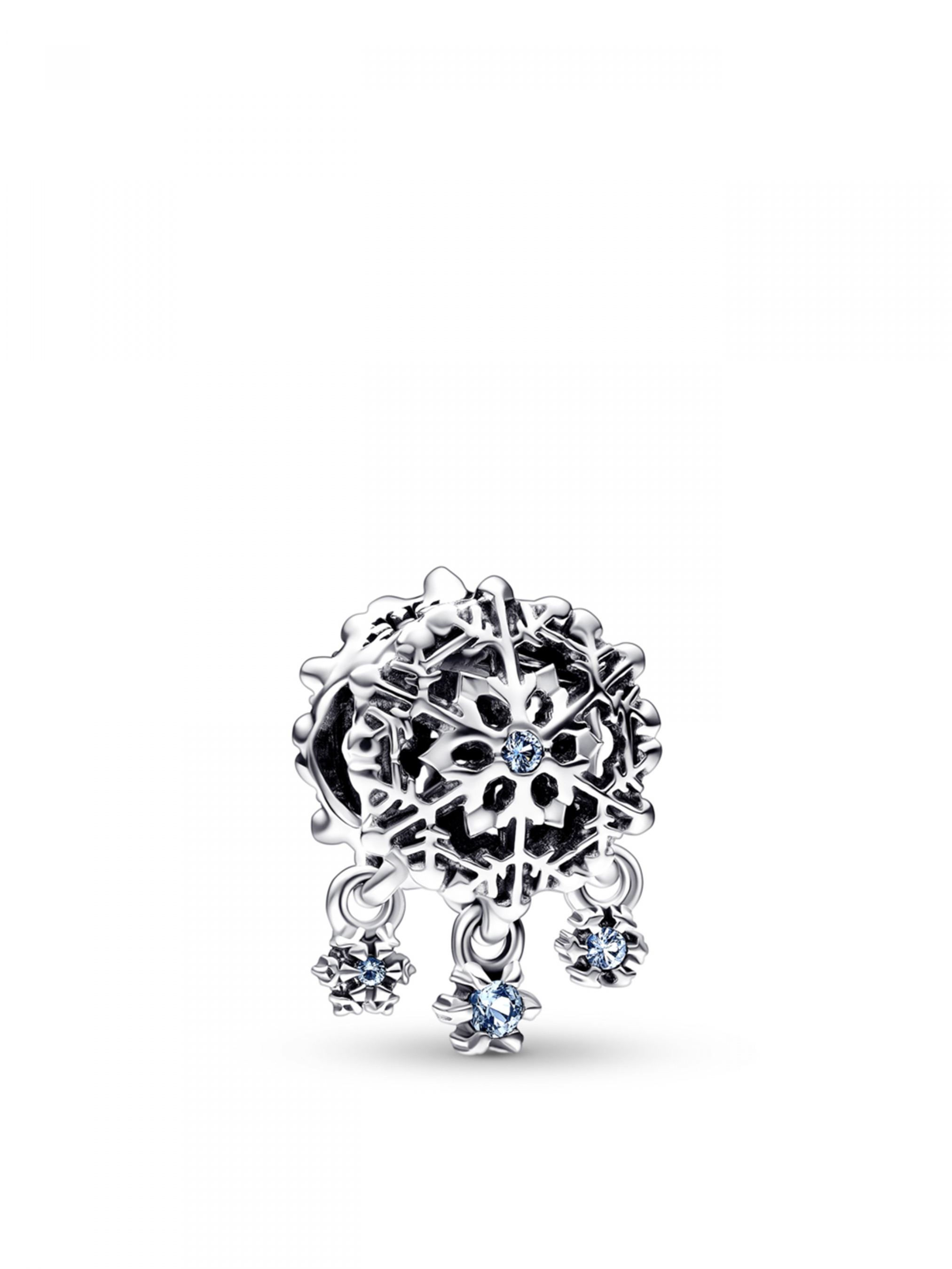 Ця довершена вручну намистина "Крижана сніжинка" зі срібла 925-ї проби вшановує красу й унікальність природи. Намистина зображує філігранну вирізьблену сніжинку, що оздоблена штучним кристалом блідо-блакитного кольору на кожному боці та вирізьбленими сніжинками на бокових гранях. Прикрасу доповнено трьома підвісками-сніжинками меншого розміру, кожна з яких вирізняється унікальним дизайном й оздоблена штучним кристалом. Завдяки рухливому кріпленню, сніжинки неначе танцюють у морозному зимовому повітрі. Носіть цю прикрасу як нагадування про унікальність кожного з нас.