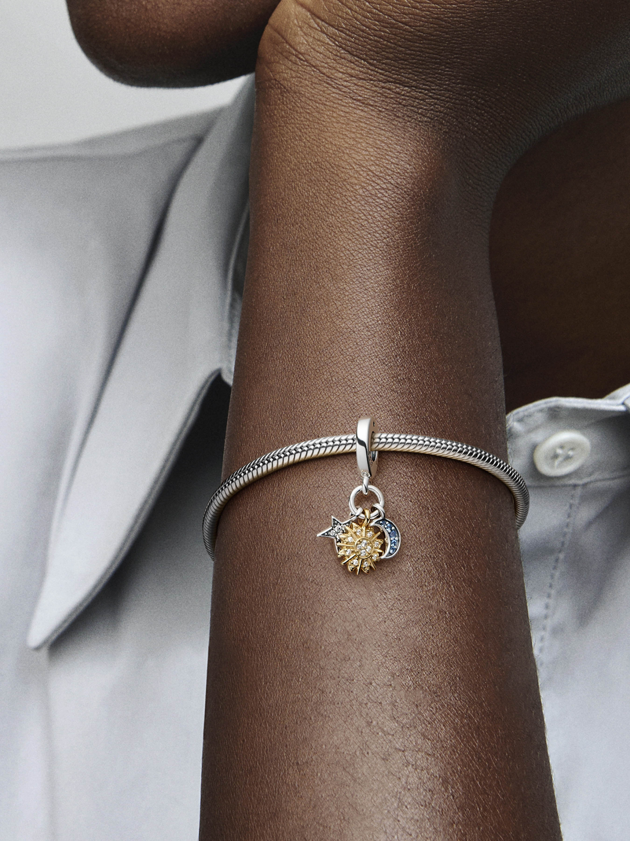 Додайте своєму образові небесної магії за допомогою двоколірної намистини з трьома підвісками "Небо". Ця намистина поєднує три небесні символи: сонце, вкрите золотом 14к та інкрустоване блискучими камінцями та мікрокульками, зірку зі срібла 925-ї проби з pavé з прозорих камінців і півмісяць зі срібла 925-ї проби, усипаний блакитними камінцями. Носіть цю прикрасу як символ рівноваги та гармонії в космічному танці Всесвіту й у вашому серці.
