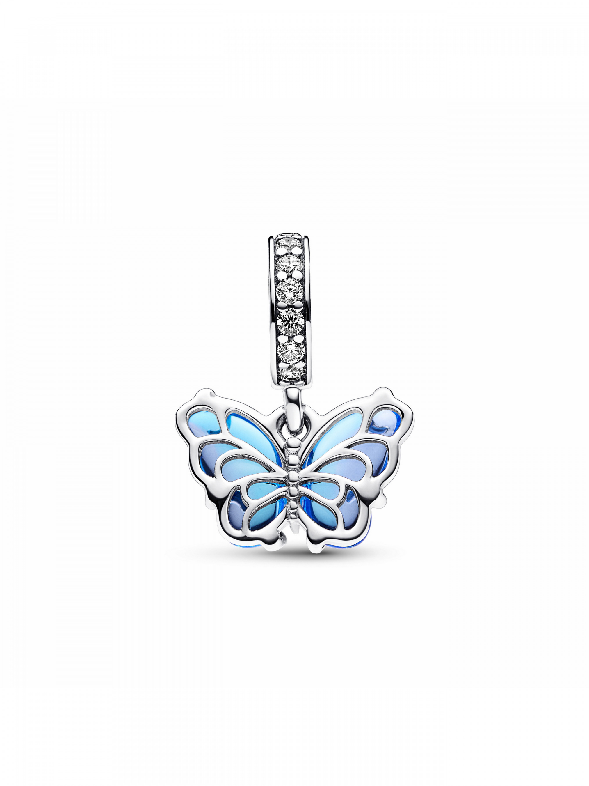 Створіть новий образ із намистиною "Метелик", що доповнена підвіскою з блакитного муранського скла. Цю довершену вручну намистину зі срібла 925-ї проби прикрашає метелик з градієнтного муранського скла блакитного кольору. На зворотному боці прикраси міститься вирізьблений срібний орнамент, що видніється крізь скло. Лицьовий бік намистини оздоблено завитками зі срібла 925-ї проби. Тіло метелика прикрашено мікрокульками, а дужка — паве, що додає прикрасі витонченості та сяйва. Додайте цього блакитного метелика до своєї колекції як потужний символ надії, трансформації та нового начала.