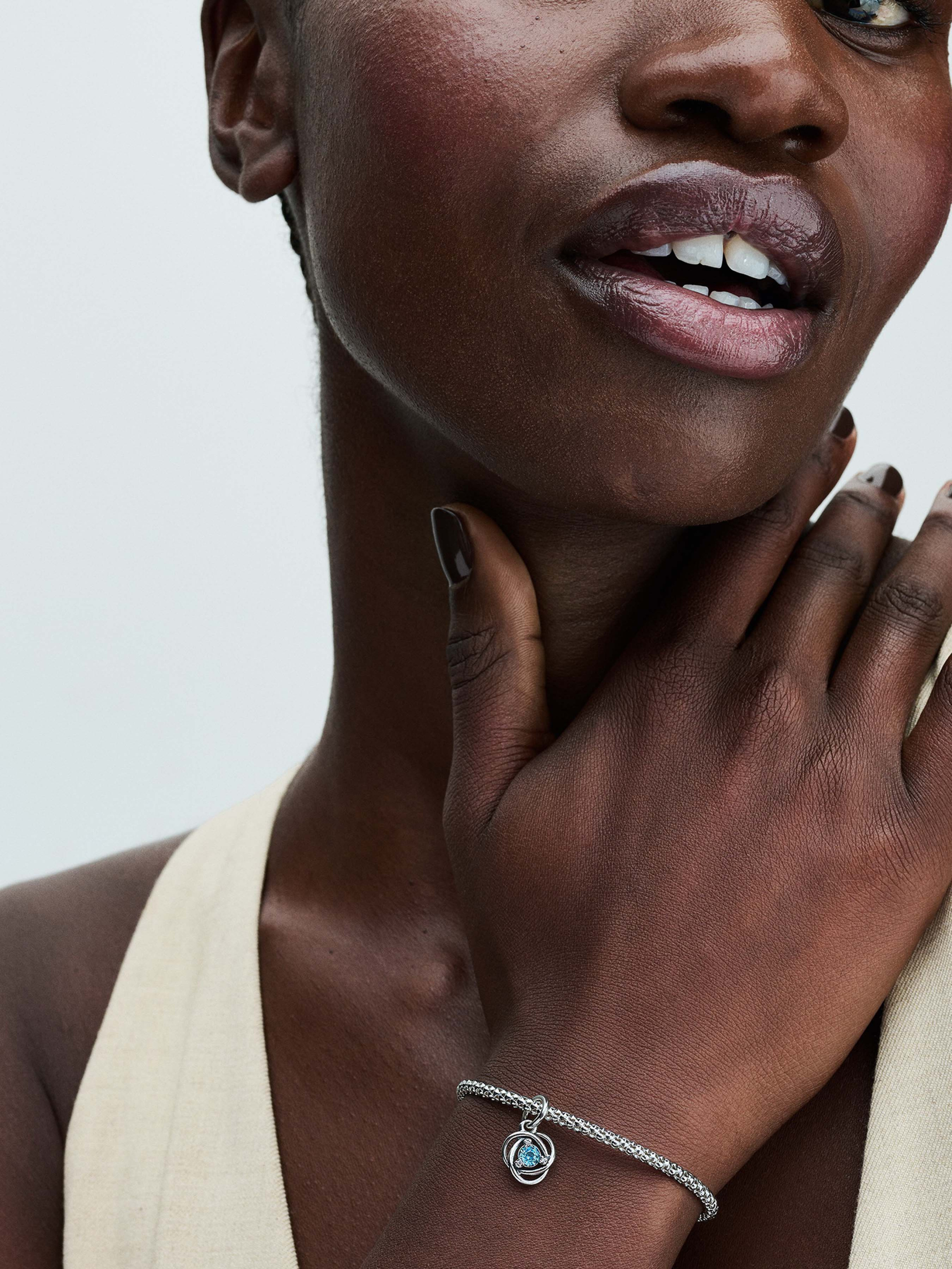 Ця деталізована намистина "Аквамаринове коло вічності" неодмінно має бути у вашій колекції Pandora Moments. Виготовлена зі срібла 925-ї проби, вона має ажурне плетіння у формі нескінченності. Центральним елементом намистини є вишуканий штучний кристал блакитного кольору, який елегантно доповнений трьома прозорими камінцями кубічного оксиду цирконію. Деталізований дизайн символізує вічність і додає виробу додаткового сенсу. Доповніть свій браслет цією намистиною або подаруйте її як символ нескінченності та непереривного зв'язку.