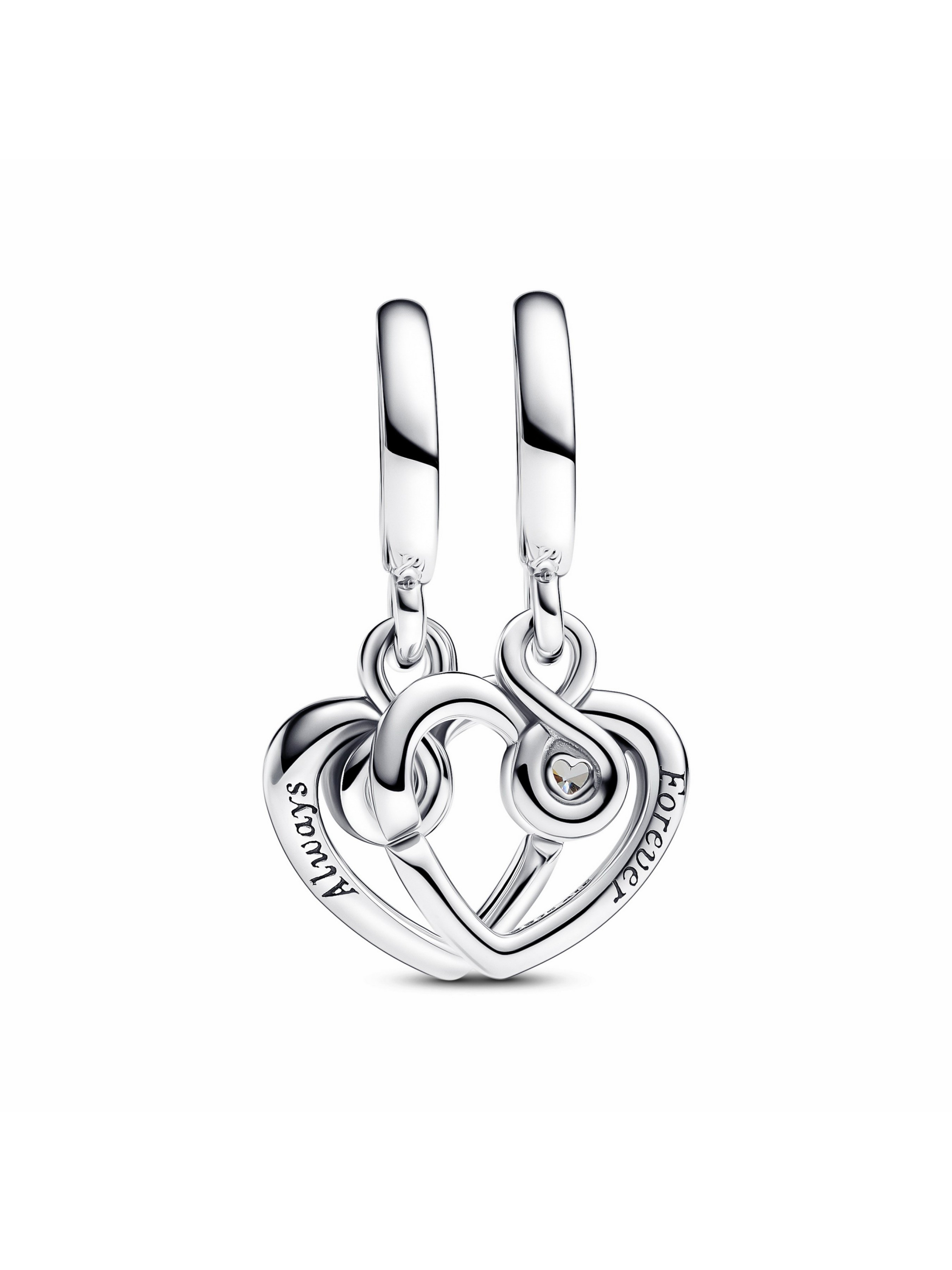 Бережіть міцні почуття з нашою намистиною "Завжди і назавжди". Особливий виріб виготовлено зі срібла 925-ї проби. Два серця ніжно переплітаються та утворюють тендітну форму, яка огортає прозорі камінці кубічного оксиду цирконію. Вигравіювані слова "Always" ("Завжди") та "Forever" ("Назавжди") символізують щире та вічне кохання. Складний дизайн має форму серця з вирізом, який дозволяє з'єднати дві частини намистини разом, щоб символізувати міцні почуття. Подаруйте одну половинку комусь особливому у вашому житті, як знак нерозривних зв'язків.