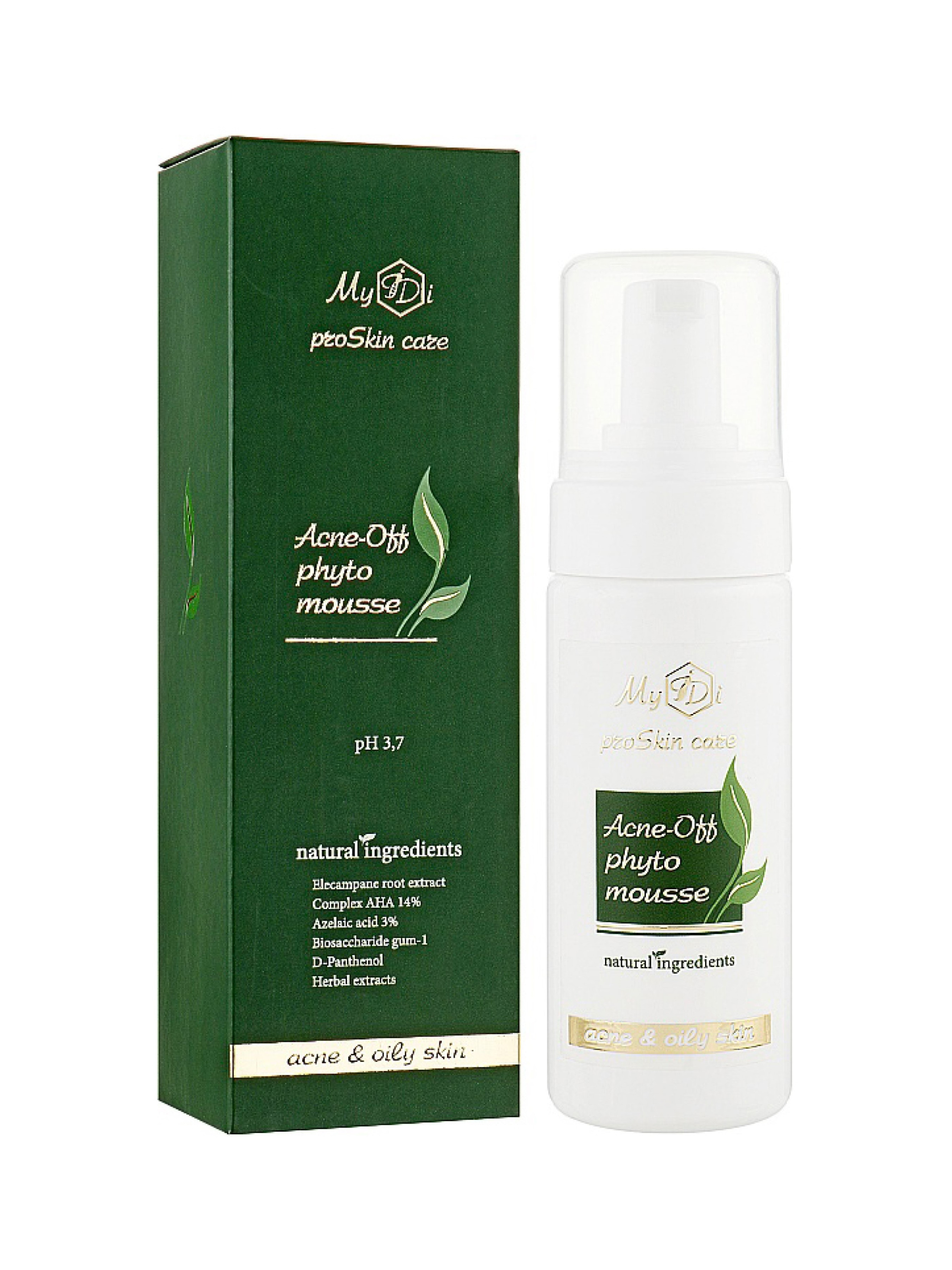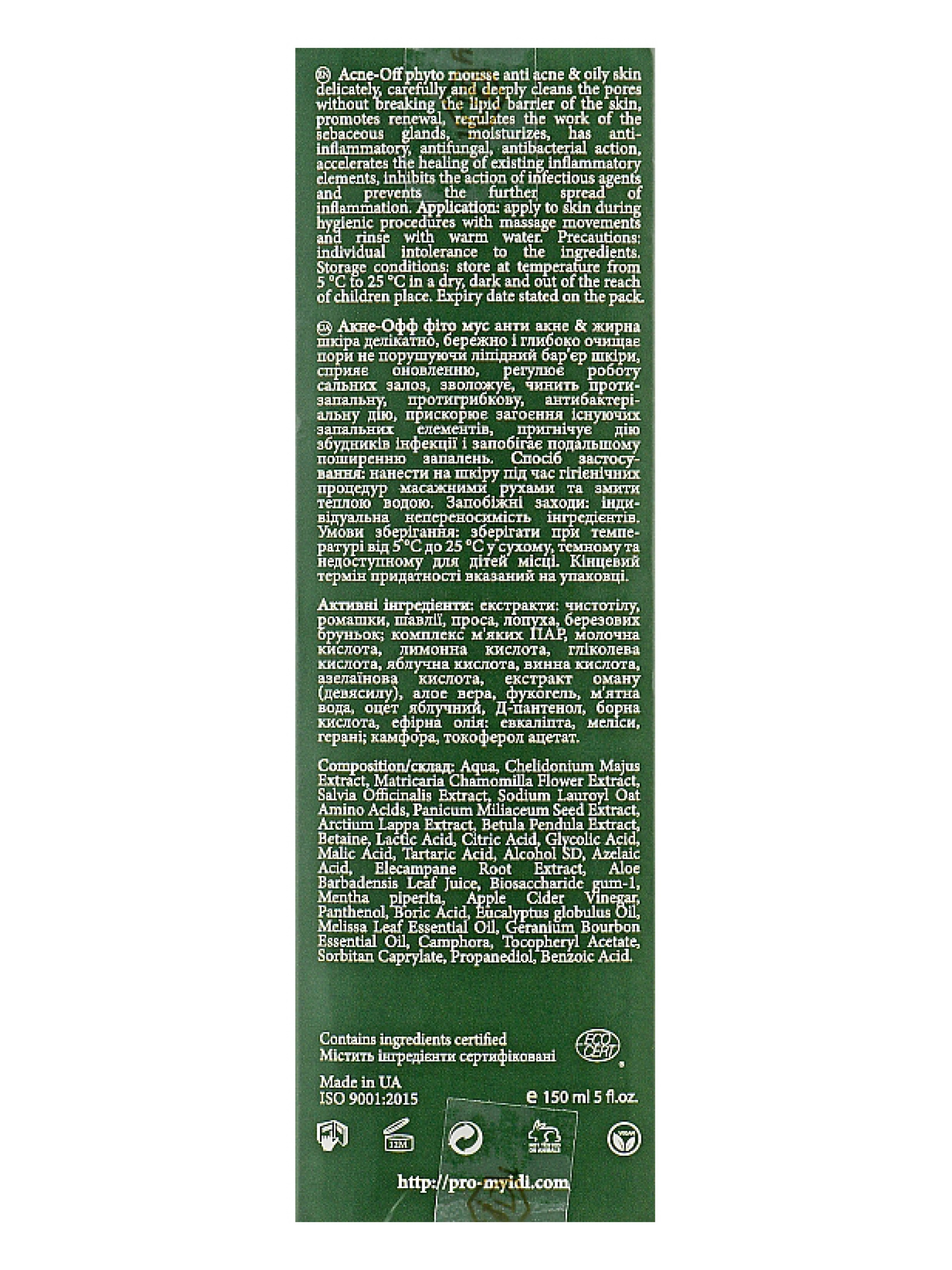 Acne-off phyto mouse розроблений з урахуванням фізіологічних особливостей проблемної шкіри. Мус містить екстракт чистотілу, березових бруньок і оману, які забезпечують антисептичні, протигрибкові та протизапальні властивості мусу, а також ефективно нормалізують роботу сальних залоз. Азелаїнова кислота в складі мусу посилює антибактеріальний ефект і володіє захисним дією. Вона допомагає боротися з акне і висипом вугрів, ущільнюючи його верхній шар епідермісу. Комплекс гліколевої, яблучної, молочної кислот покращують обмін речовин в клітинах шкіри, ці кислоти стимулюють вироблення колагену і вирівнюють рельєф шкіри. Acne-off phyto mouse також інтенсивно зволожує шкіру завдяки екстрактам ромашки, фукогелю і алое віра, що заспокоює наявні запалення і повертає тонус вашої шкіри.
